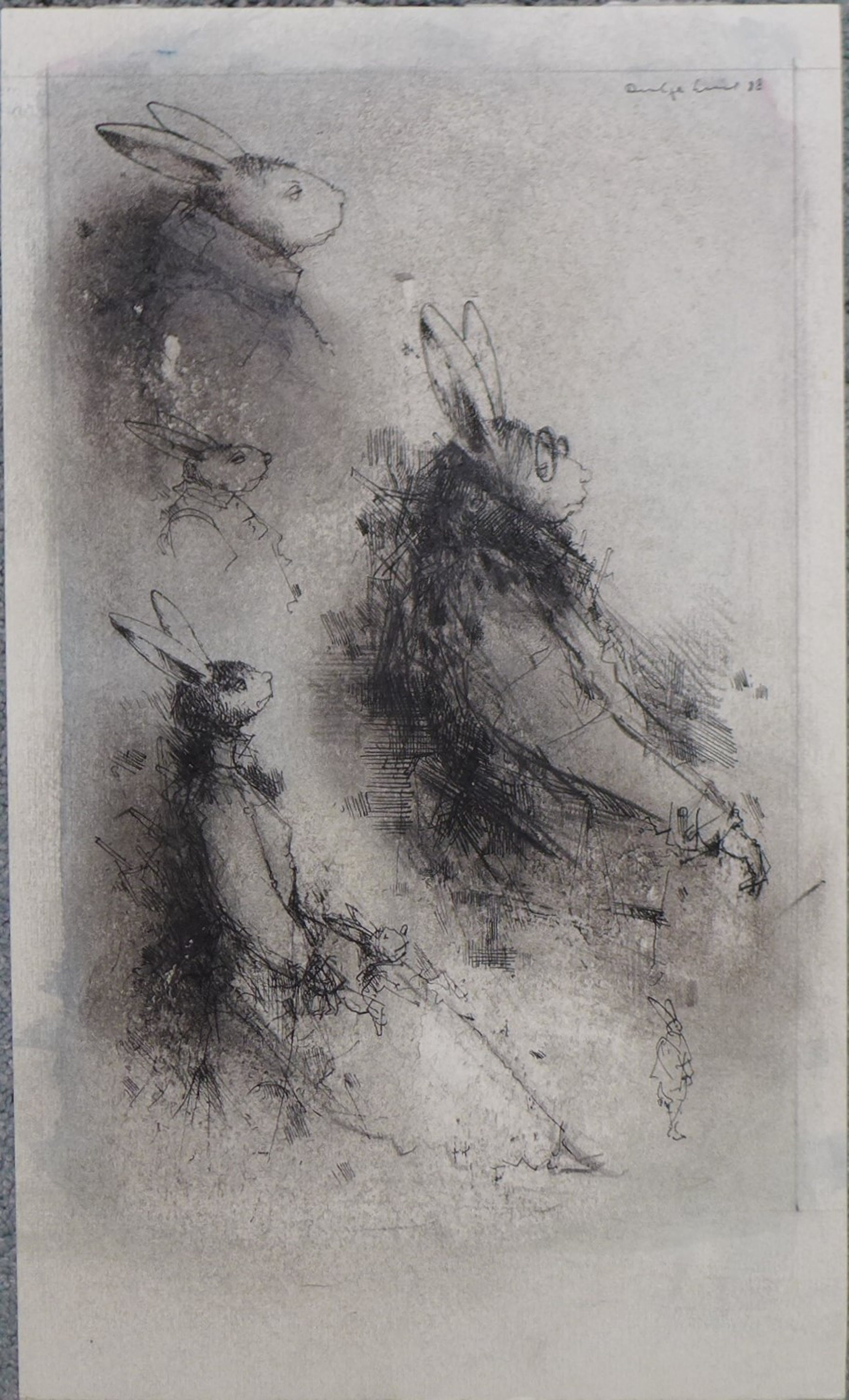 Dirkje Kuik, tekening, konijnen, formaat 34 x 20 cm. niet eerder ingelijst geweest.