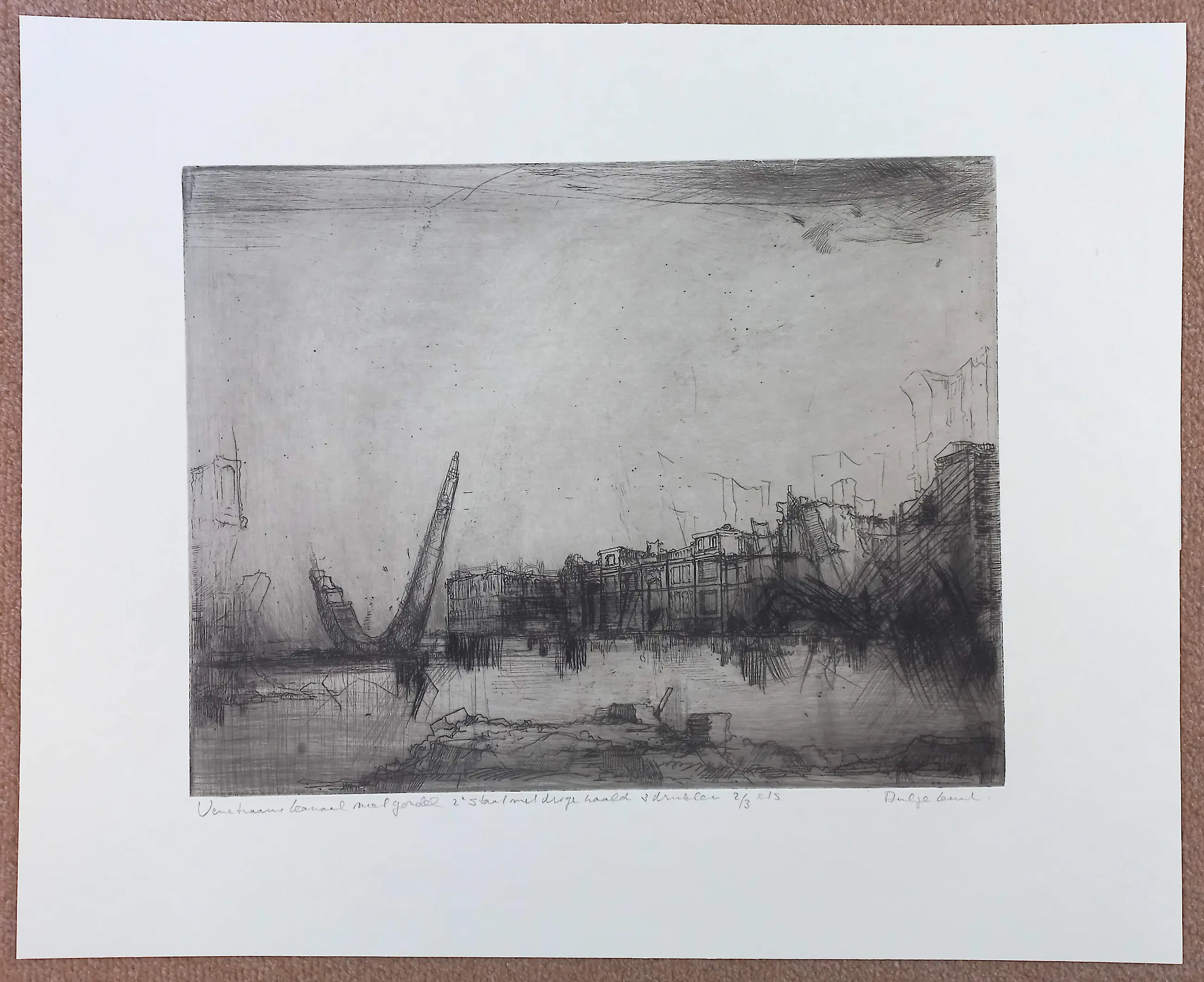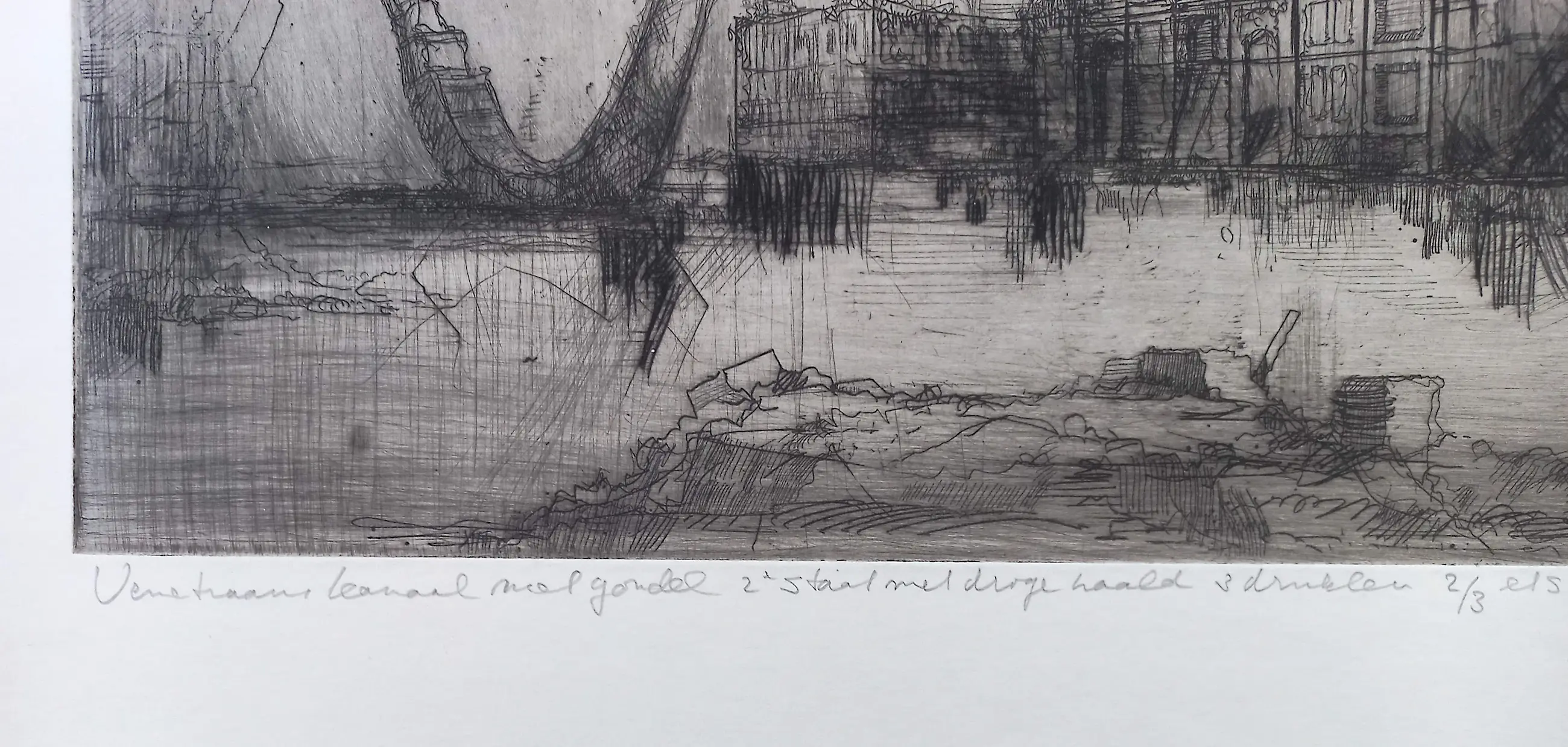 Karakteristiek Venetiaans stadsgezicht van Dirkje Kuik. Ets op geschept papier, met potlood gesigneerd, getiteld en genummerd (2/3)? In uitstekende conditie.