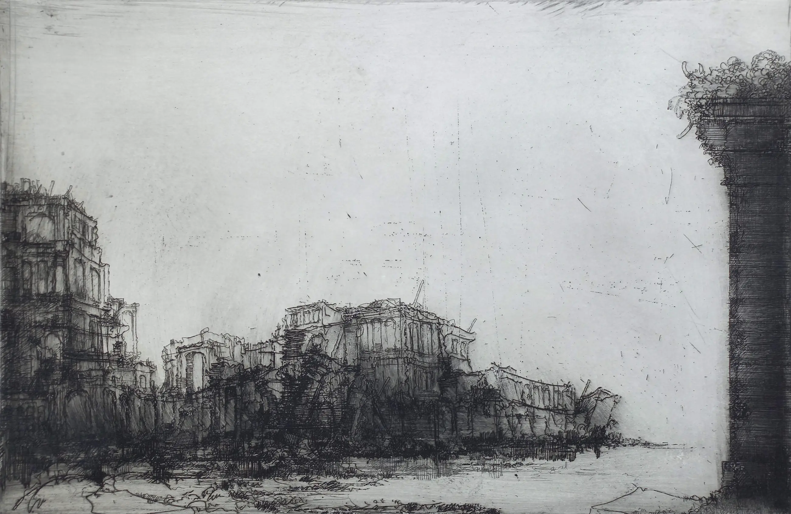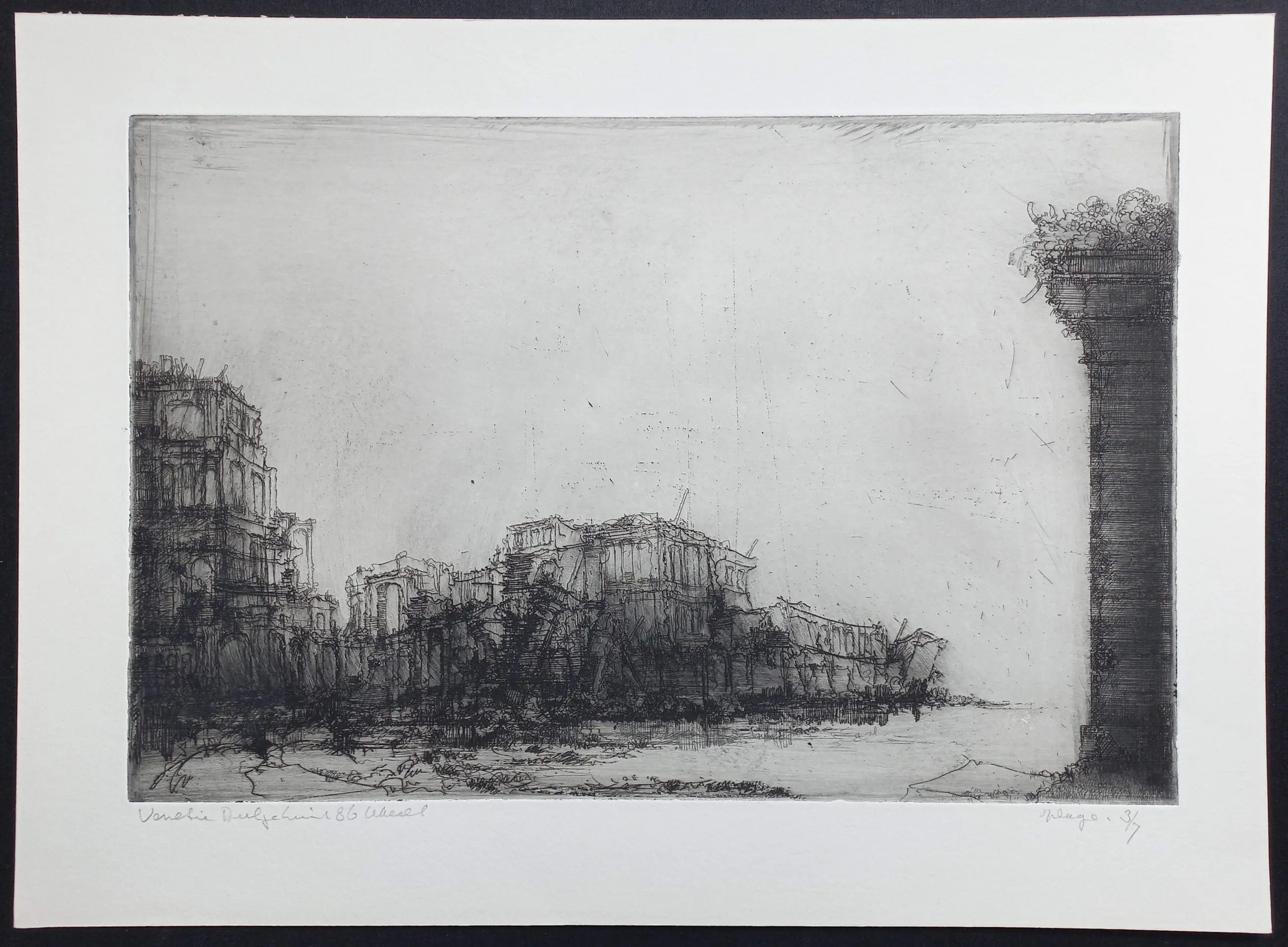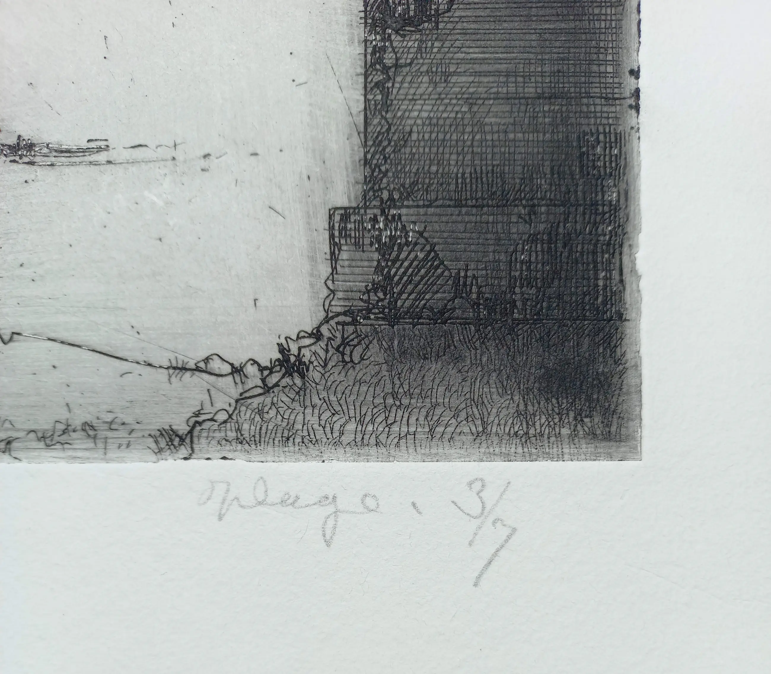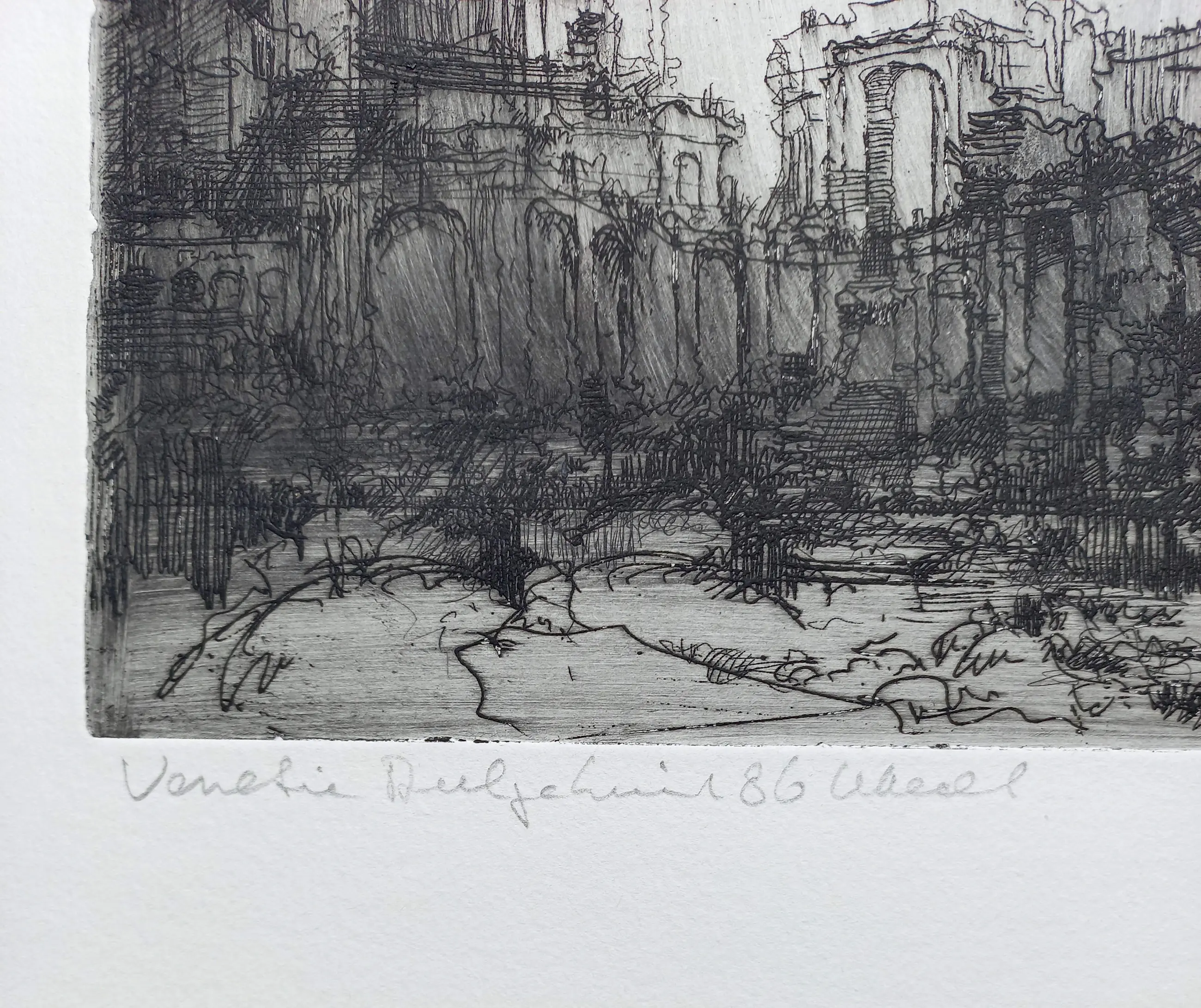 Prachtig, duister stadgezicht van Venetië door Dirkje Kuik. Ets op geschept papier, met potlood gesigneerd, getiteld, gedateerd (‘86) en genummerd (3/7). In uitstekende conditie.