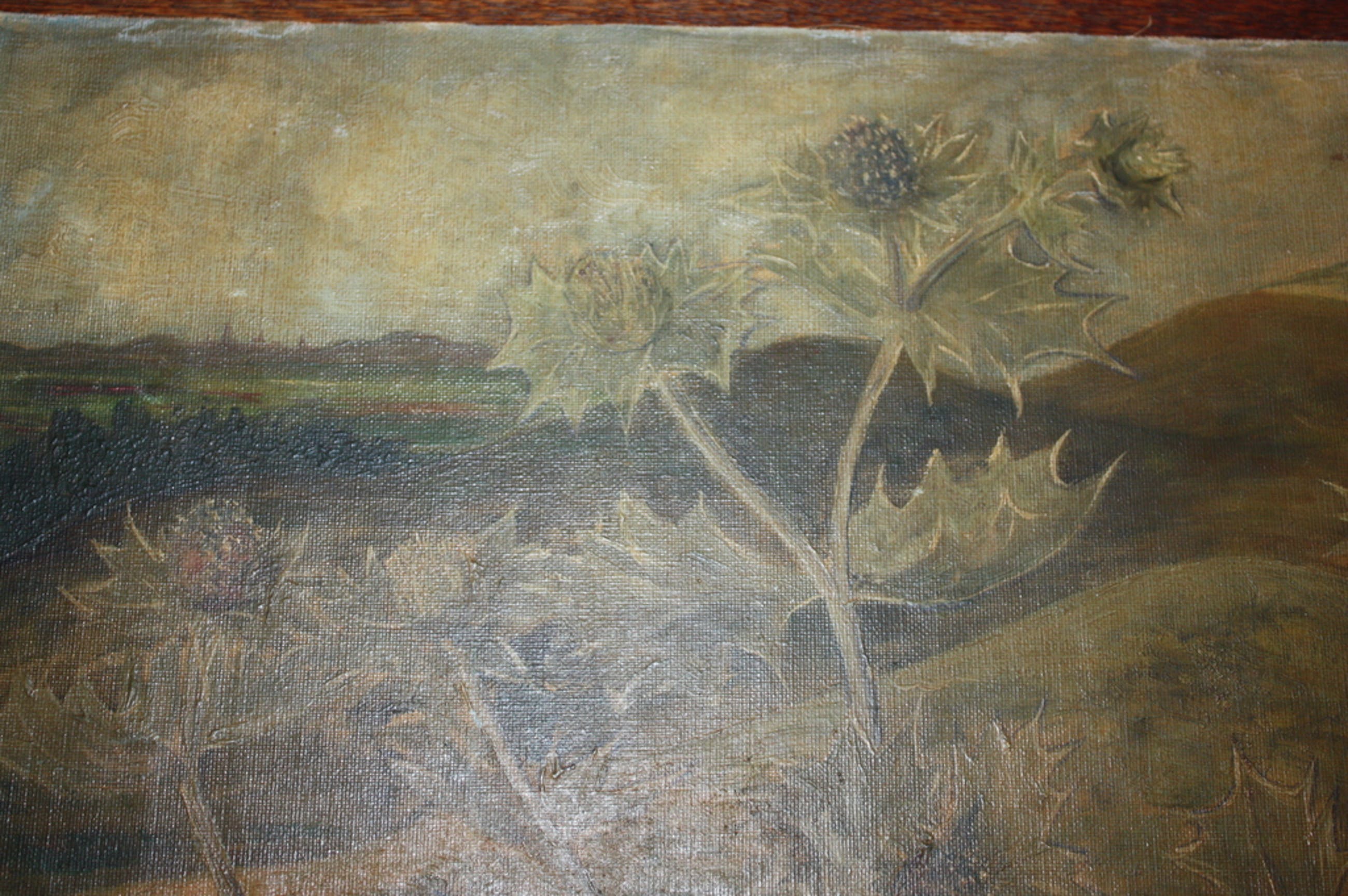 Doet mij denken aan van Gogh, gele kleuren lelijke distel, op achergrond dorpje zichtbaar