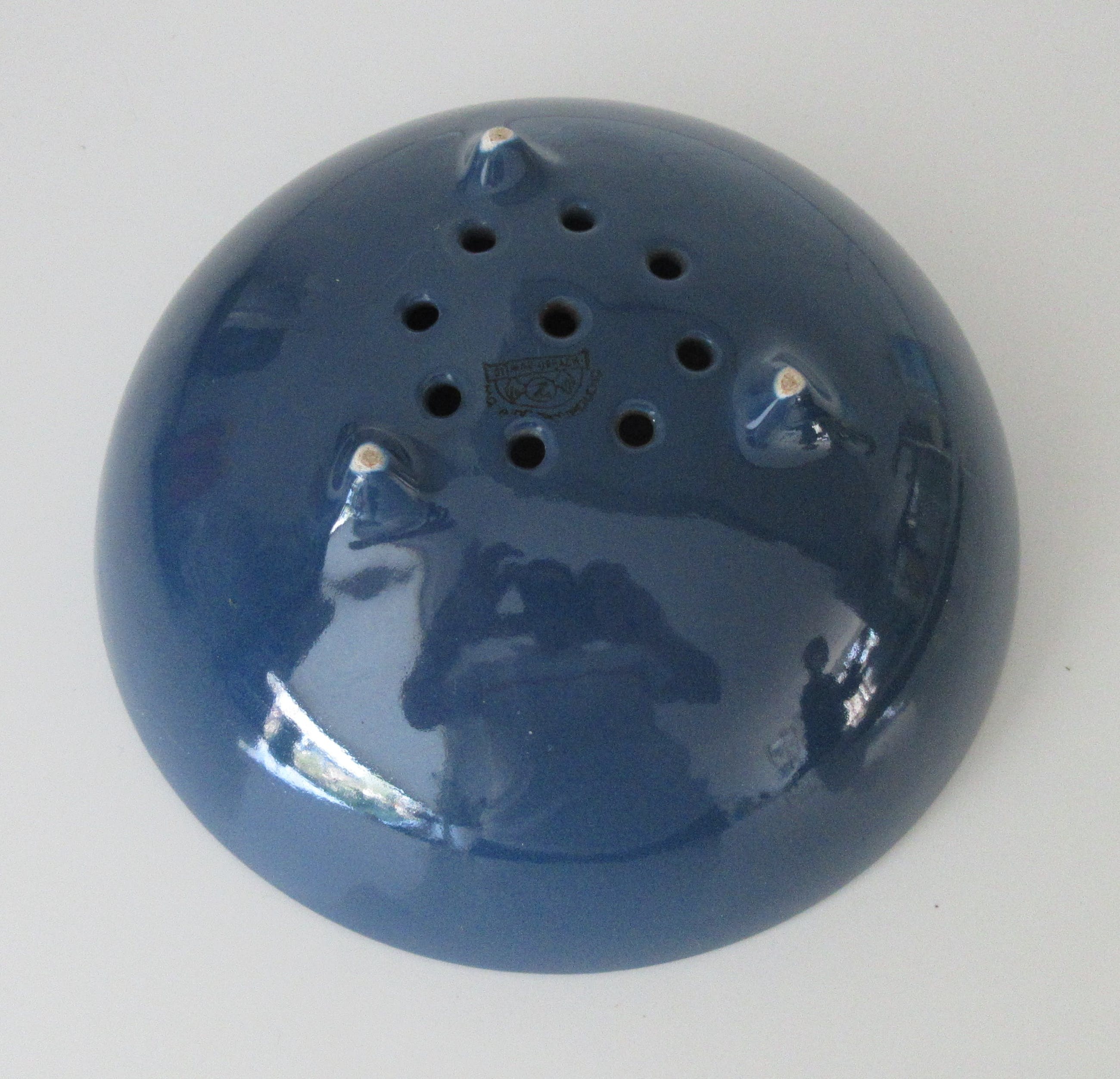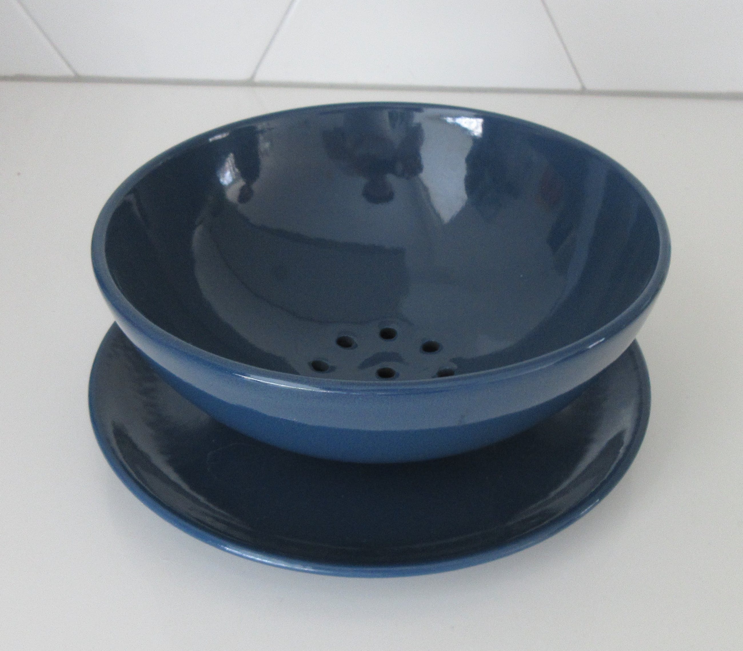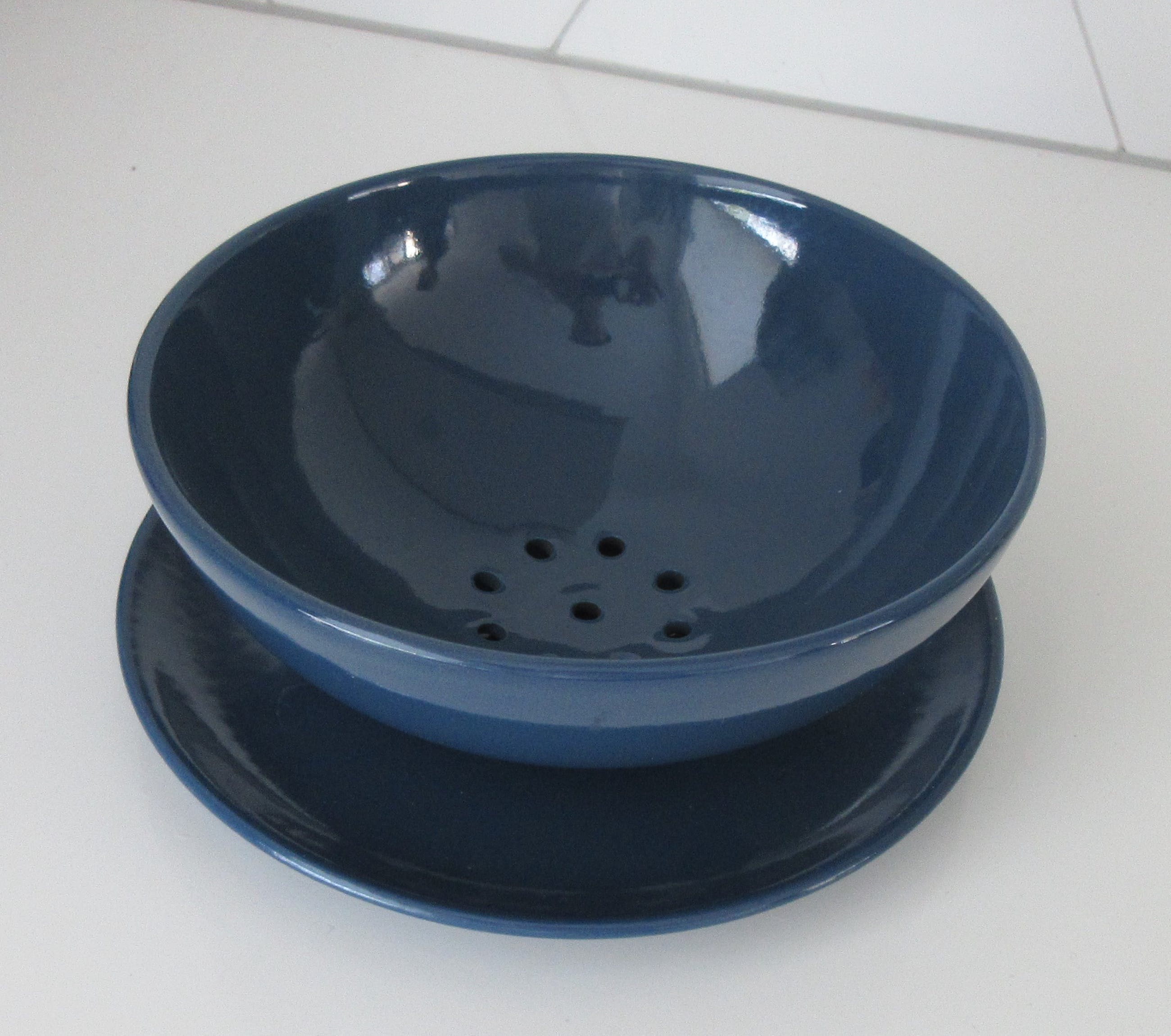 Art deco donkerblauwe aardewerken fruittest met onderbord van Ditmar Urbach uit Tsjechie. Het donkerblauw is erg chique. In vrijwel nieuw staat en relatief zeldzaam. Zowel het bord als de fruittest zijn gemerkt aan de onderzijde. Het onderbord is 19,5 cm in diameter.
