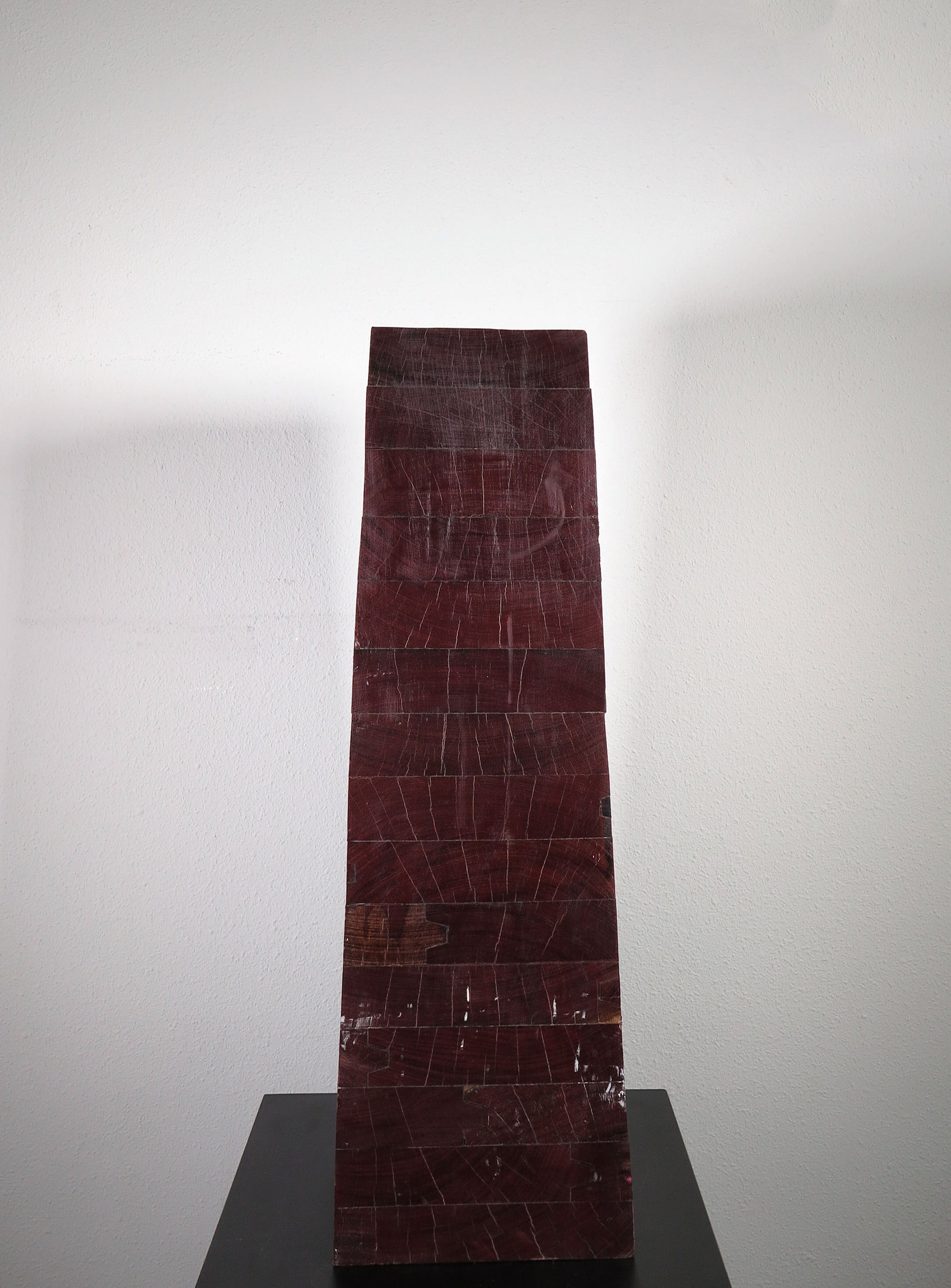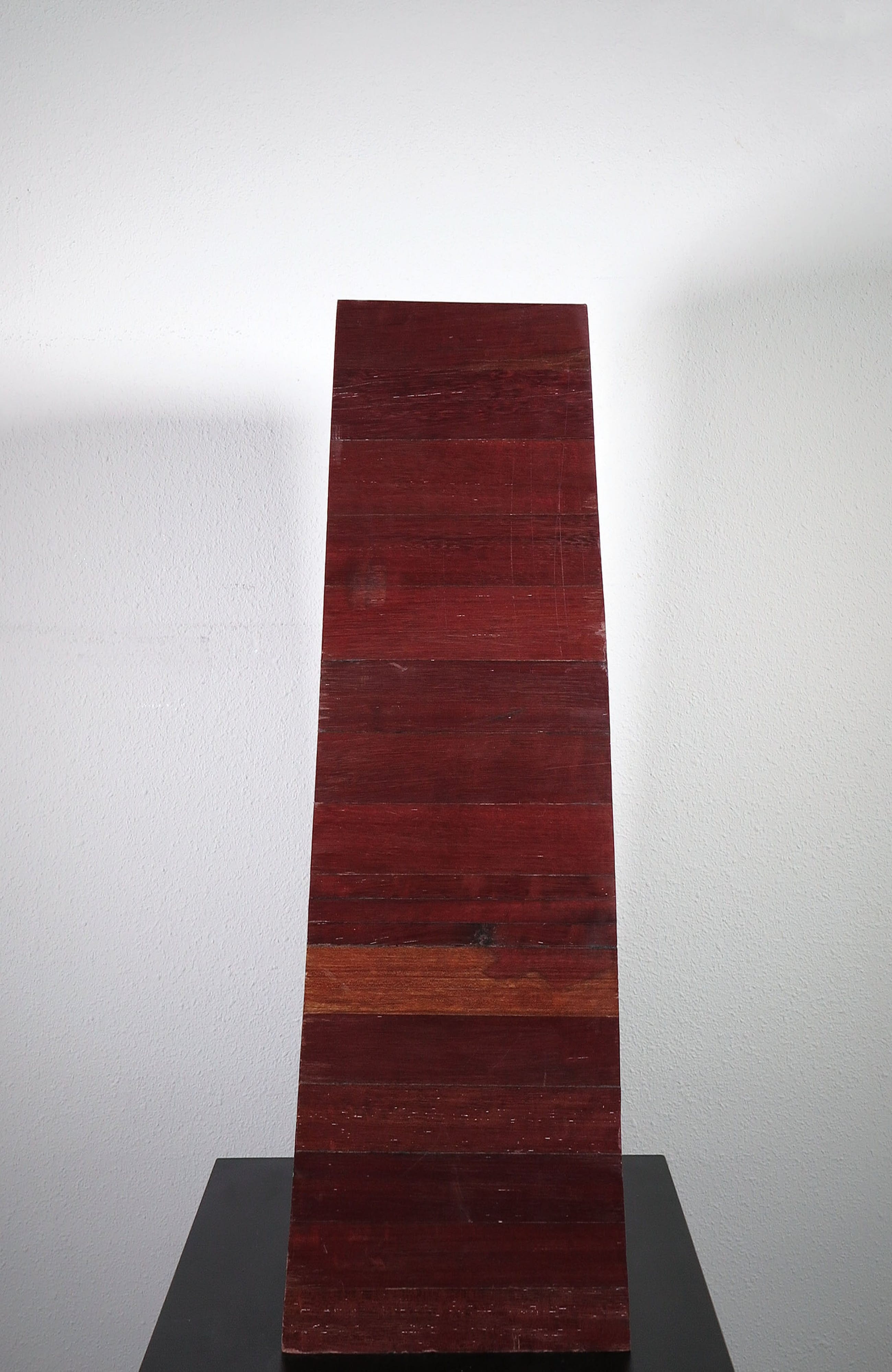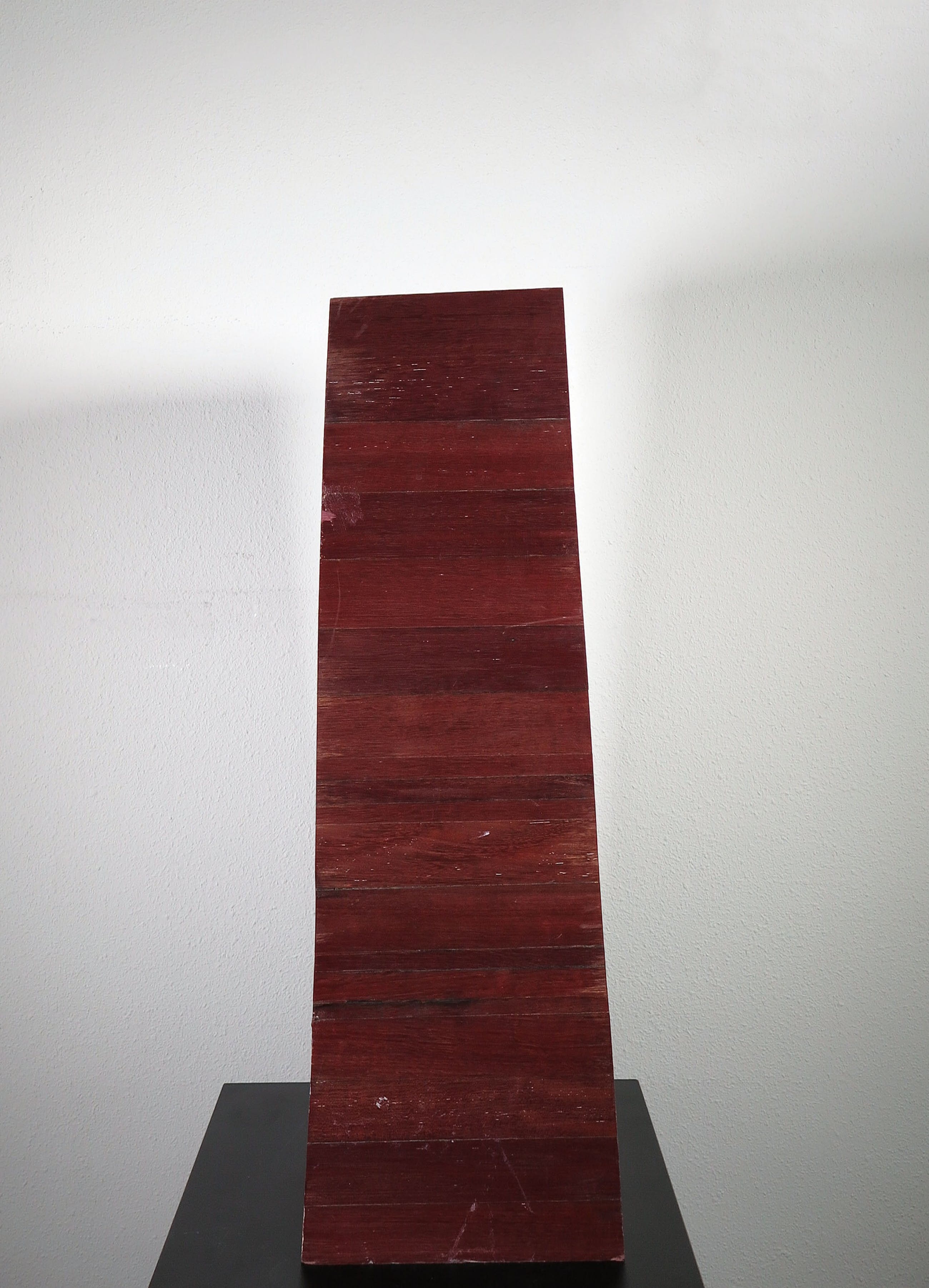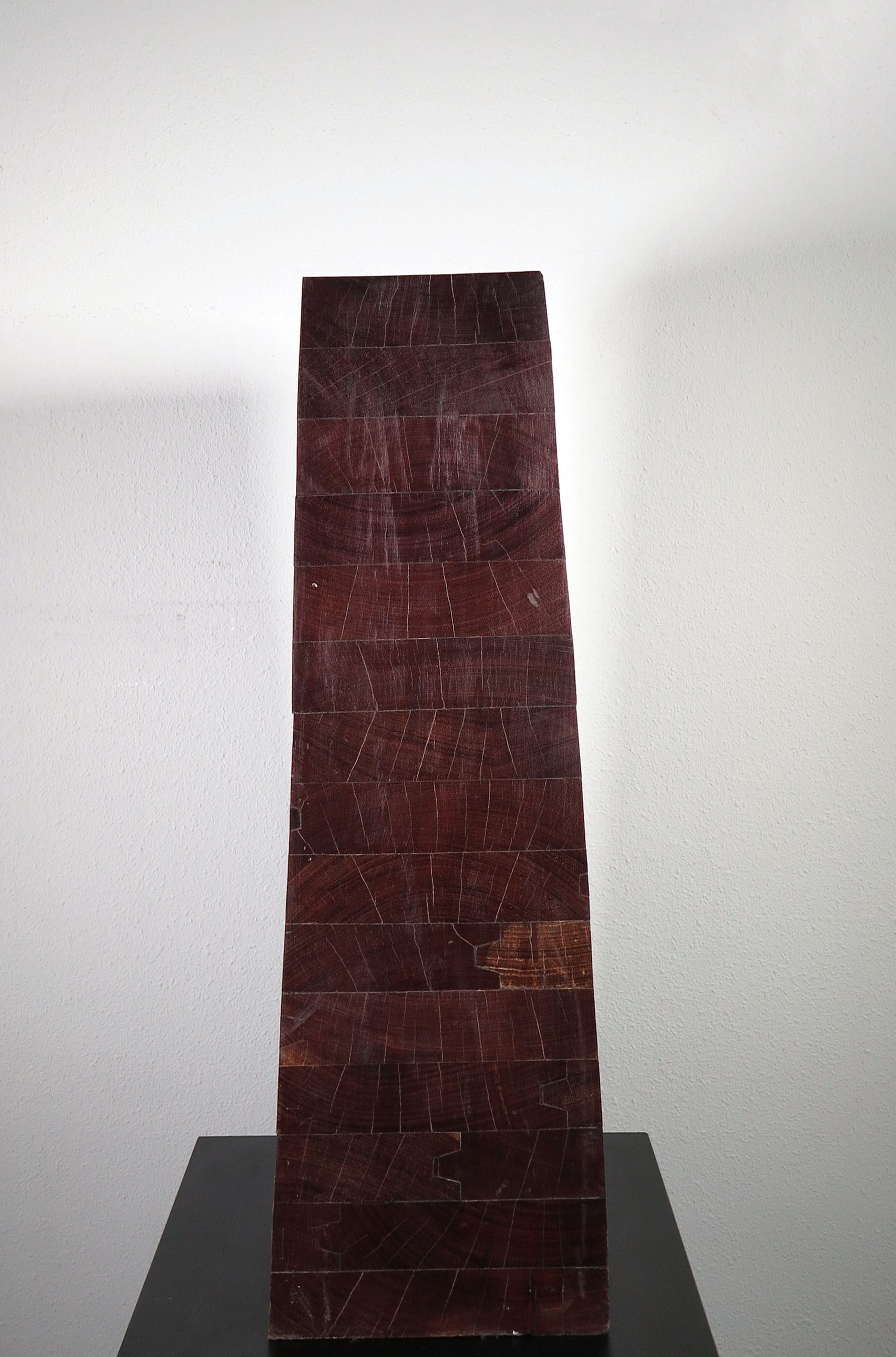 | In redelijke conditie. Verspreid over de vlakken enkele witte vlekken/krassen. Hier en daar mist een splinter/is het werk beschadigd langs een rand. Enkele oppervlakkige krassen/slijtplekken. Aan twee zijdes lopen er scheurtjes door het hout, door het werken. | |