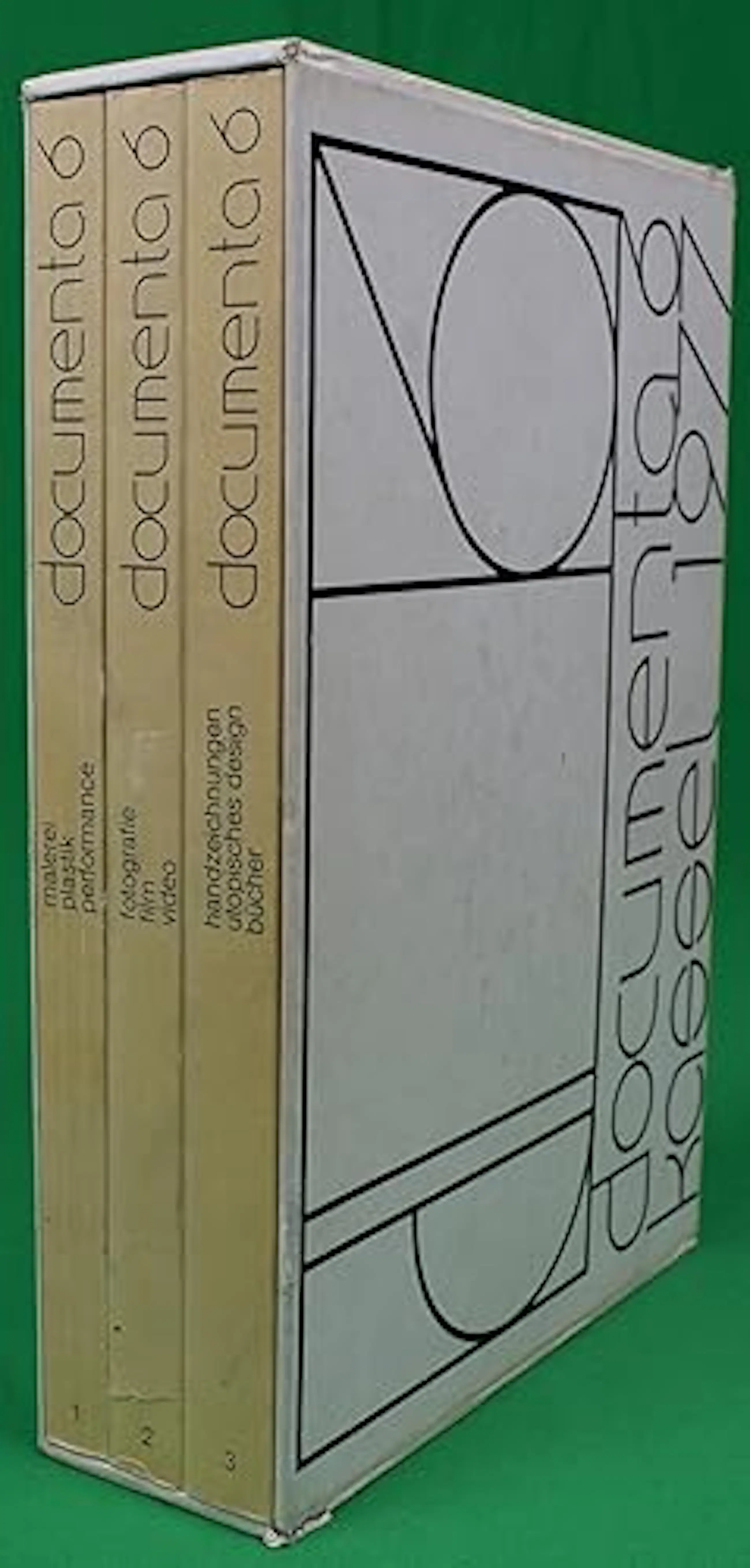 Kartonnen box met drie delen over de tentoonsteeling dokumenta in Kassel. Compleet