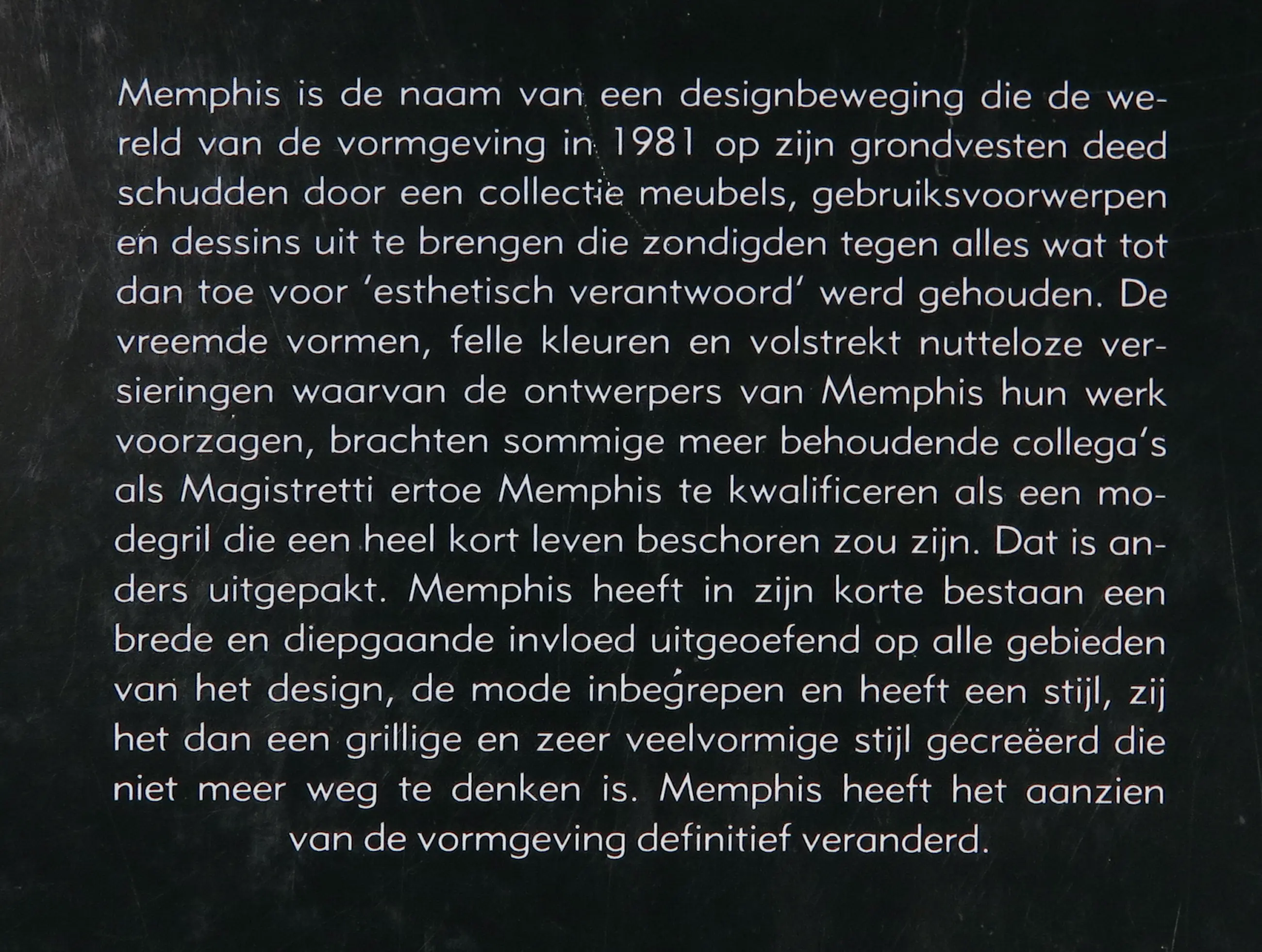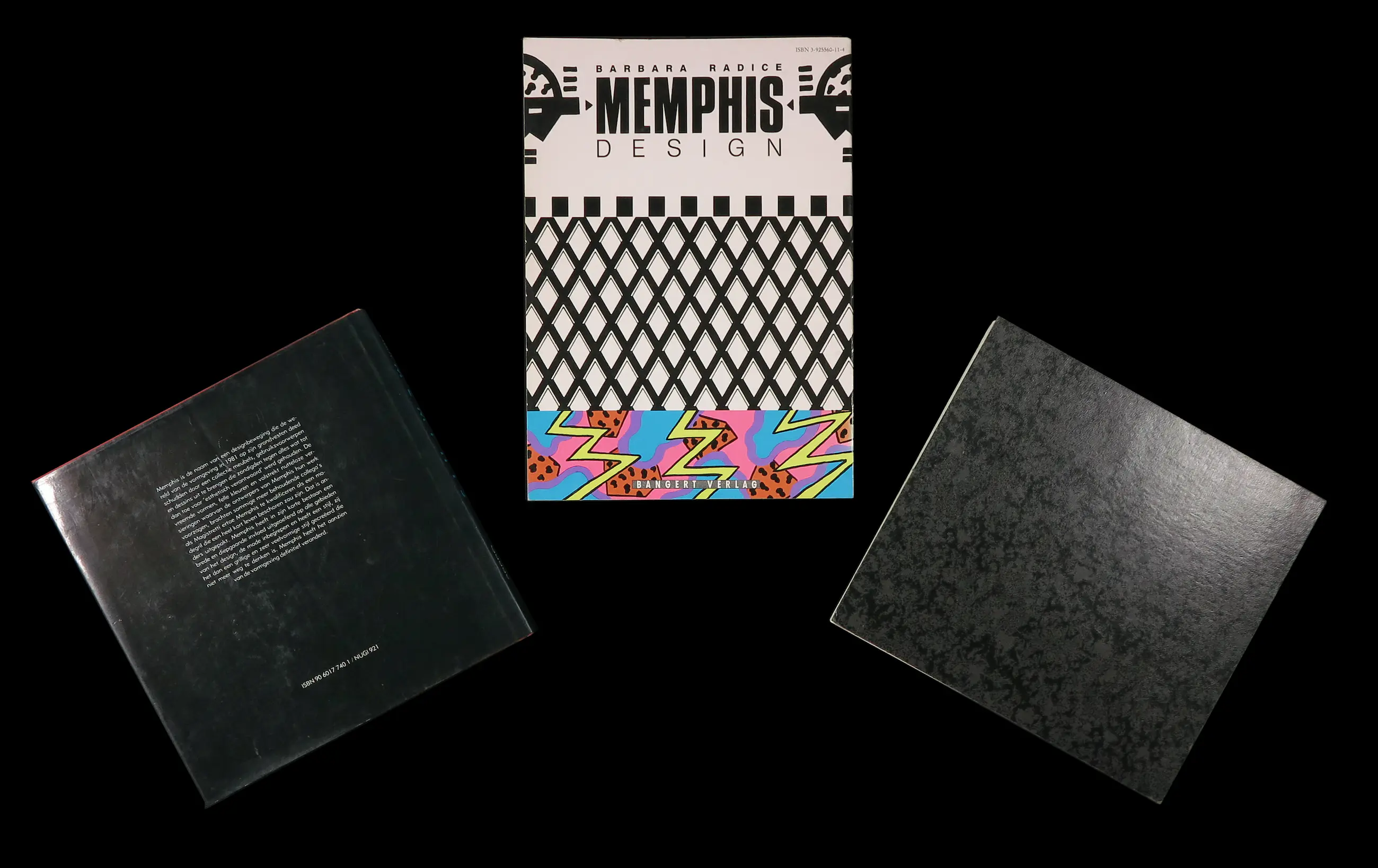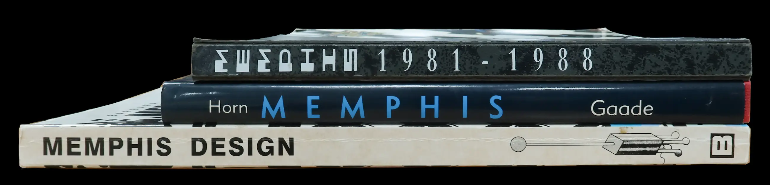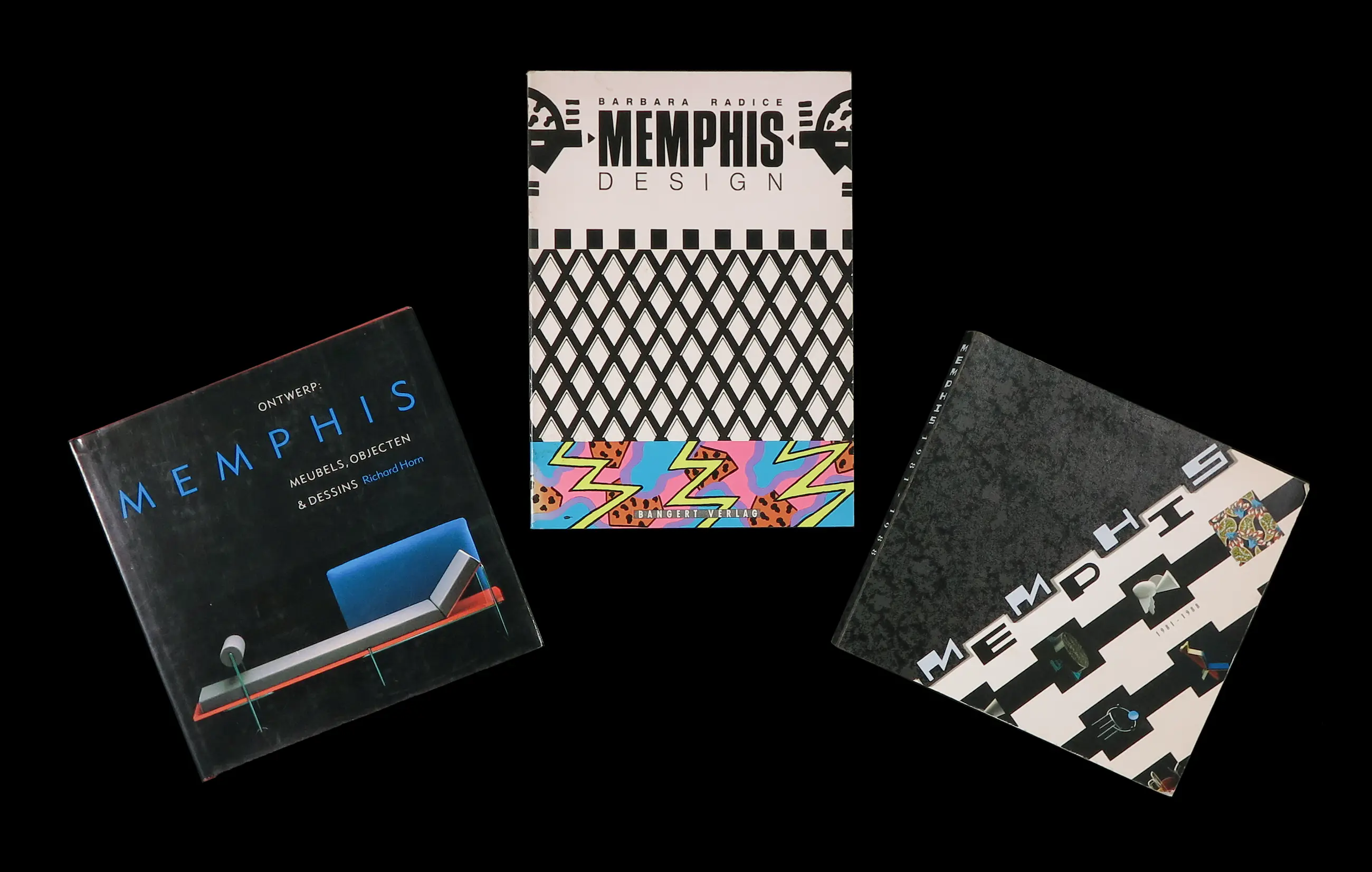 Auteur(s), titel (jaar van uitgave) - uitgever (taal/talen)(soft/hard) 1. Richard Horn, Ontwerp: Memphis Meubels, Objecten & Dessins (1987) - Gaade (Nederlands)(hard) 2. Barbara Radice, Memphis Design (1988) - Bangert (Duits)(soft) 3. auteur onbekend?, Memphis: 1981-1988 (1989) - Groninger Museum (Nederlands) (soft)