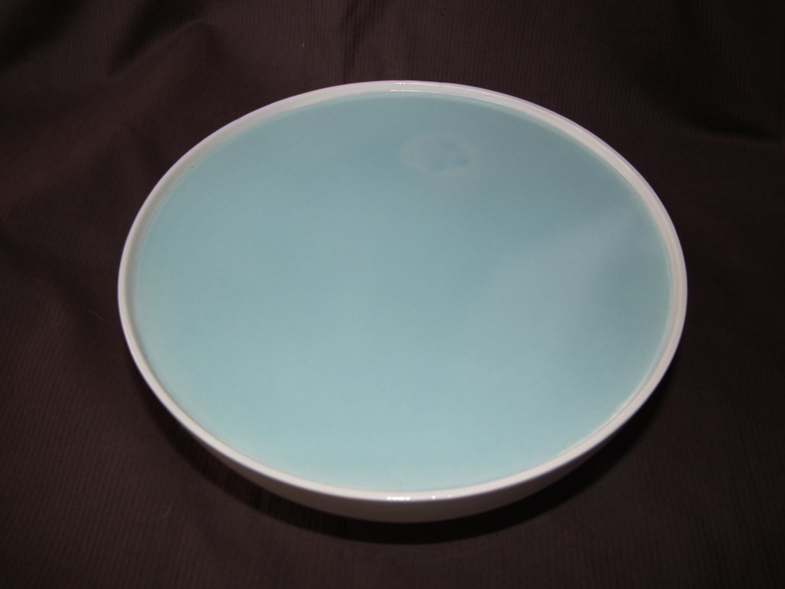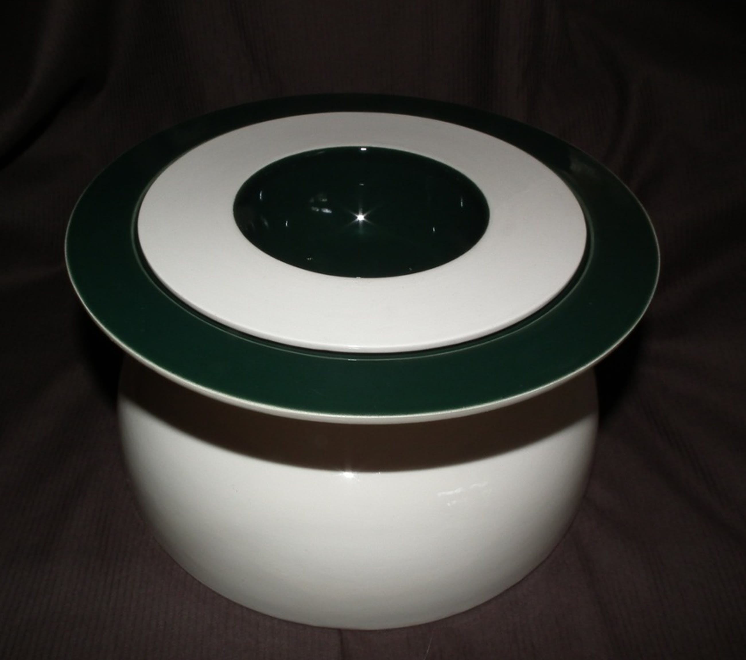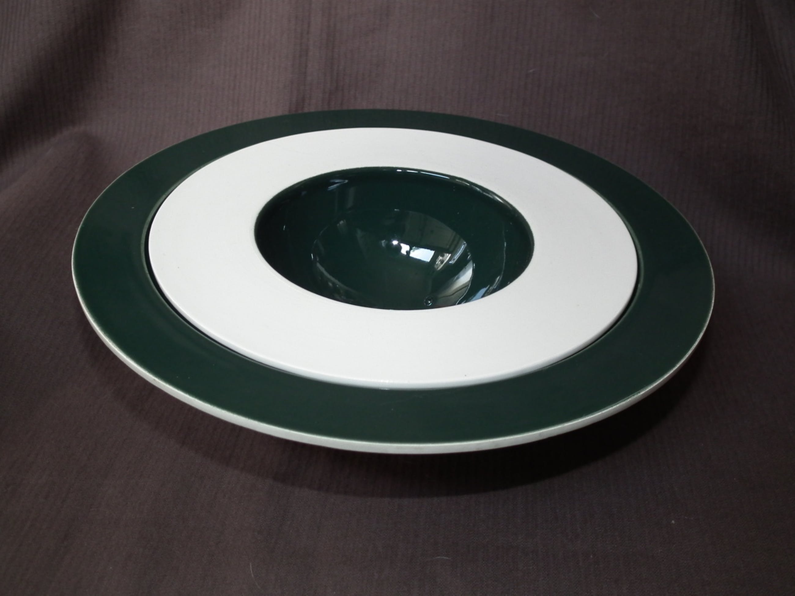 De onderschaal is blauw glazuur en de dubbelschotel heeft een groene glazuur. Bij deze ontwerpen is ook een vaas gemaakt. De set wordt aangetekend verzonden.