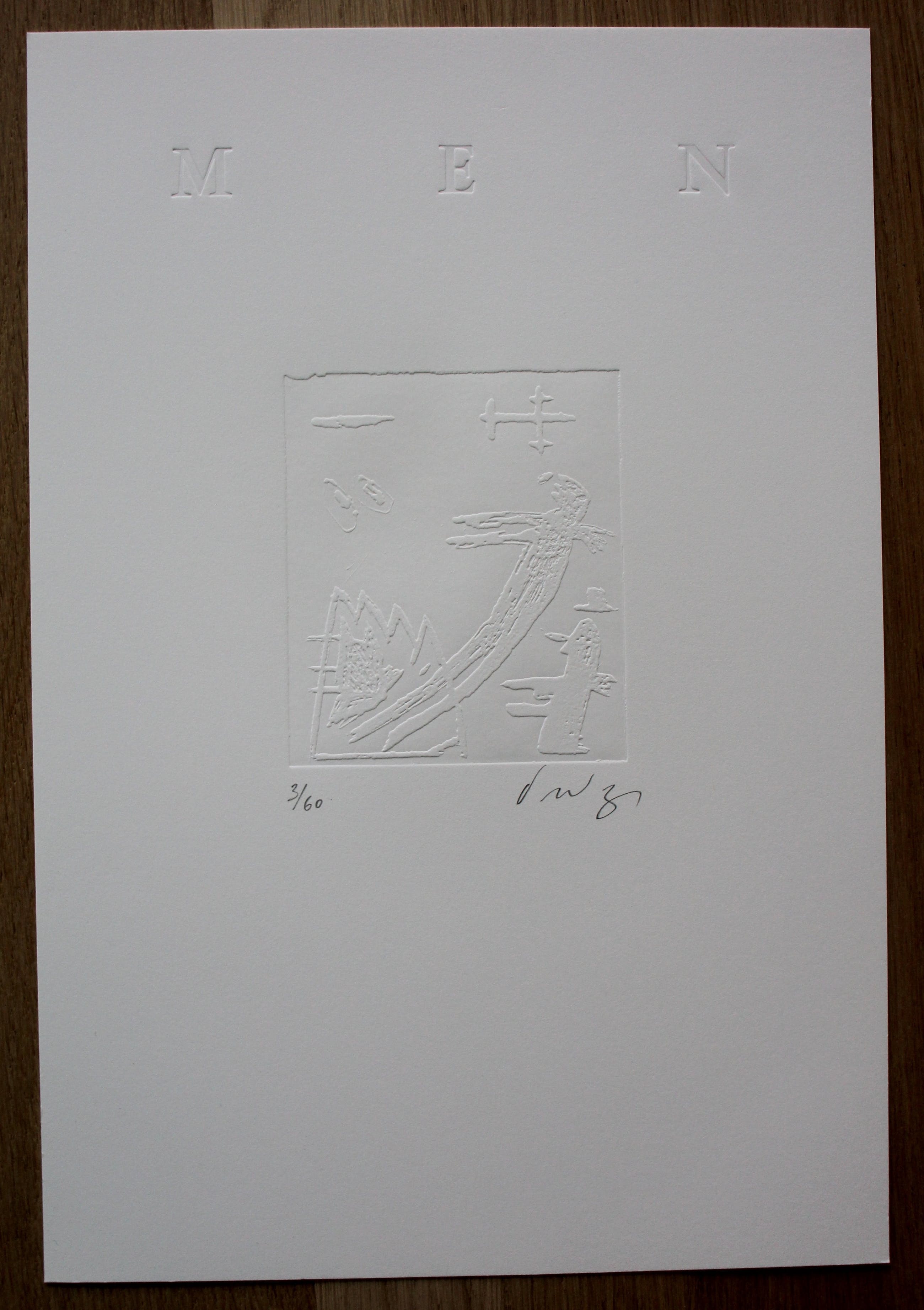 Ets van Dodog Soeseno. Deze ets zit in een map met 12 werken en vier gedichten. Gebaseerd op de serie: Animal-Men-City, To many dreams in a short night: Men. Nummer: 3/60. Afmetingen blad: H34 x b23cm. Afmetingen voorstelling: H10.5 x b9cm. Het werk is rechts onderaan, met potlood, gesigneerd door de kunstenaar. De authenticiteit van het, aangeboden, werk wordt volledig gegarandeerd. Een certificaat van echtheid kan, op aanvraag, worden gemaild.
