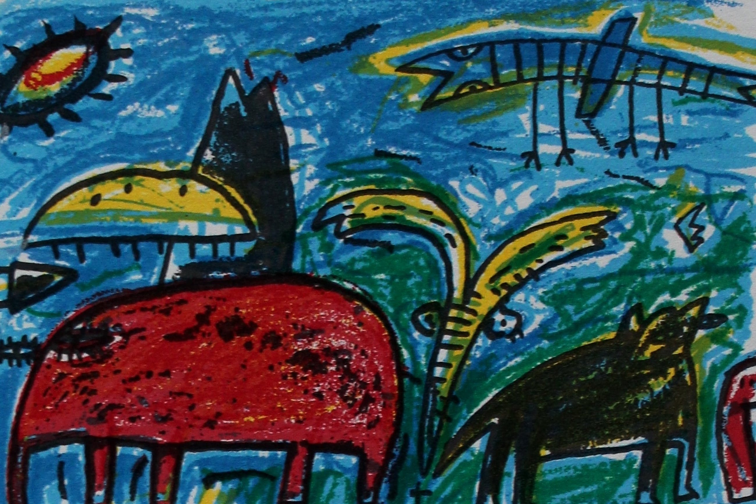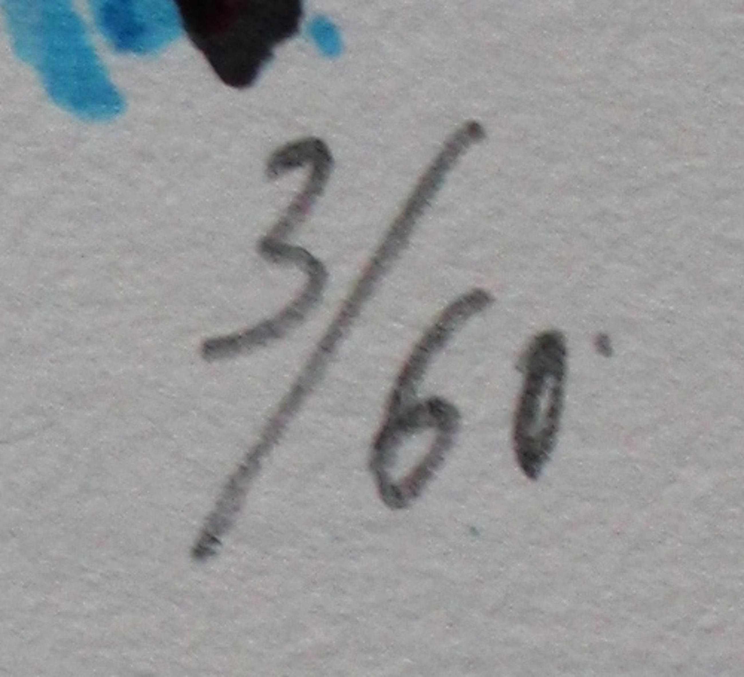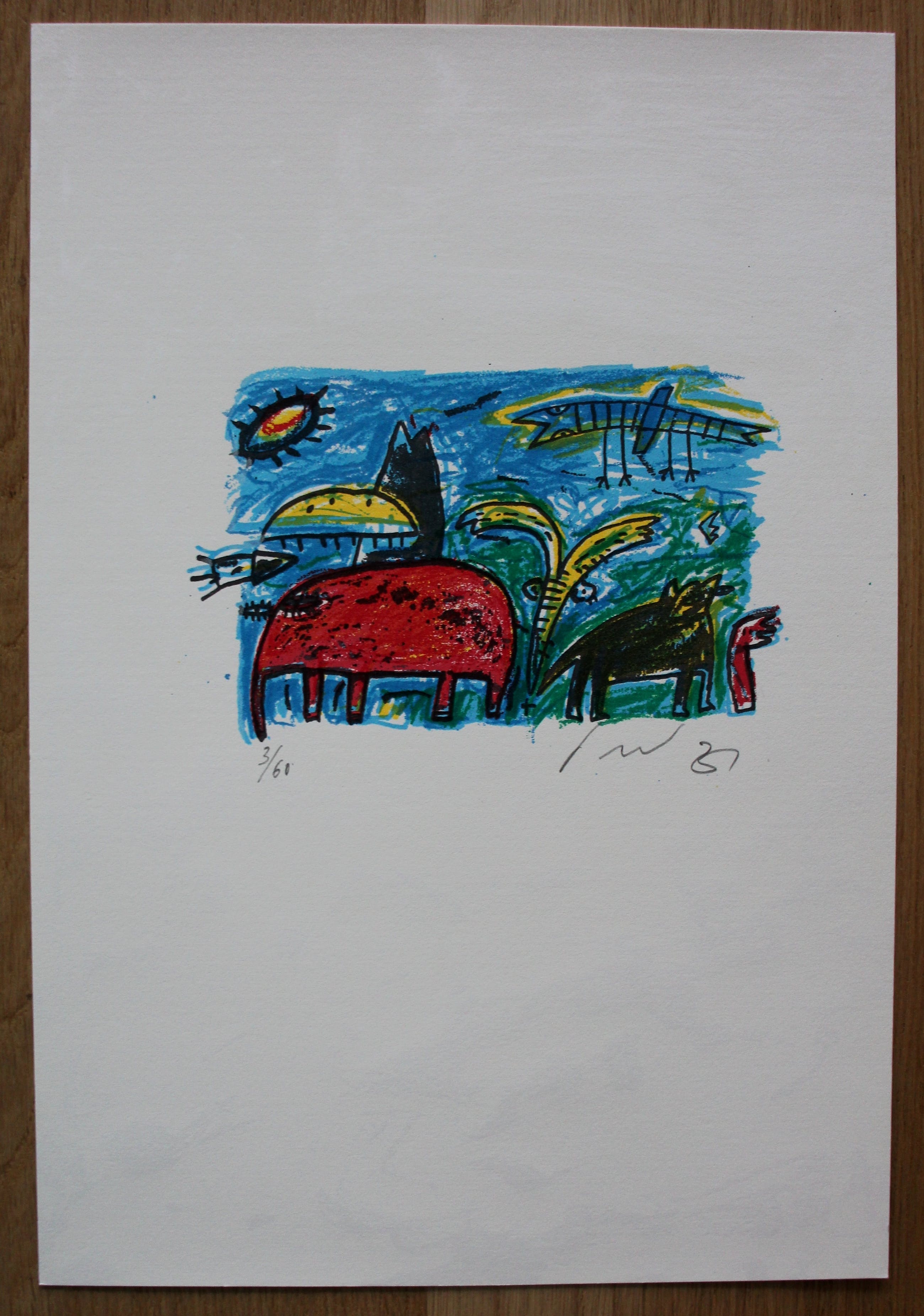 Zeefdruk van Dodog Soeseno. Deze zeefdruk zit in een map met 12 werken en vier gedichten. Gebaseerd op de serie: Animal-Men-City, To many dreams in a short night. Nummer: 3/60. Afmetingen blad: H34 x b23cm. Afmetingen voorstelling: H9.5 x b14 cm. Het werk is rechts onderaan, met potlood, gesigneerd door de kunstenaar. De authenticiteit van het, aangeboden, werk wordt volledig gegarandeerd. Een certificaat van echtheid kan, op aanvraag, worden gemaild.