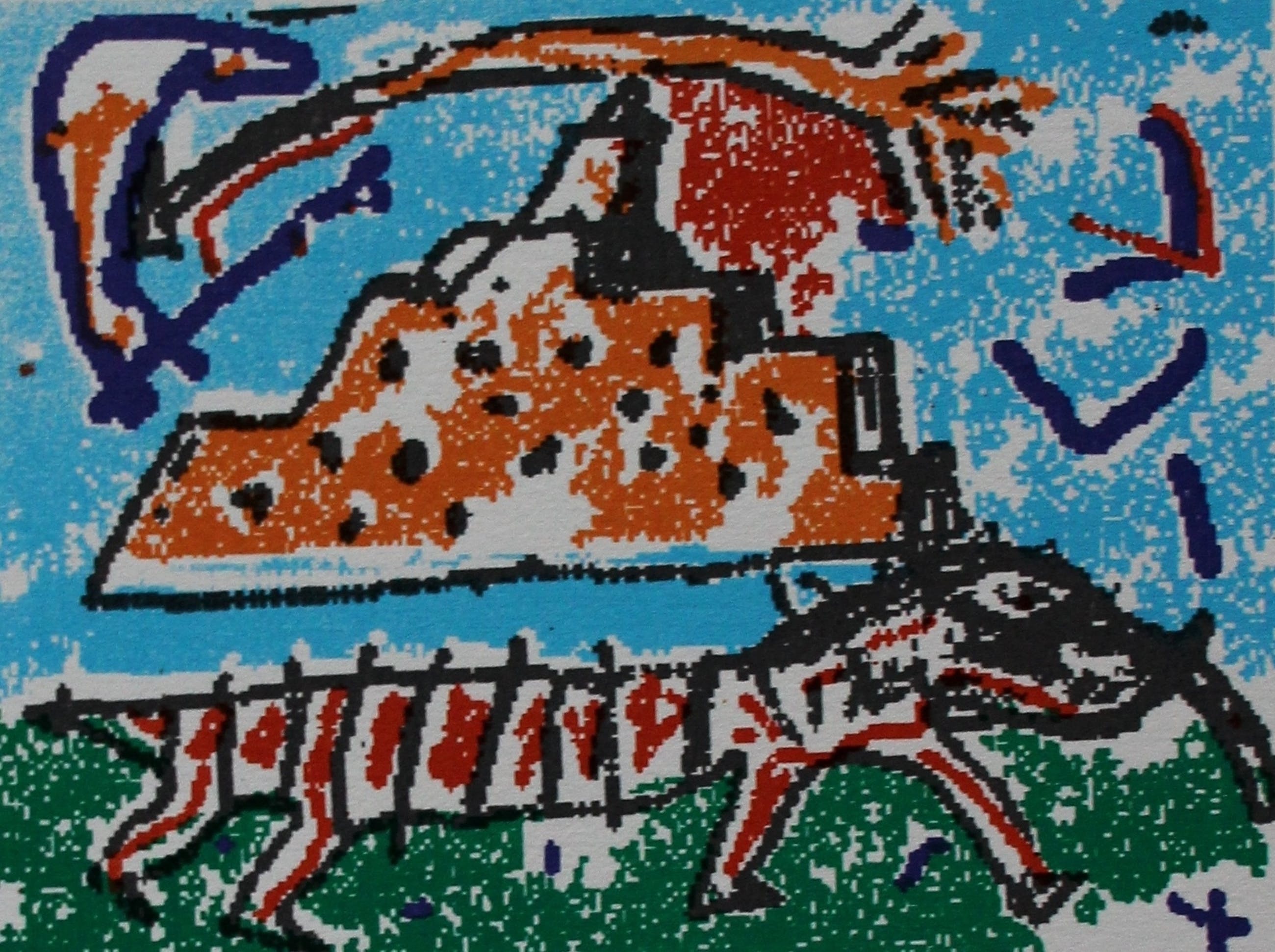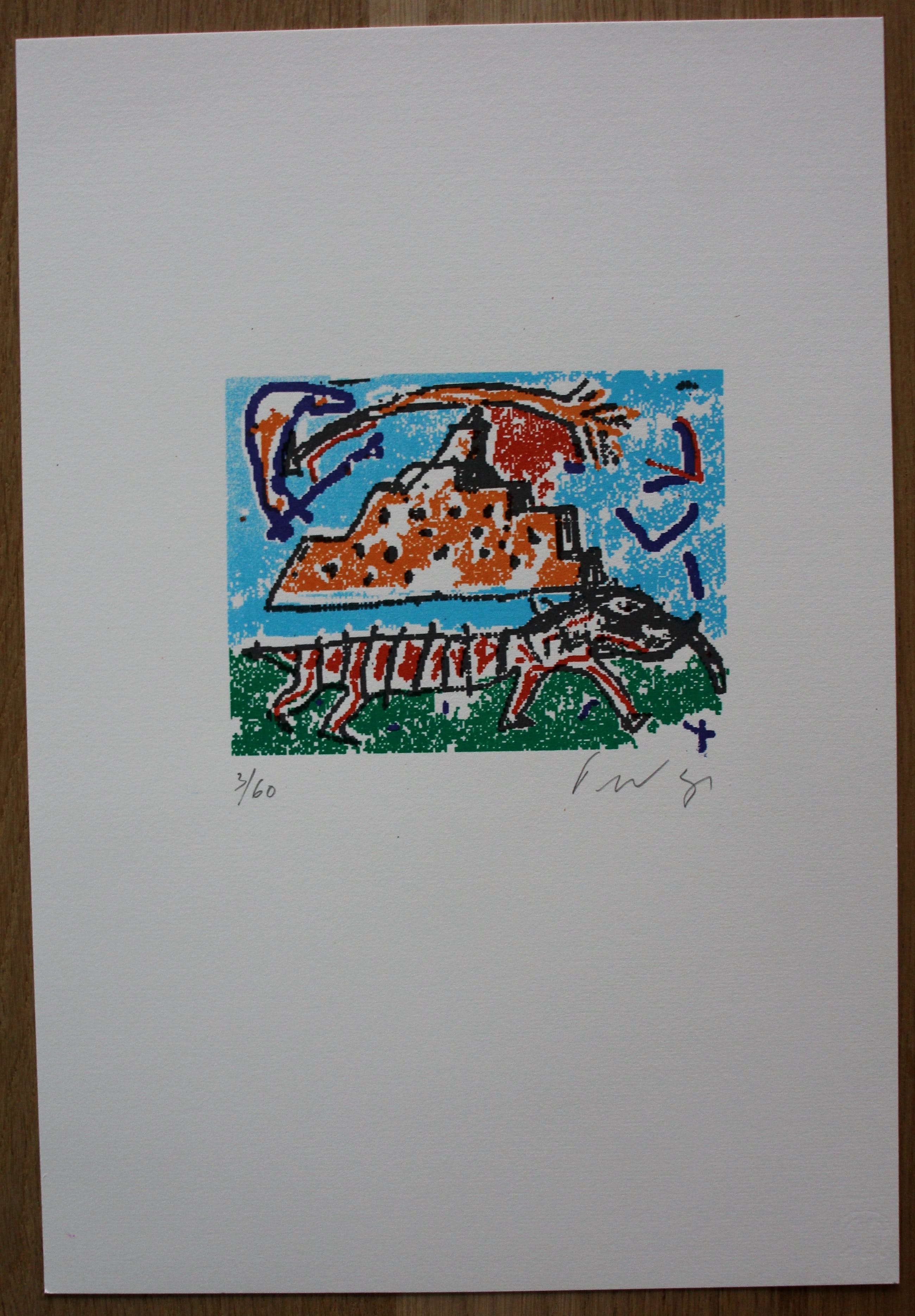 Zeefdruk van Dodog Soeseno. Deze zeefdruk zit in een map met 12 werken en vier gedichten. Gebaseerd op de serie: Animal-Men-City, To many dreams in a short night. Nummer: 3/60. Afmetingen blad: H34 x b23cm. Afmetingen voorstelling: H10 x b13 cm. Het werk is rechts onderaan, met potlood, gesigneerd door de kunstenaar. De authenticiteit van het, aangeboden, werk wordt volledig gegarandeerd. Een certificaat van echtheid kan, op aanvraag, worden gemaild.