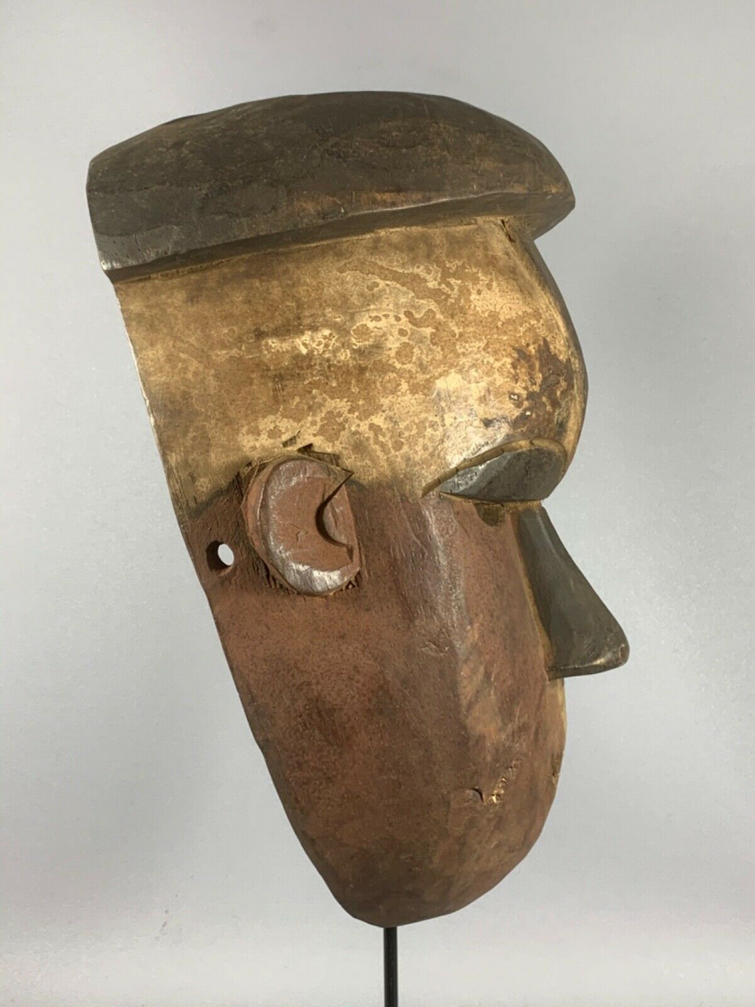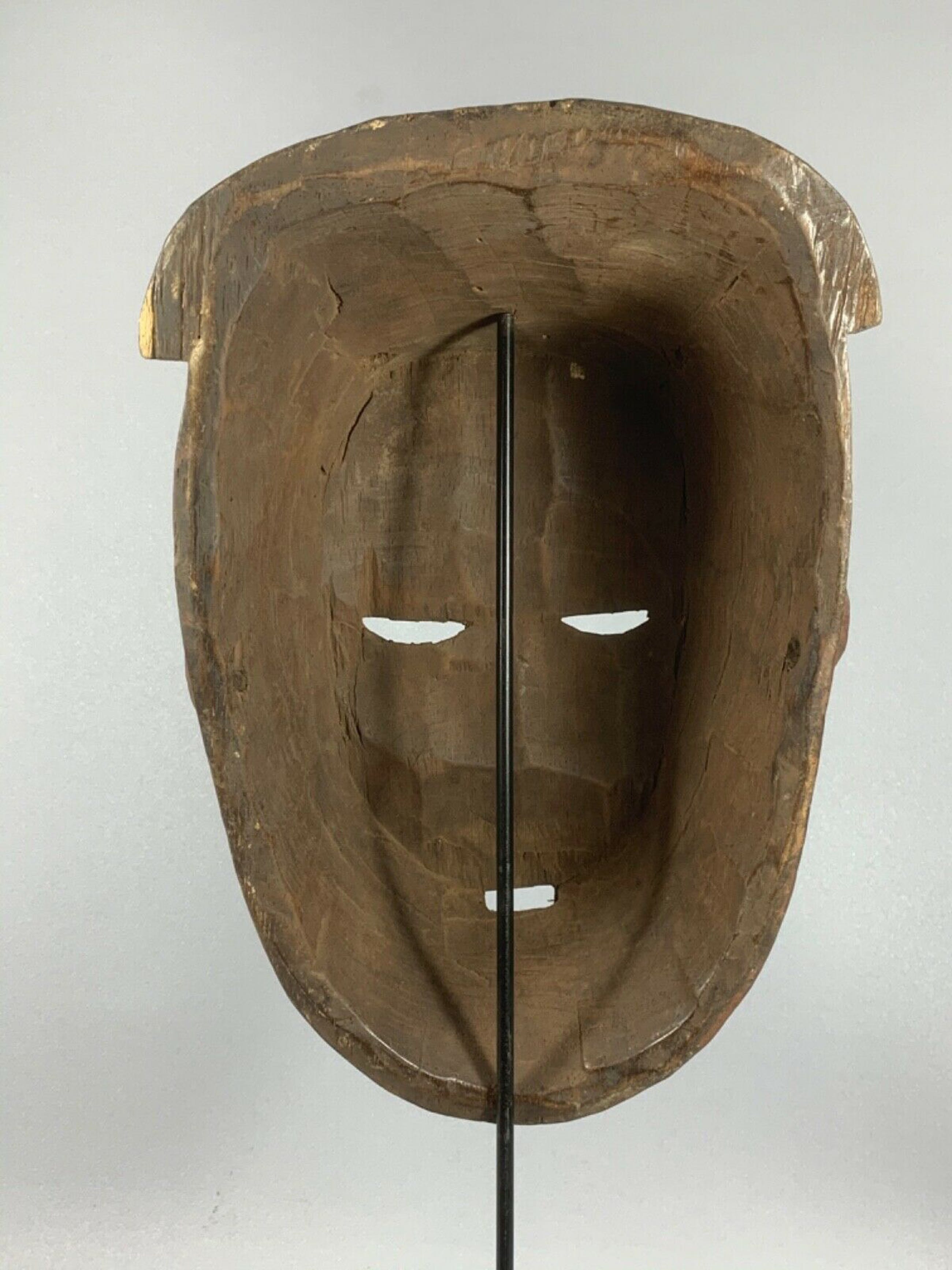 Salampasu masks were integral part of the warriors’ society whose primary task was to protect this small enclave against invasions by outside kingdoms. Boys were initiated into the warriors’ society through a circumcision camp, and then rose through its ranks by gaining access to a hierarchy of masks. Earning the right to wear a mask involved performing specific deeds and large payments of livestock, drink and other material goods. Once a man ‘owned’ the mask, other ‘owners’ taught this new member particular esoteric knowledge associated with it. The Salampasu use masks made from wood, crocheted raffia, and wood covered with sheets of copper. Famous Salampasu masks made for initiation purposes are characterized by a bulging forehead, slanted eyes, a triangular nose and a rectangular mouth displaying intimidating set of teeth. The heads are often covered with bamboo or raffia or rattan-like decorations. Presented in a progressive order to future initiates, they symbolize the three levels of the society: hunters, warriors, and the chief. Certain masks provoke such terror that women and children flee the village when they hear the mask's name pronounced for fear they will die on the spot. Wooden masks covered or not covered with copper sheets are worn by members of the ibuku warrior association who have killed in battle. The masks made of plaited raffia fiber are used by the idangani association. Throughout the southern savannah region copper was a prerogative of leadership, used to legitimize a person’s or a group’s control of the majority of the people. Possessing many masks indicated not only wealth but also knowledge. Filing teeth making part of many wooden masks was part of the initiation process for both boys and girls designed to demonstrate the novices’ strength and discipline. Salampasu masquerades were held in wooden enclosures decorated with anthropomorphic figures carved in relief. The costume, composed of animal skins, feathers, and fibers, is as important as the mask itself. It has been sacralized, and the spirit dwells within it. Masks are still being danced as part of male circumcision ceremonies.