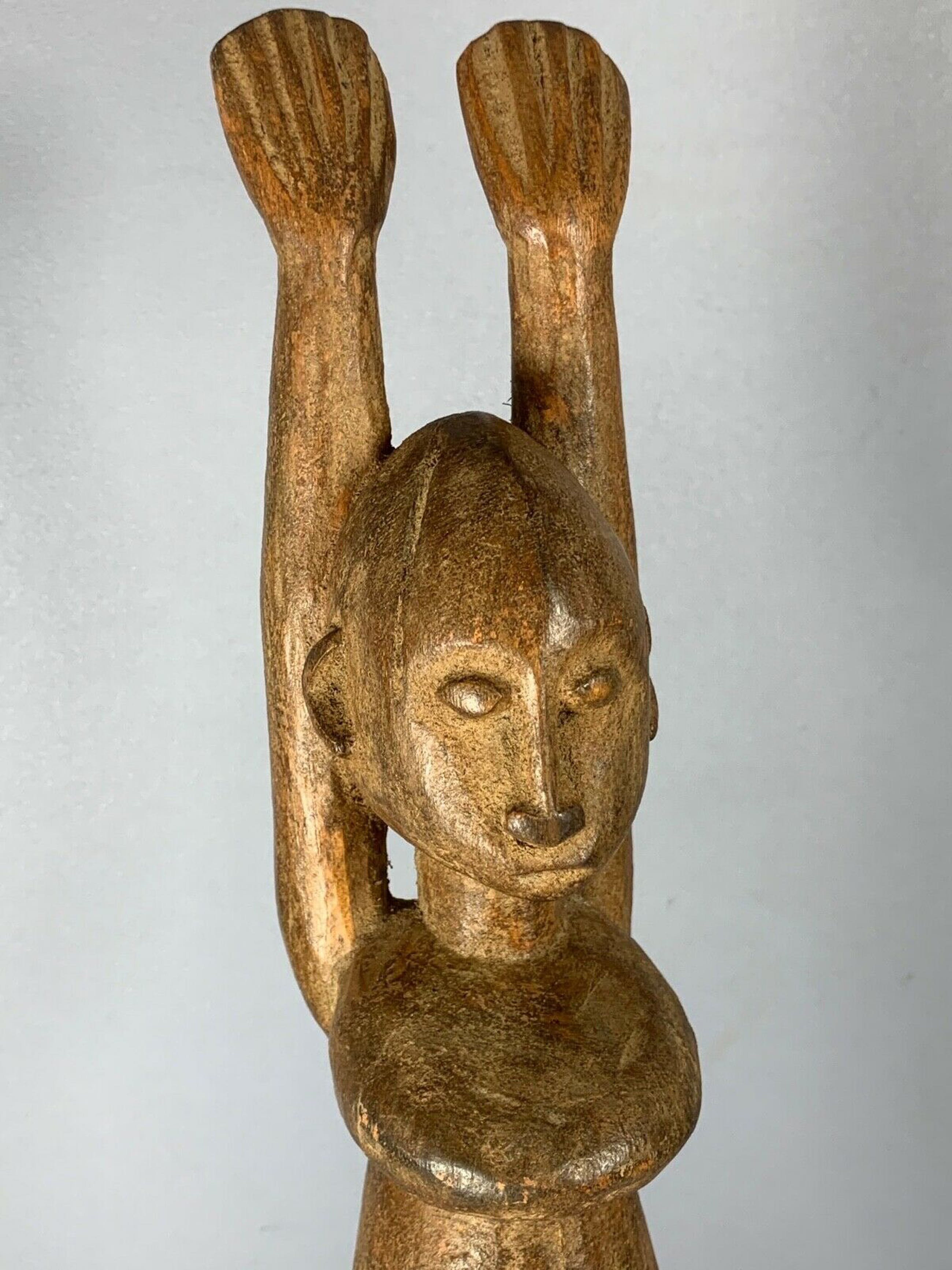 The 400,000 Dogon live 180 miles south of Timbuktu on the cliffs of Bandiagara, which dominate the plains for over 150 miles. They speak approximately 120 dialects, many of which are not mutually comprehensible. At first hunters, now on their small fields they cultivate millet, sorghum, wheat, and onion. The millet is stored in high quadrangular granaries around which they build their houses. Because of the difficult approach to these regions and the aridity of the climate, the Dogon have been isolated and hence were able to conserve their ancient religious habits and ways of making the necessary implements, their carvings. Dogon social and religious organizations are closely interlinked and out of this arose principal cults, which accounts for the richness and diversity of Dogon culture and art. The clans are subdivided onto lineages, overseen by the patriarch, guardian of the clan’s ancestral shrine and officiant at the totemic animal cult. Beside this hierarchical system of consanguinity, male and female associations are entrusted with the initiations that take place by age group, corresponding to groups of newly circumcised or excised boys or girls. The Dogon believe these operations remove the female element from males and vice versa. Circumcision thus creates a wholly male or female person prepared to assume an adult role. The members of an age group owe one another assistance until the day they die. Initiation of boys begins after their circumcision, with the teaching of the myths annotated by drawings and paintings. The young boys will learn the place of humans in nature, society, and the universe. In the Dogon pantheon Amma appears as the original creator of all the forces of the universe and of his descendant Lebe, the god of plant rebirth. Thefirst Dogon primordial ancestors, called Nommo, were bisexual water gods. They were created in heaven by the creator god Amma and descended from heaven to earth in an ark. The Nommo founded the eight Dogon lineages and introduced weaving, smithing, and agriculture to their human descendants.For these various cults the hogon is both priest and political chief of the village.He is also in charge of the cult of lebe, the mythical serpent. Assisted by the blacksmith, he presides over agrarian ceremonies. The smiths and woodcarvers, who form a separate caste, transmit their profession by heredity. They may only marry within their own caste. Women are in charge of pottery making. Dogon art is extremely versatile, although common stylistic characteristics – such as a tendency towards stylization – are apparent on the statues. Their art deals with the myths whose complex ensemble regulates the life of the individual. The sculptures are preserved in innumerable sites of worship, personal or family altars, altars for rain, altars to protect hunters, in market. As a general characterization of Dogon statues, one could say that they render the human body in a simplified way, reducing it to its essentials. Some are extremely elongated with emphasis on geometric forms. The subjective impression is one of immobility with a mysterious sense of a solemn gravity and serene majesty, although conveying at the same time a latent movement. Dogon sculpture recreates the hermaphroditic silhouettes of the Tellem, featuring raised arms and a thick patina made of blood and millet beer. The four Nommo couples, the mythical ancestors born of the god Amma, ornament stools, pillars or men’s meeting houses, door locks, and granary doors. The primordial couple is represented sitting on a stool, the base of which depicts the earth while the upper surface represents the sky; the two are interconnected by the Nommo. The seated female figures, their hands on their abdomen, are linked to the fertility cult, incarnating the first ancestor who died in childbirth, and are the object of offerings of food and sacrifices by women who are expecting a child. Kneeling statues of protective spirits are placed at the head of the dead to absorb their spiritual strength and to be their intermediaries with the world of the dead, into which they accompany the deceased before once again being placed on the shrines of the ancestors. Horsemen are remainders of the fact that, according to myth, the horse was the first animal present on earth. The Dogon style has evolved into a kind of cubism: ovoid head, squared shoulders, tapered extremities, pointed breasts, forearms, and thighs on a parallel plane, hairdos stylized by three or four incised lines. Dogon sculptures serve as a physical medium in initiations and as an explanation of the world. They serve to transmit an understanding to the initiated, who will decipher the statue according to the level of their knowledge. Carved animal figures, such as dogs and ostriches, are placed on village foundation altars to commemorate sacrificed animals, while granary doors, stools and house posts are also adorned with figures and symbols.There are nearly eighty styles of masks, but their basic characteristic is great boldness in the use of geometric shapes, independent of the various animals they are supposed to represent. The structure of a large number of masks is based on the interplay of vertical and horizontal lines and shapes. Another large group has triangular, conic shapes. All masks have large geometric eyes and stylized features. The masks are often polychrome, but on many the color is lost; after the ceremonies they were left on the ground and quickly deteriorated because of termites and other conditions. The Dogon continue an ancient masquerading tradition, which commemorates the origin of death. According to their myths, death came into the world as a result of primeval man’s transgressions against the divine order. Dama memorial ceremonies are held to accompany the dead into the ancestral realm and restore order to the universe. The performance of masqueraders – sometimes as many as 400 – at these ceremonies is considered abso
