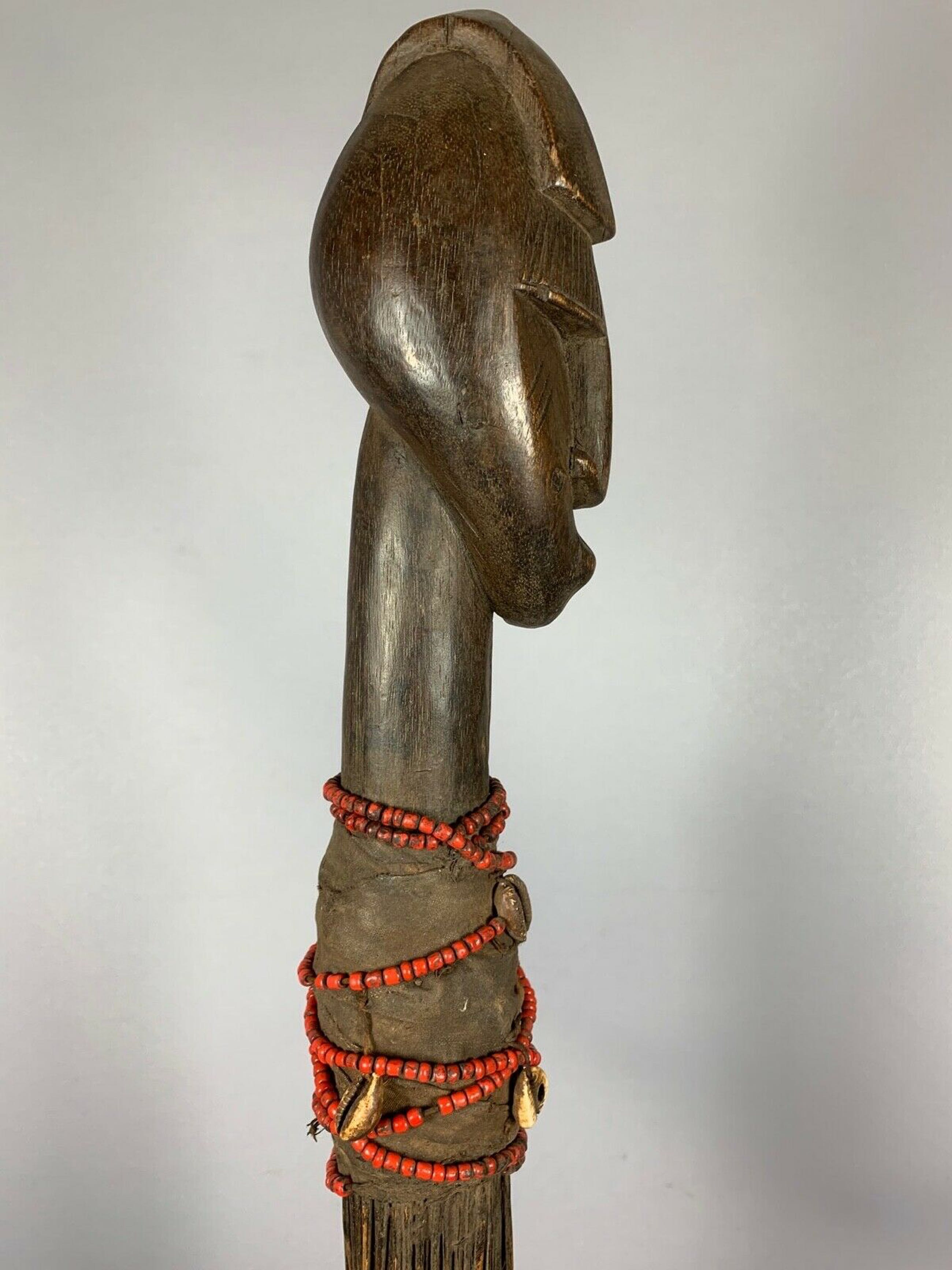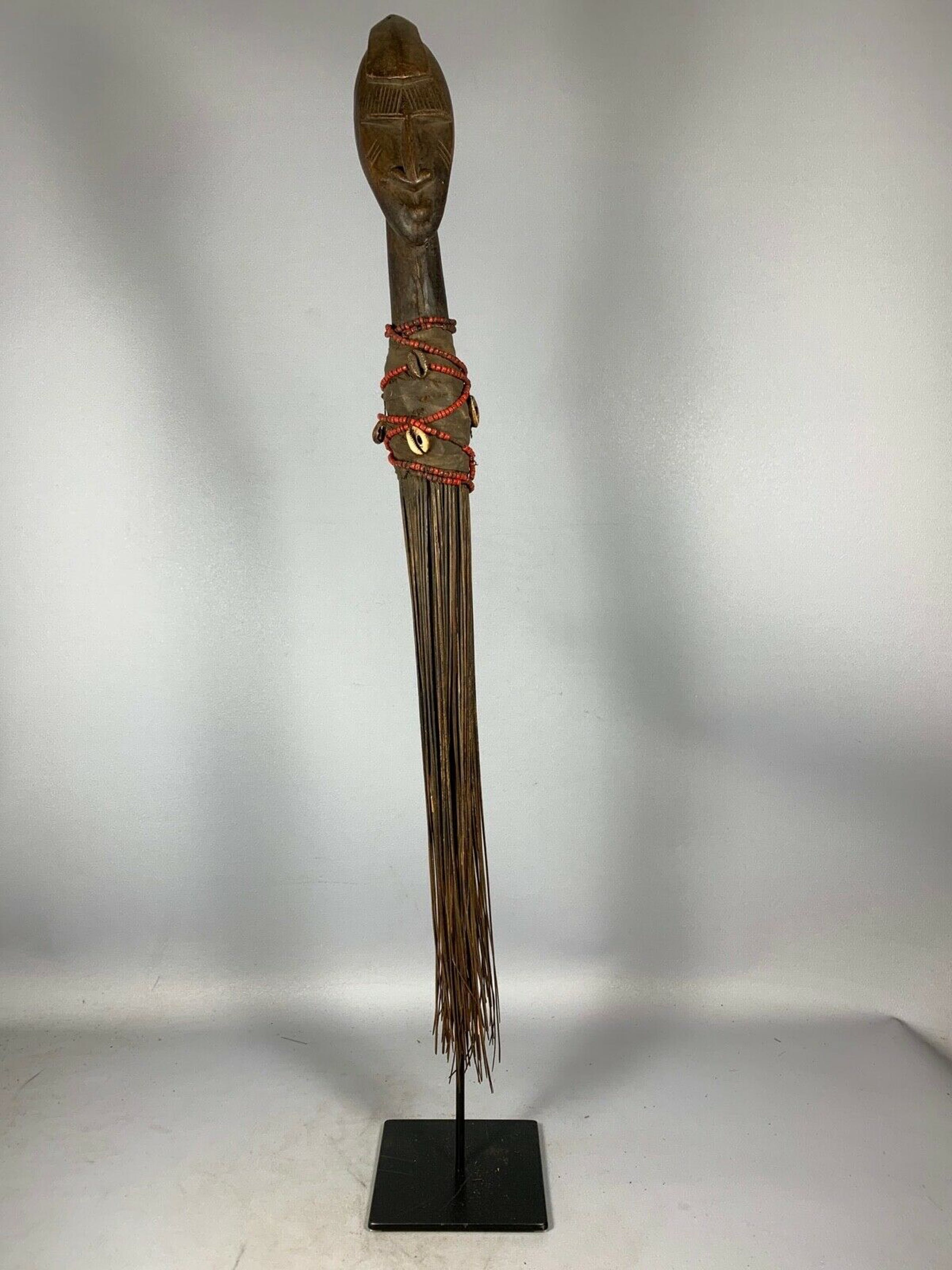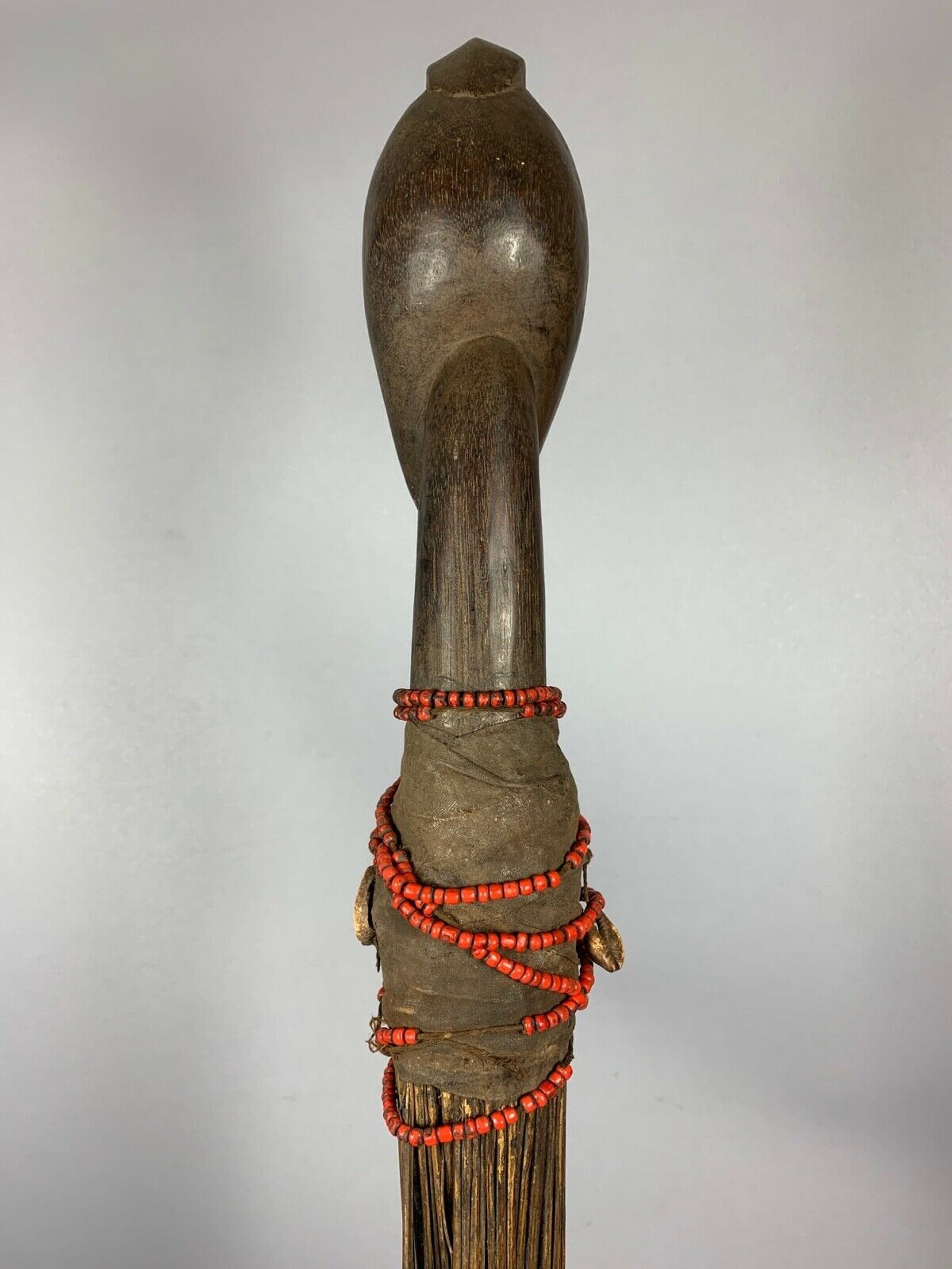 Old & Rare wooden DOGON head. The head acts as a handle for the broom, which is made of reed.Total height: 70 cm, only the head are 27 cm.