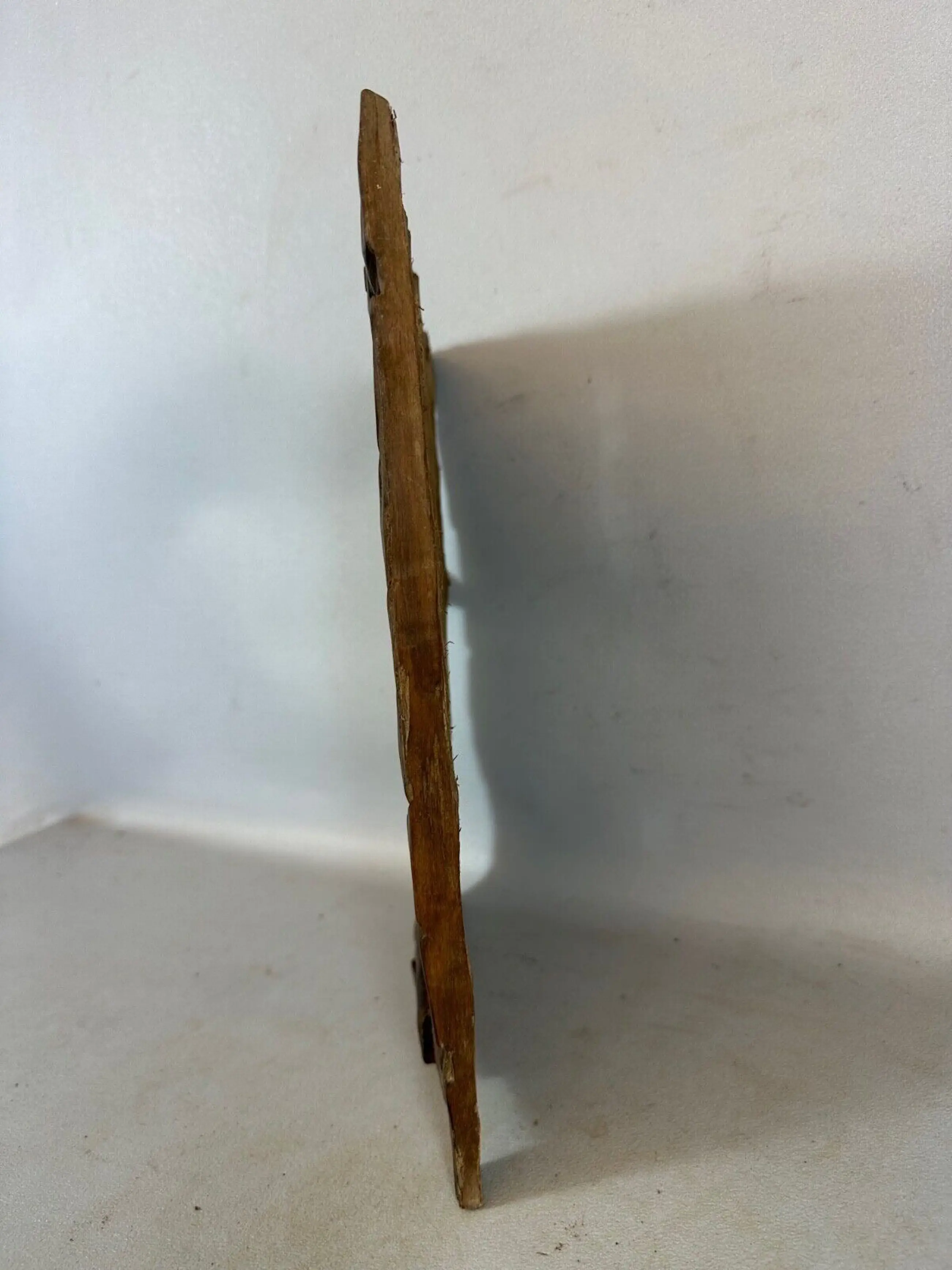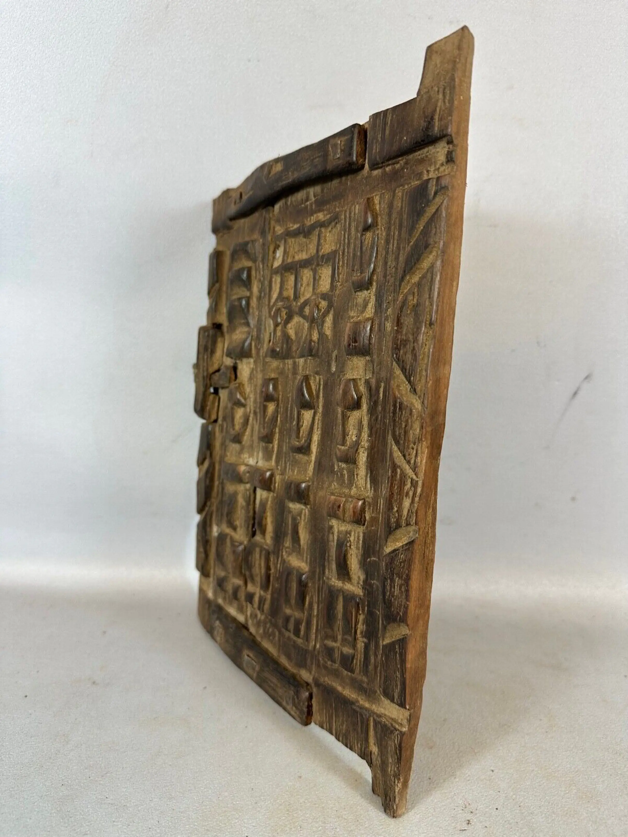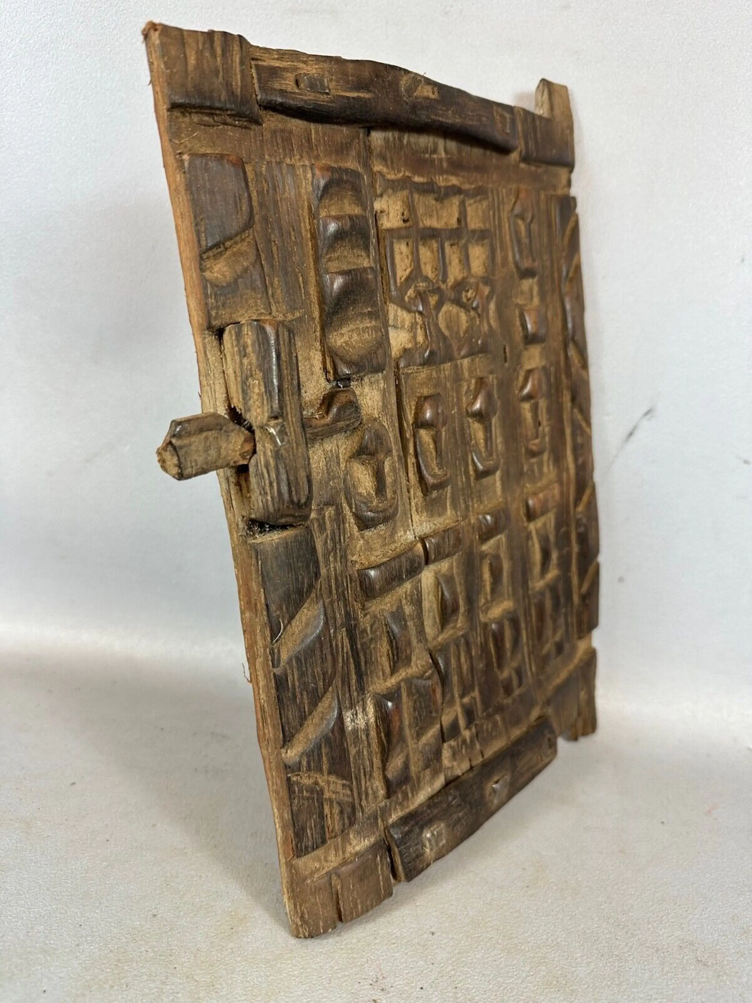 This beautifully carved African Granary door storage measures 31 cm tall and is hand-carved of wood. It originates from the Dogon tribe of of Mali and Burkina Faso. These doors protected the window like opening into each family’s grain storage building so a small amount of food could be taken out. Primordial beings, ancestors, Kanaga masks, sun lizards and scenes of life symbolically served to protect the entrance by making it sacrosanct. The low reliefs are carved on several panels, held together by iron staples.
