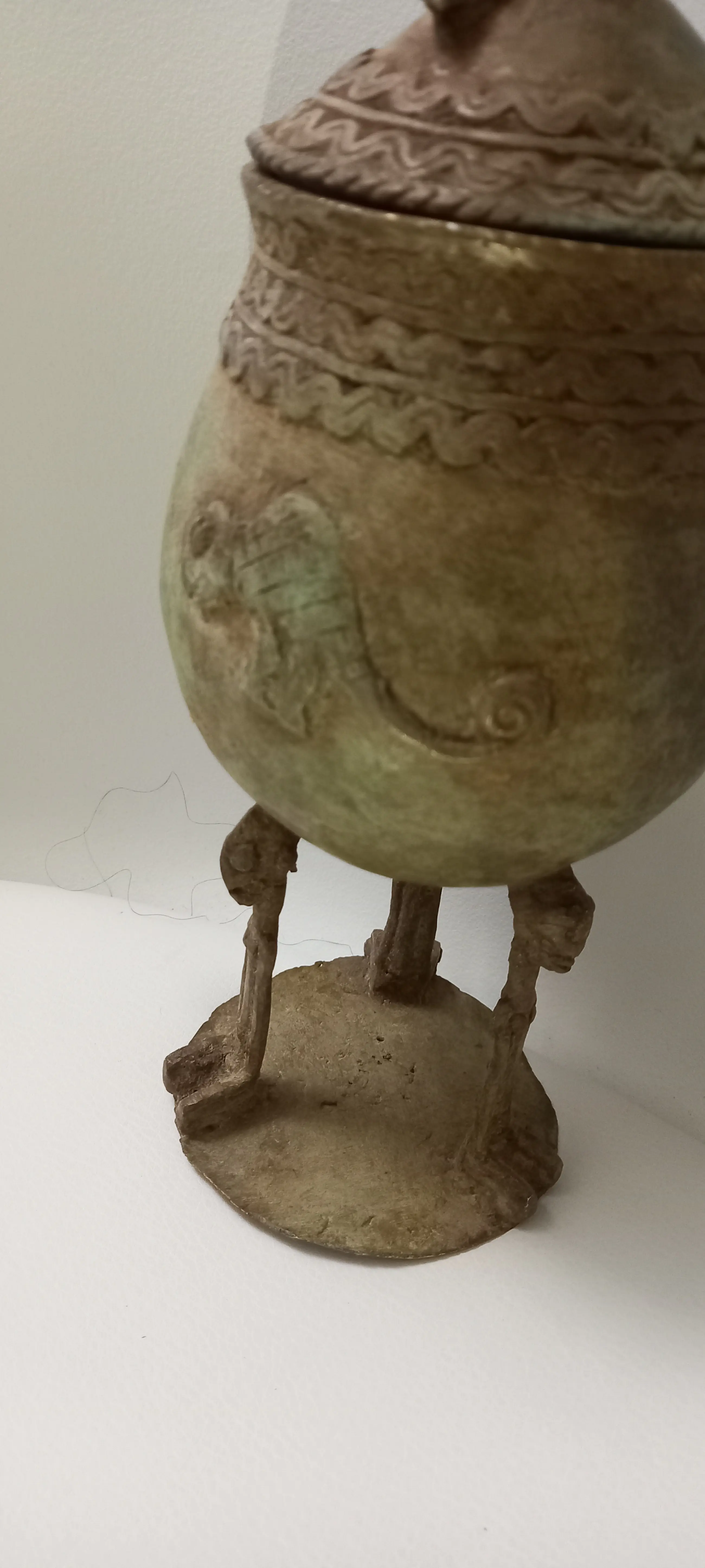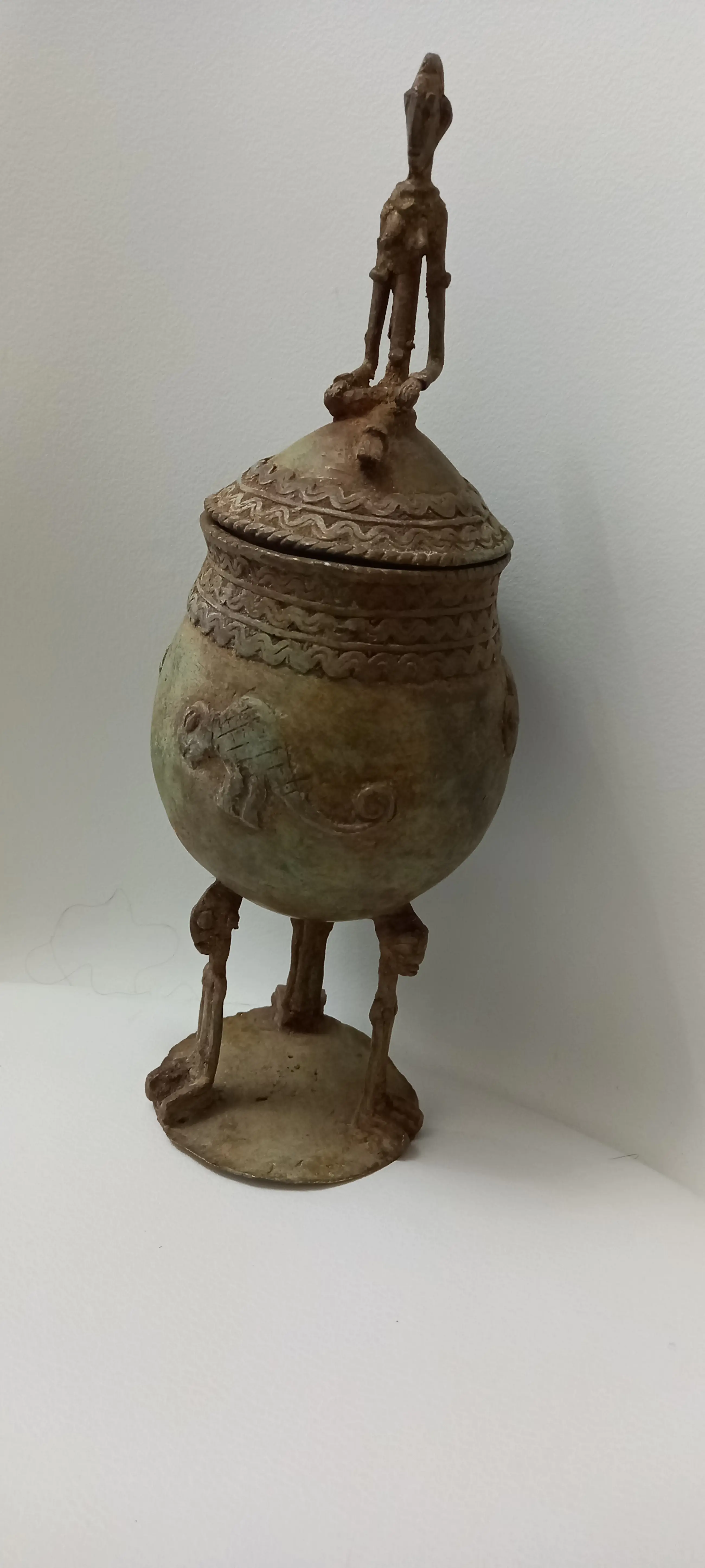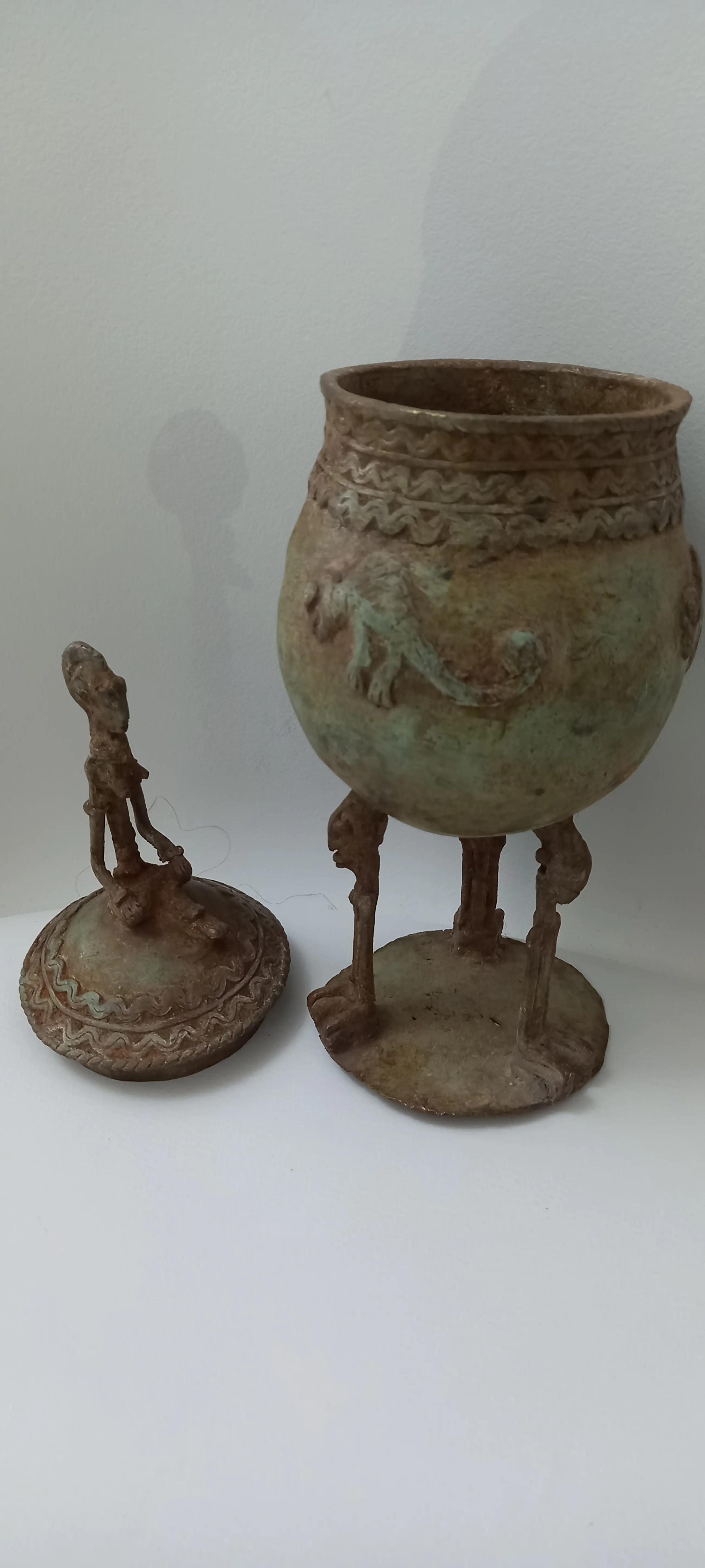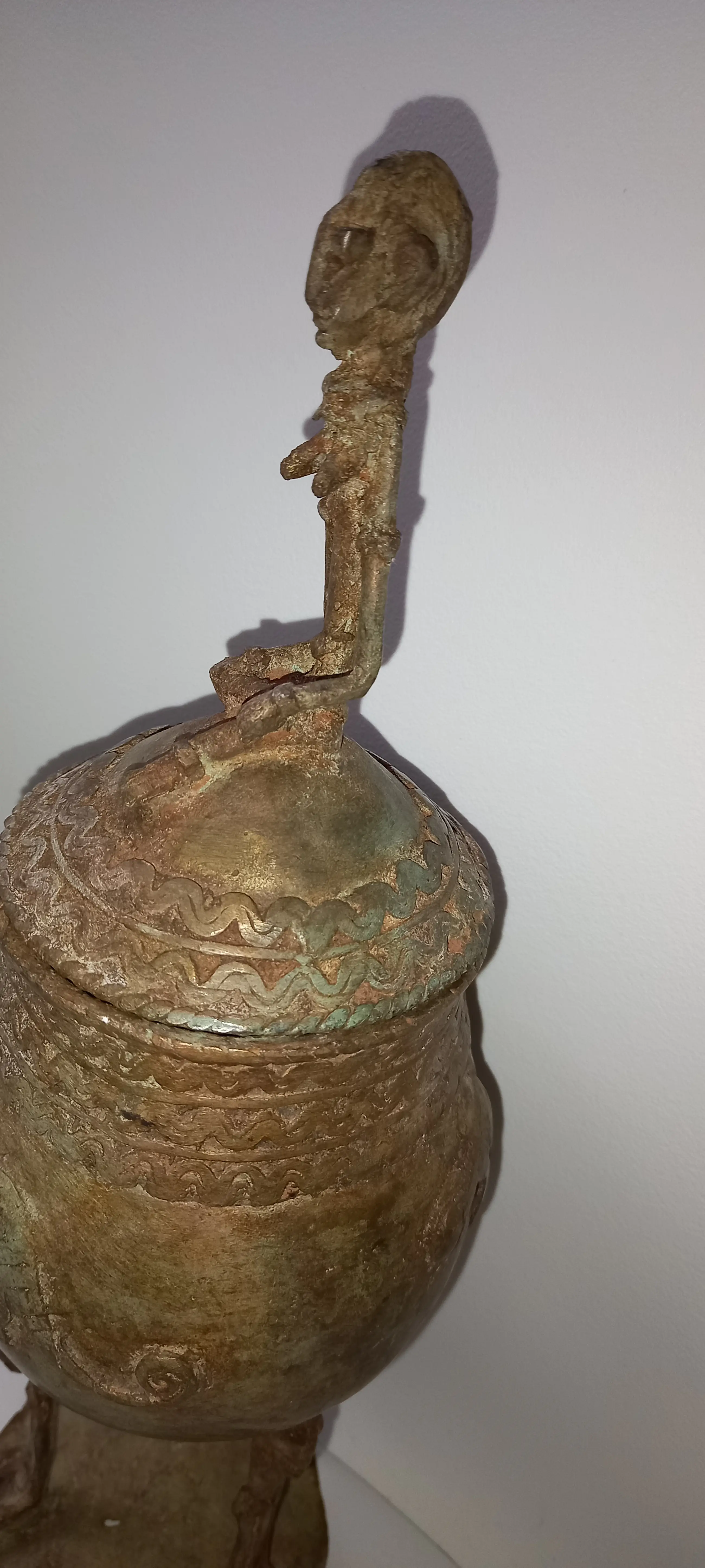 Dogon pot uit Mali om goud te bewaren bewaakt door een geestelijk vrouw op de deksel , 3 onder de pot en 3 dieren rond de pot.