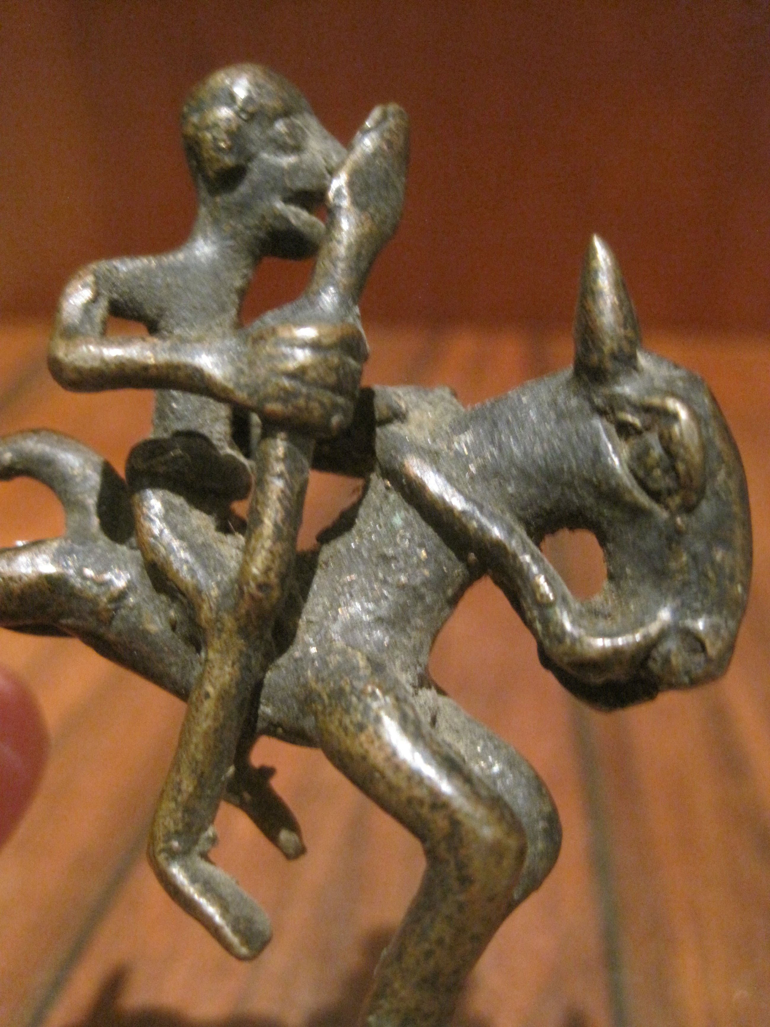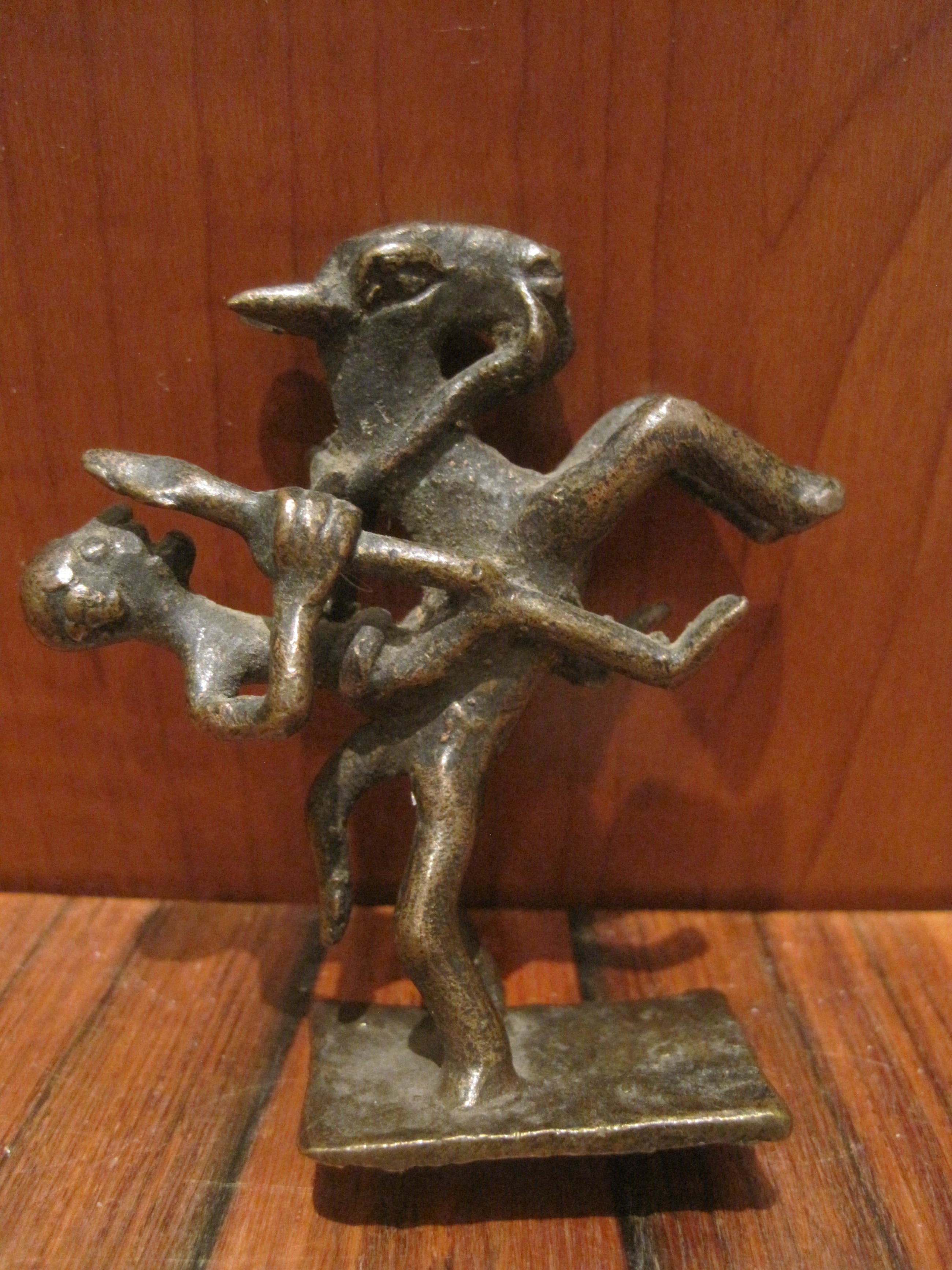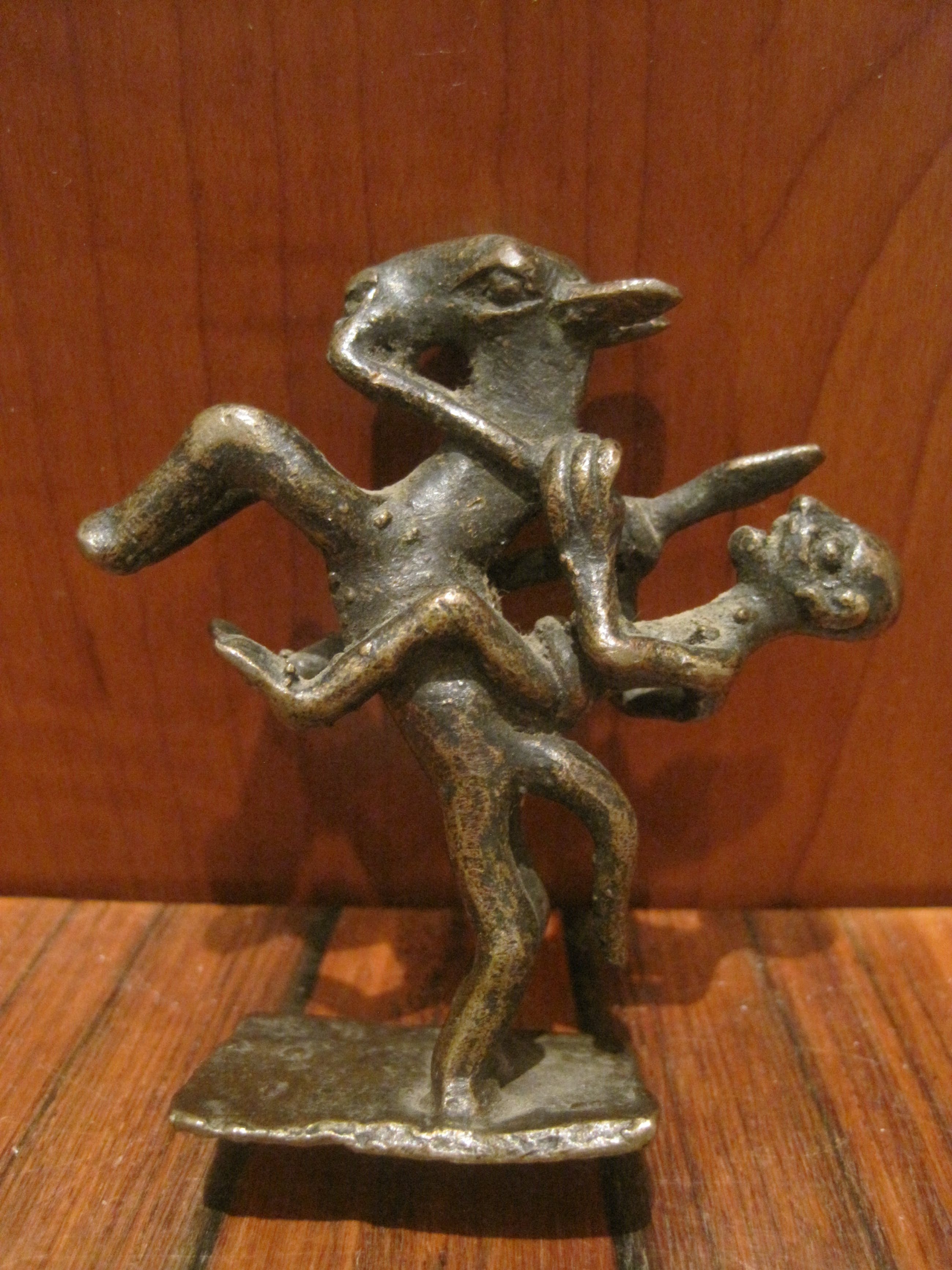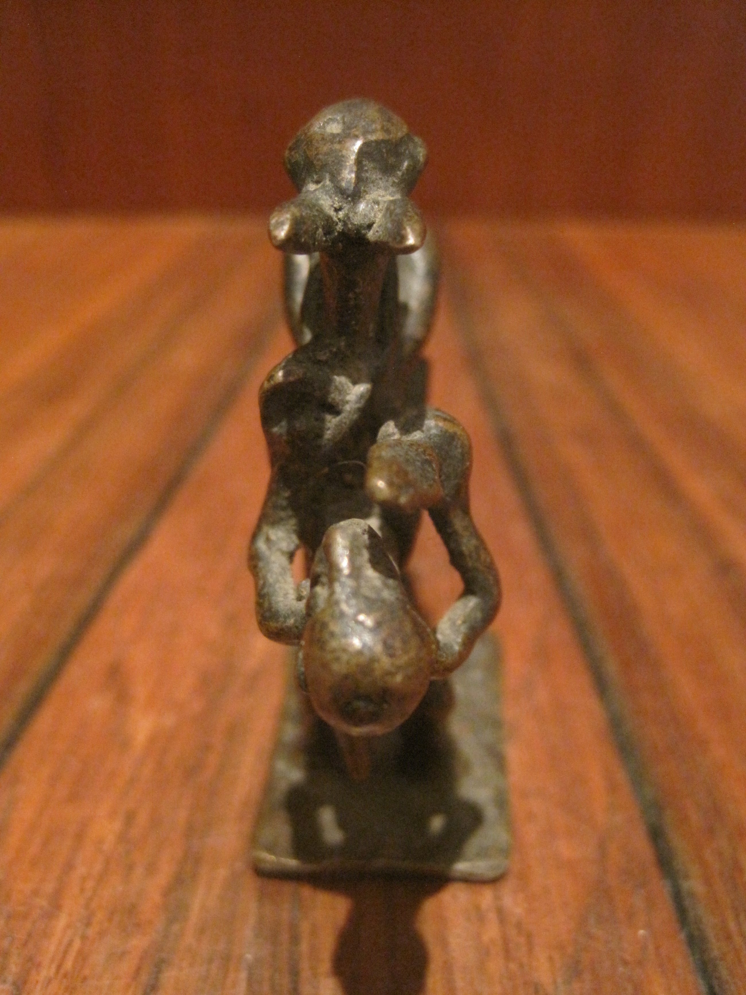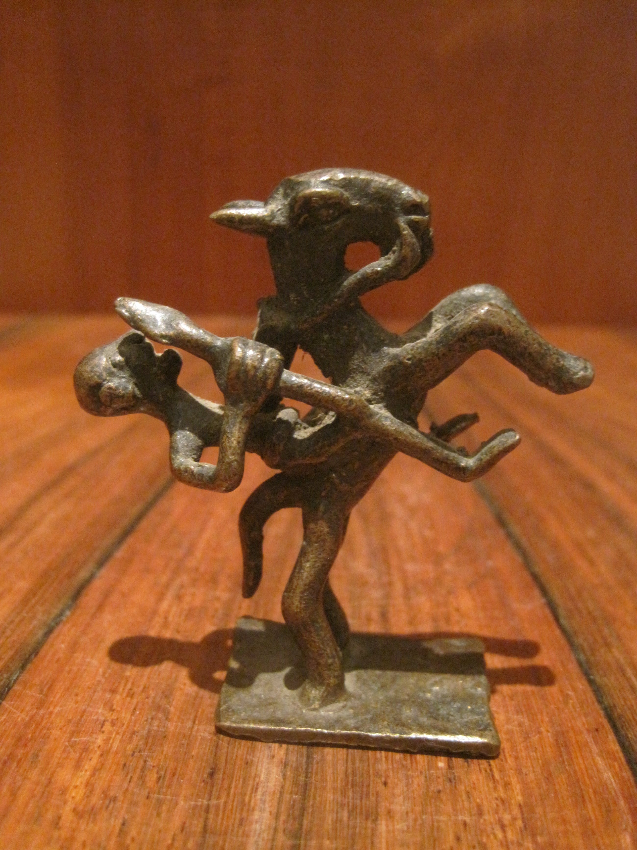 Een prachtig goudgewicht in de vorm van een ruiter op een steigerend paard. De ruiter heeft een korte speer in zijn hand. De ruiter behoord tot het Dogon volk en is te herkennen aan het typische korte baardje. Dit goudgewicht is veel gebruikt en is daardoor glad gesleten. Het beeldje heeft een fraai patina.