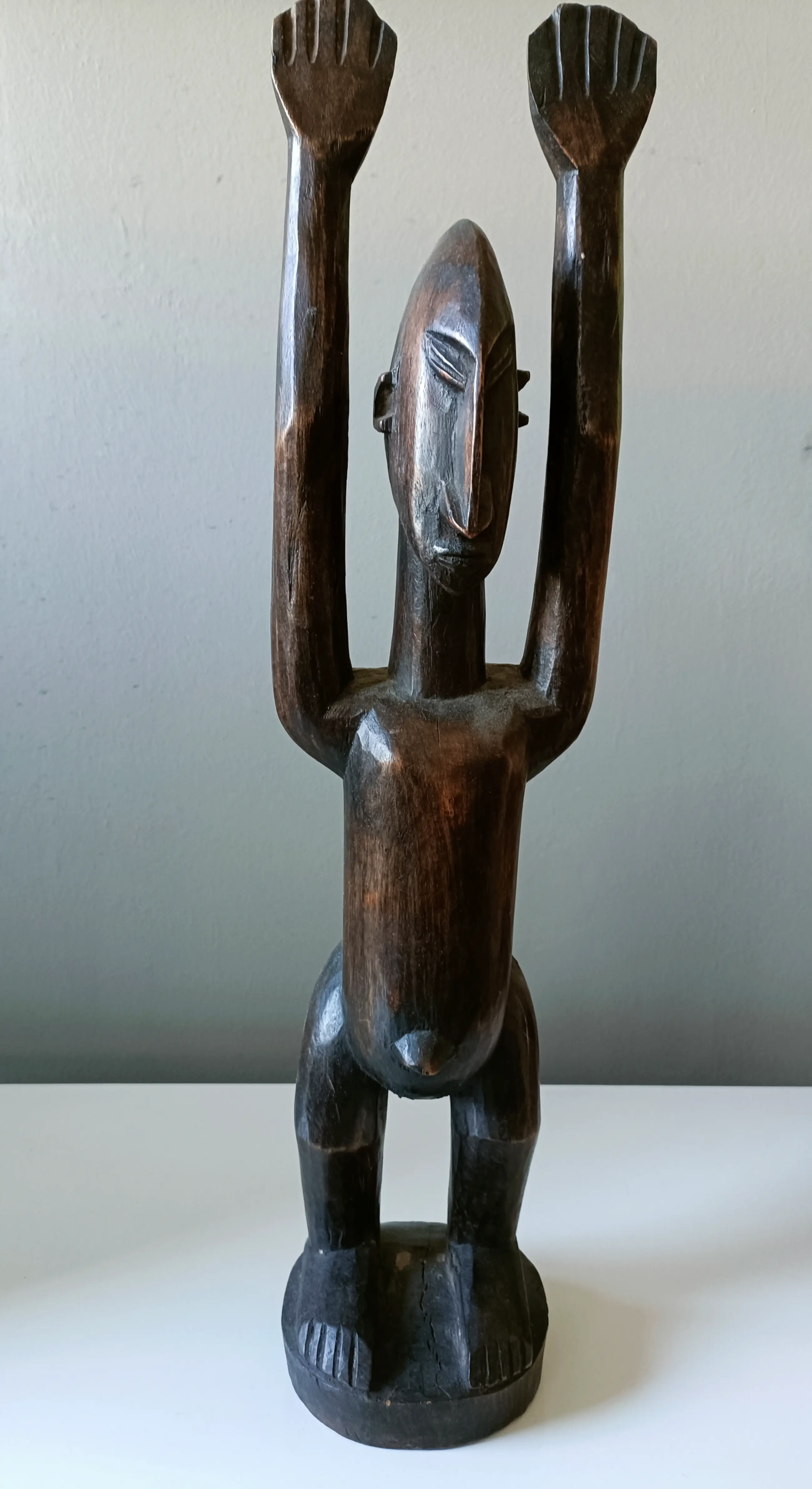 Mooi gesneden hardhouten beeld van de Dogon uit Mali. Figuur met geheven armen en