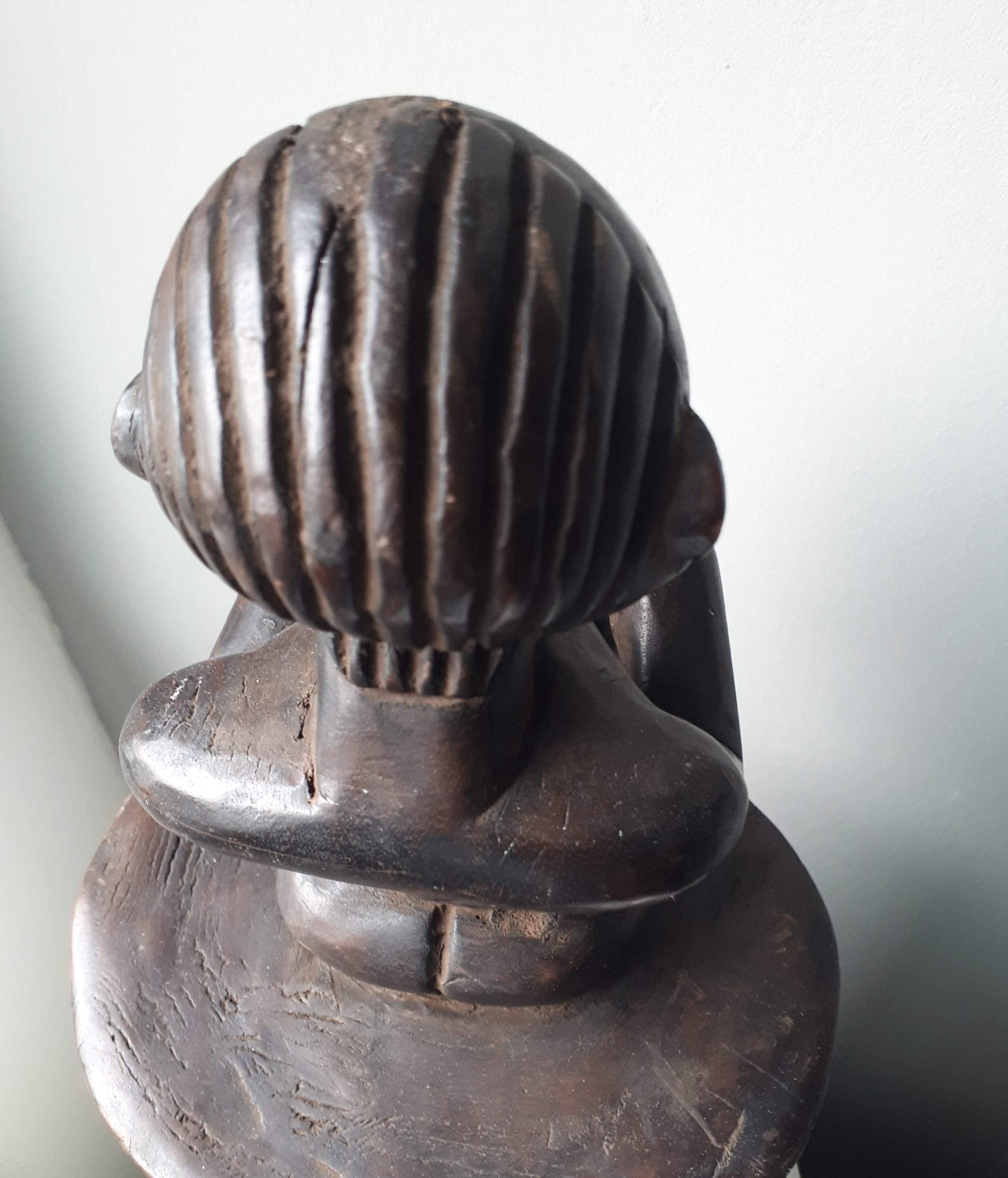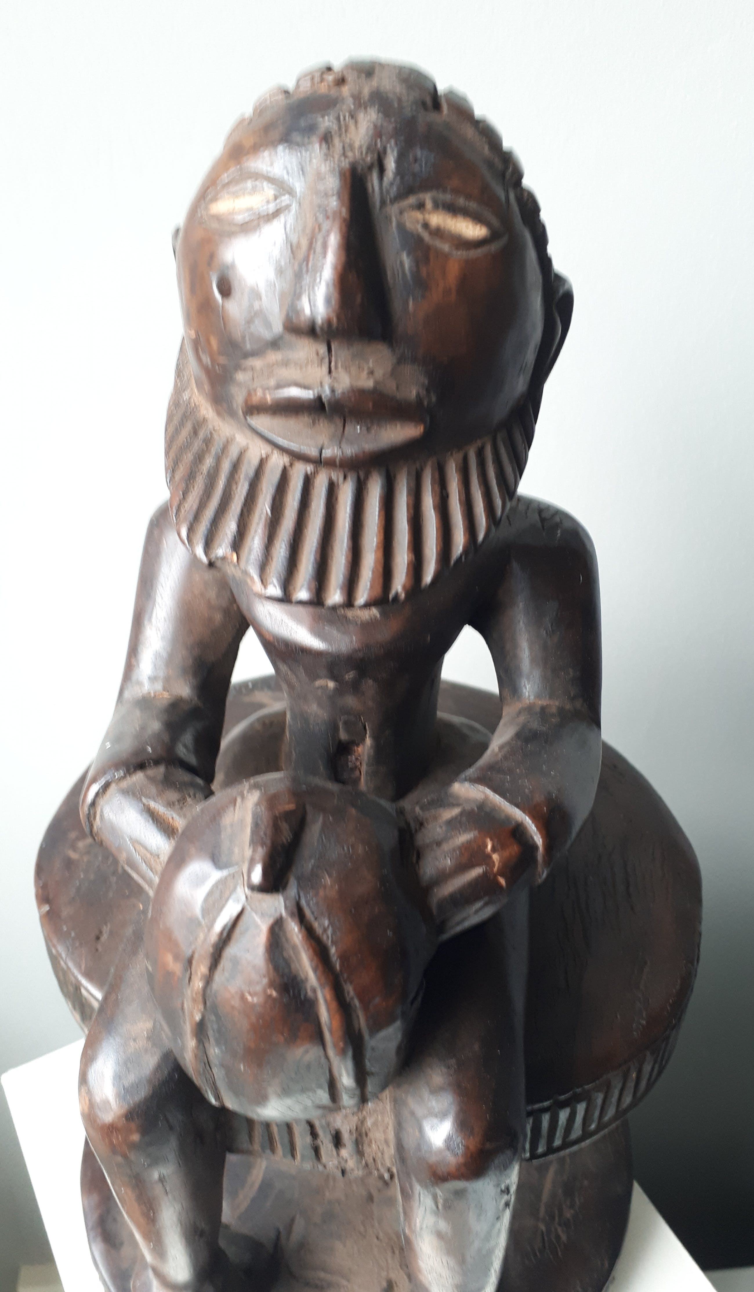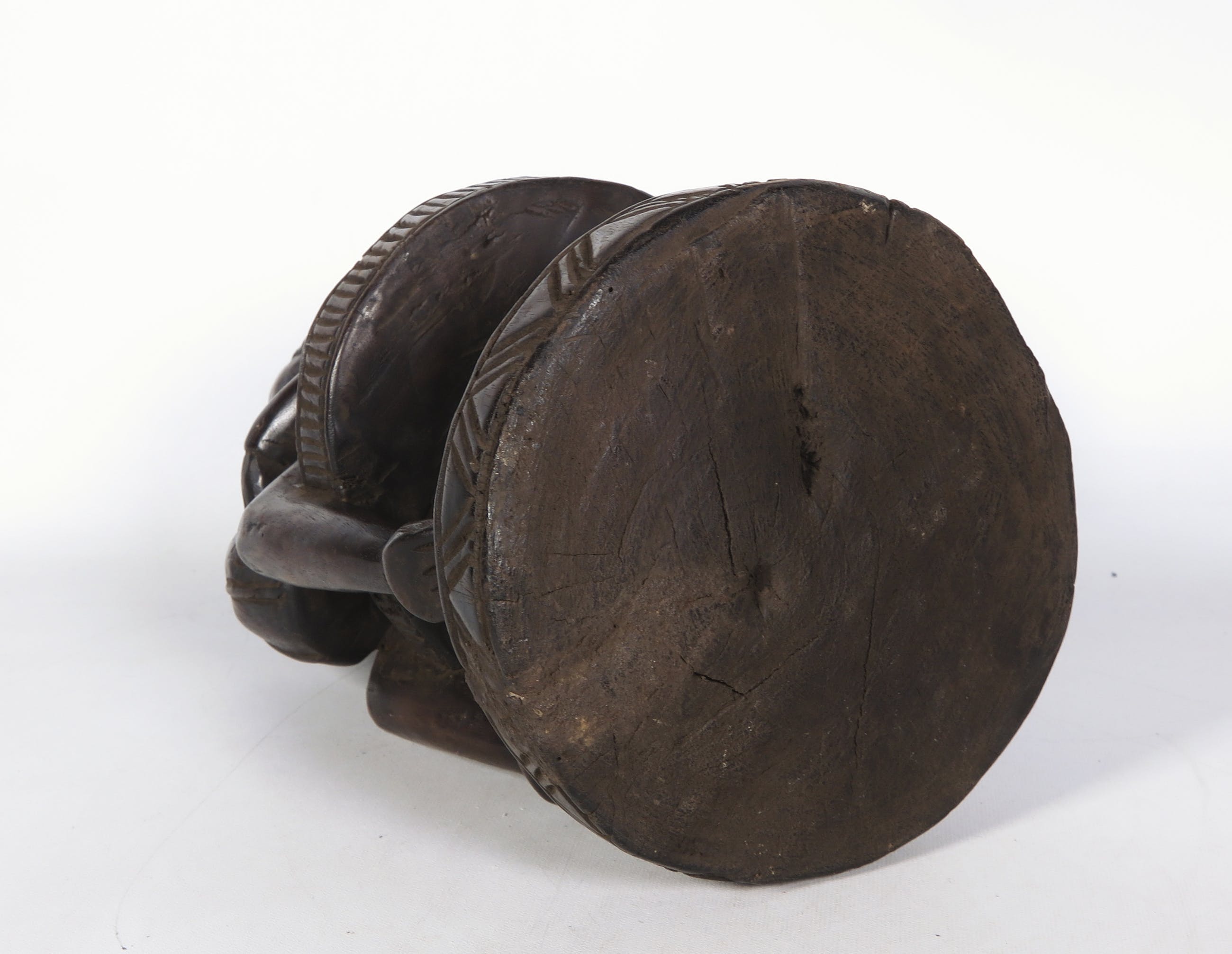een watervat in zijn handen. Het beeld wordt aan de achterzijde ondersteund door een kleinere persoon. Afkomstig uit Midden-Mali, Dogon.