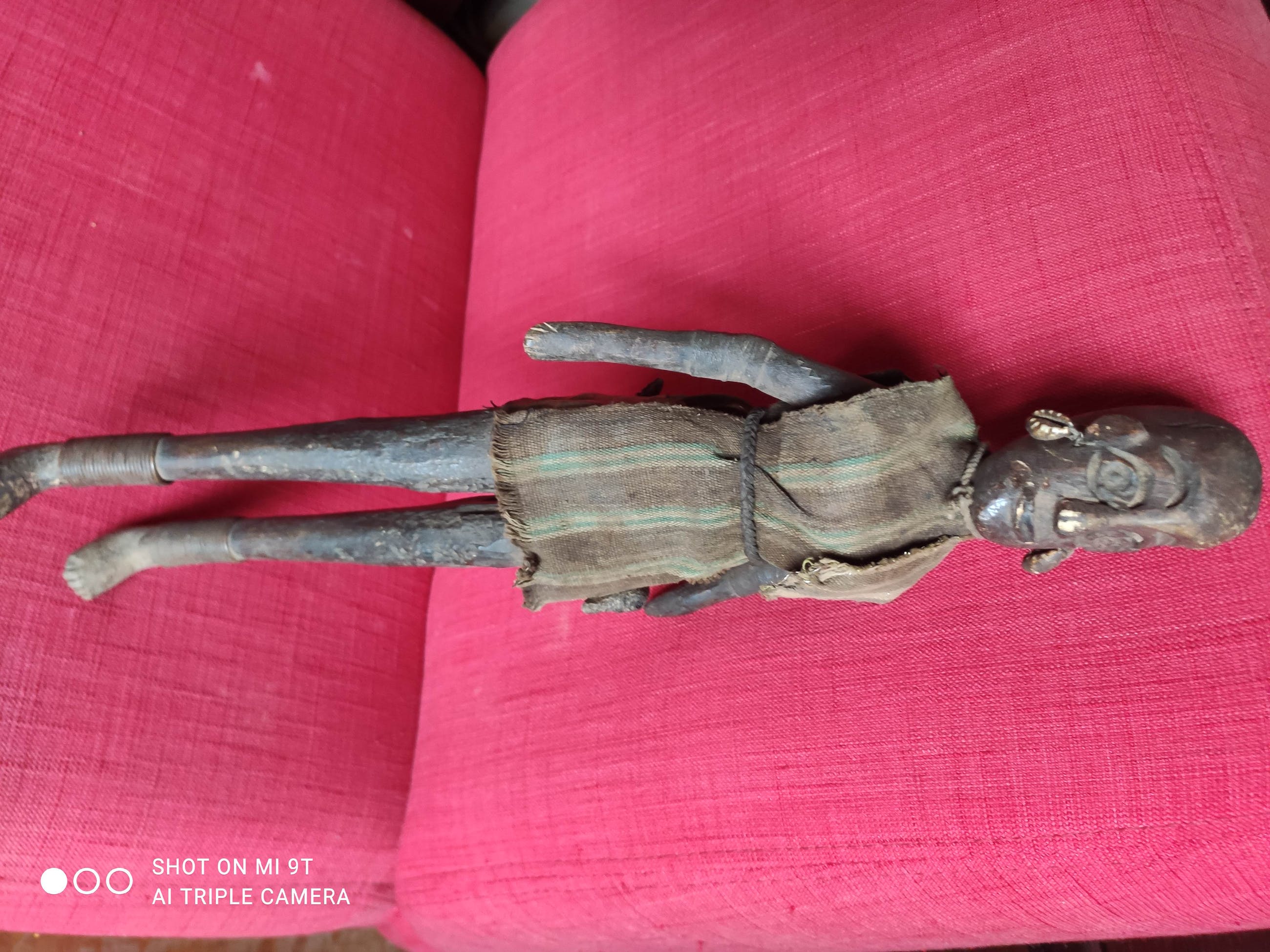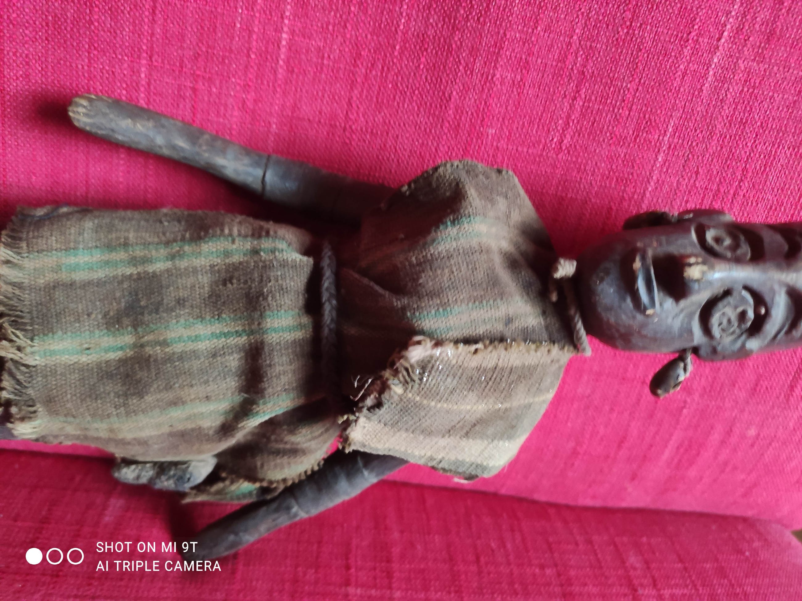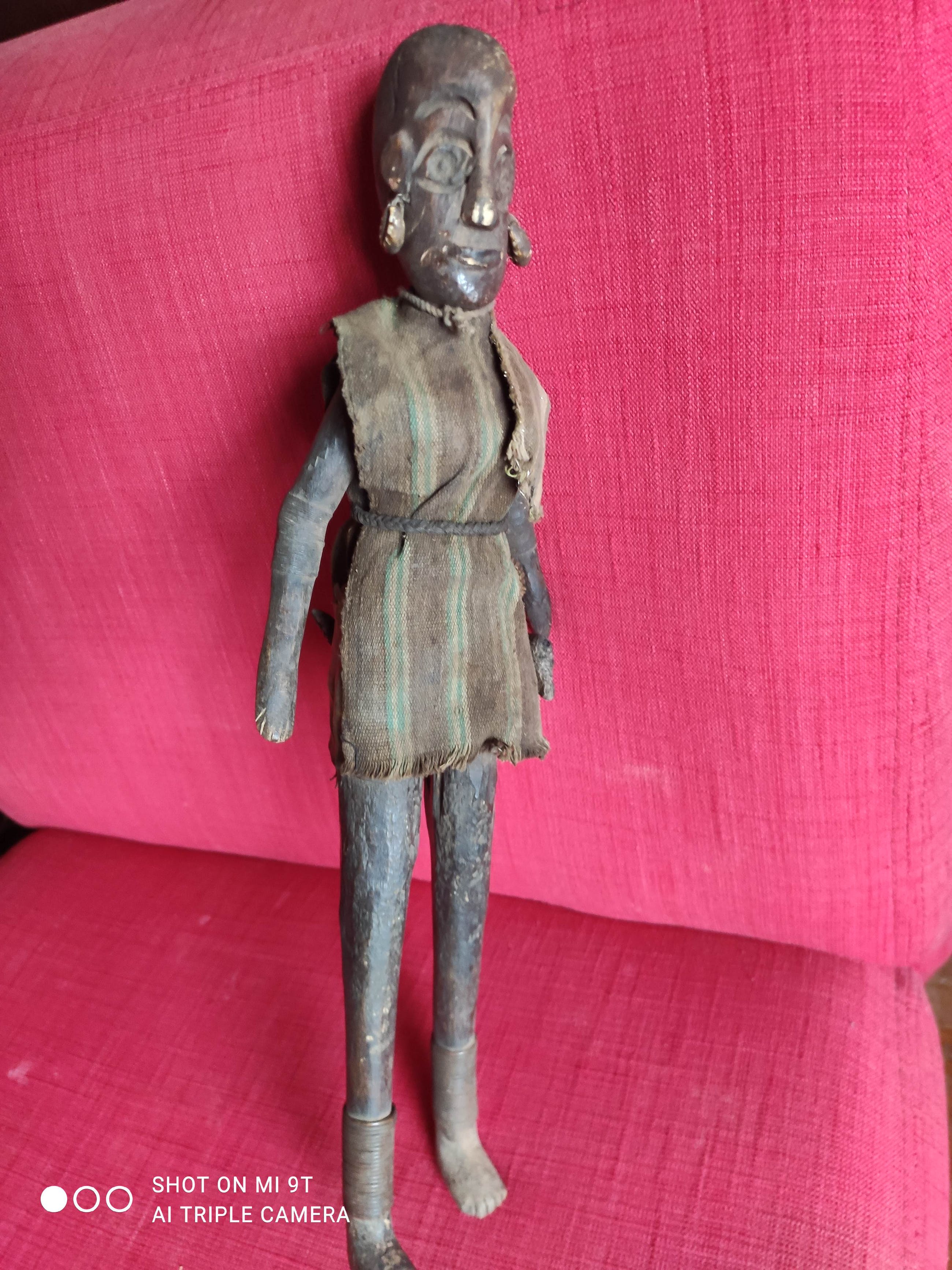 aangeklede traditionele houten pop, met katoen, ketting, oorhangers,