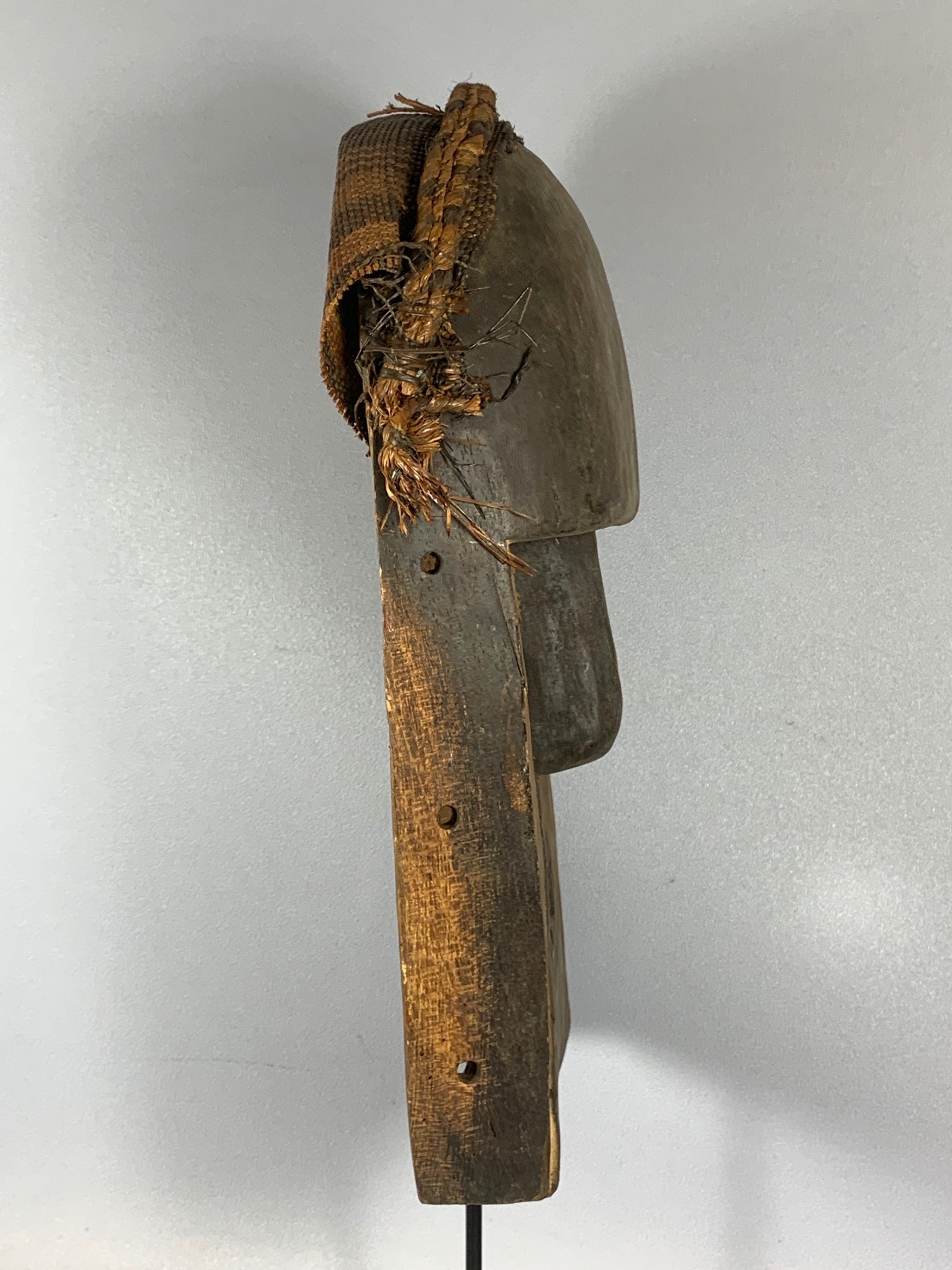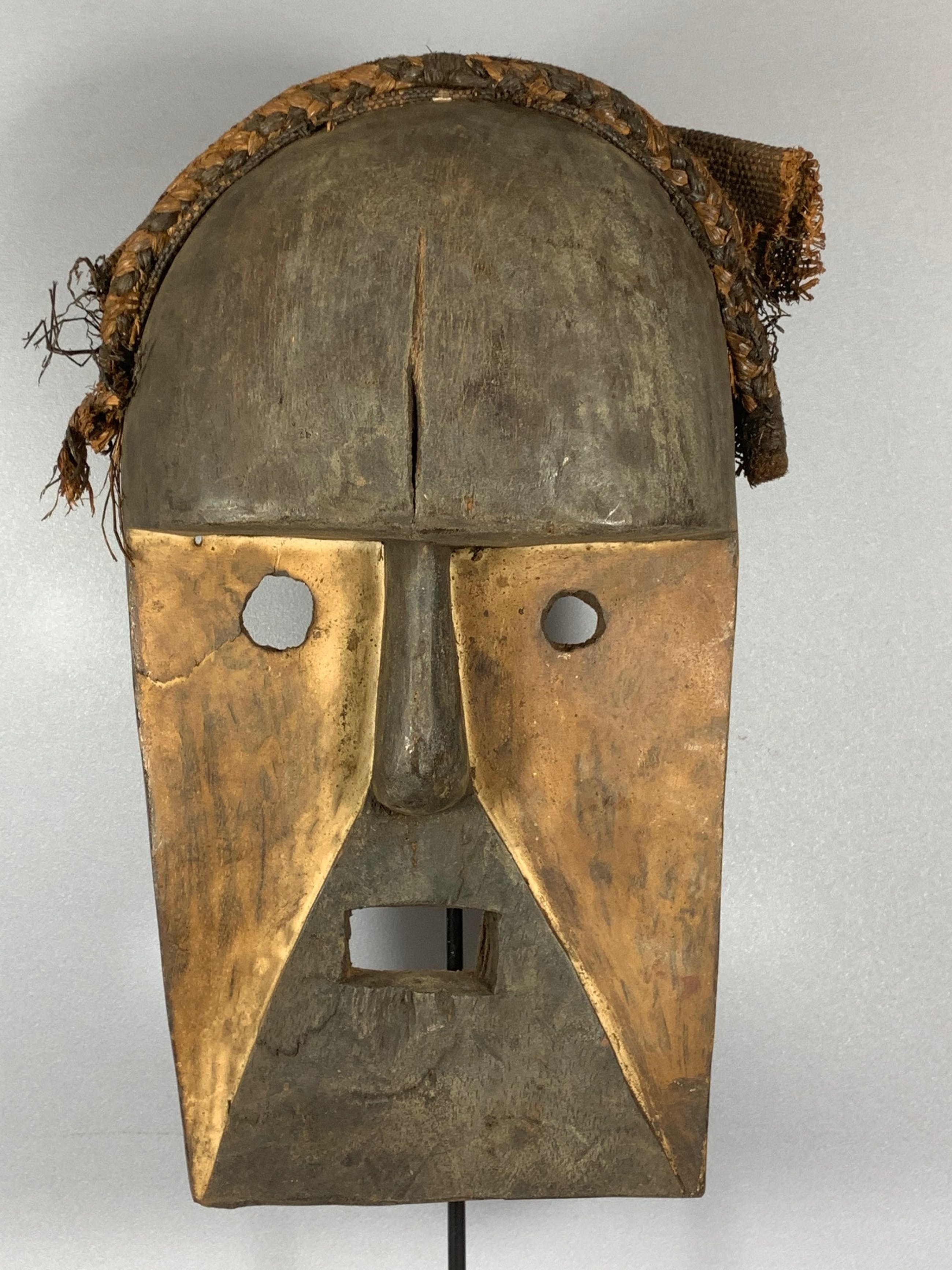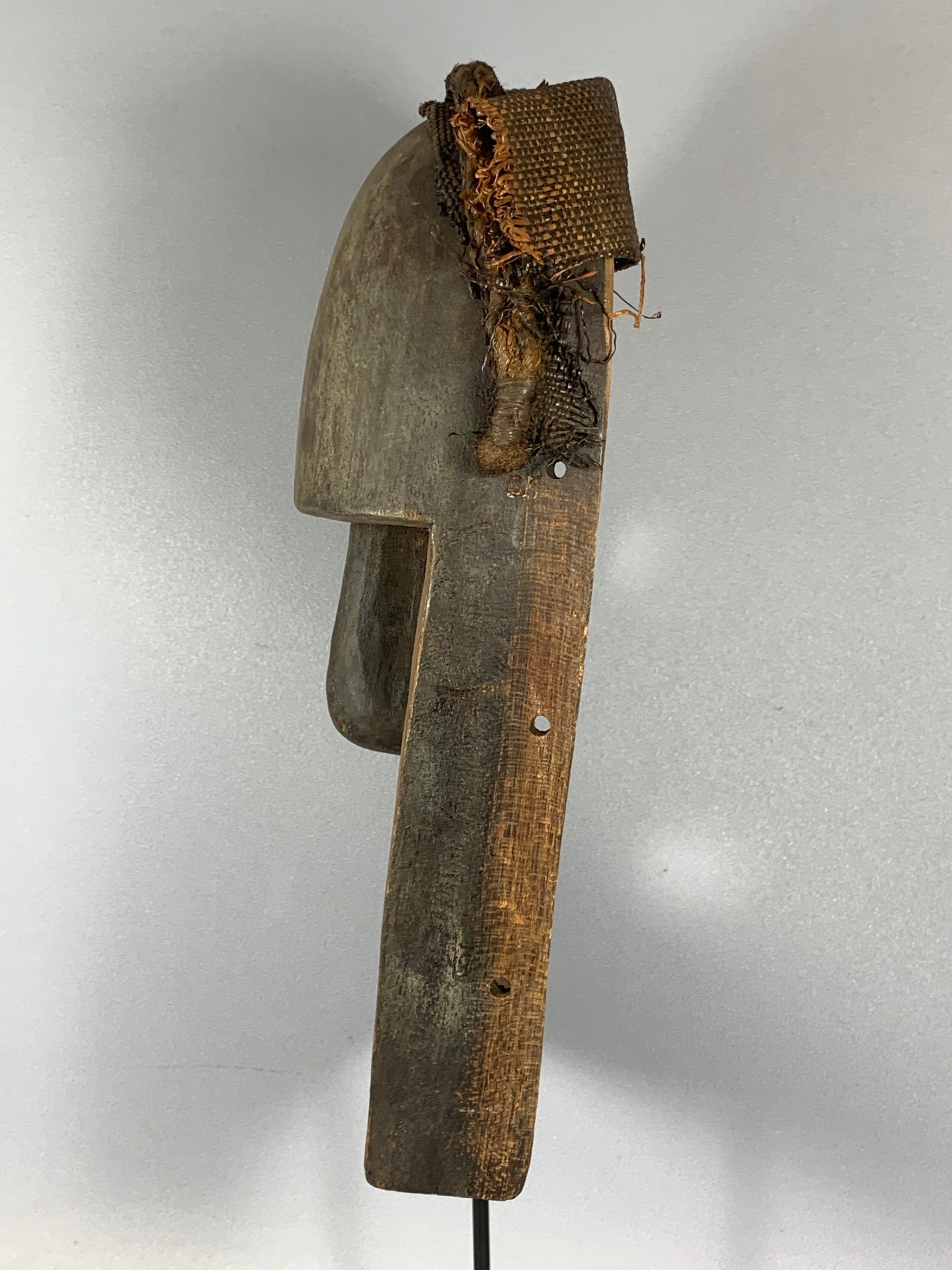 This tribe is located in the Ogooue River region in Gabon. The Aduma are the great boatmen of the Ogooue. They believe in a God who made the world, in an immortal soul and in retribution for evil; they worship spirits and ghosts, and are under the sway of sorcerers and secret societies, to which even the authority of their chiefs must yield. Remarkable are their masks with flat surface for face, domed forehead, an angular nose, an interesting interplay of flat, convex, and angular forms. These masks are mostly polychrome, some with a painted design pattern. For the last half-century these masks have been used for celebratory dances associated with the major social rituals. Their former role is less well documented.