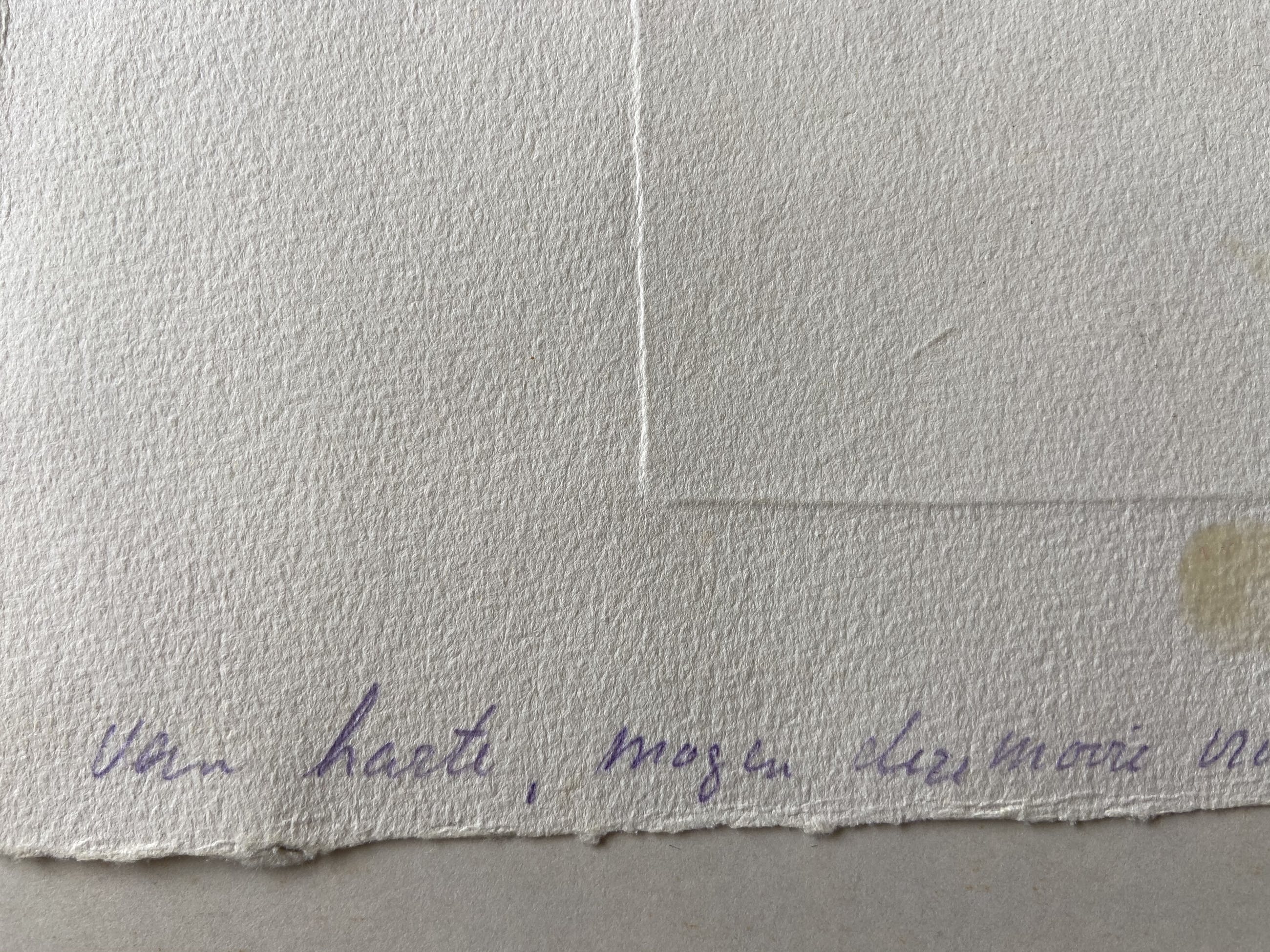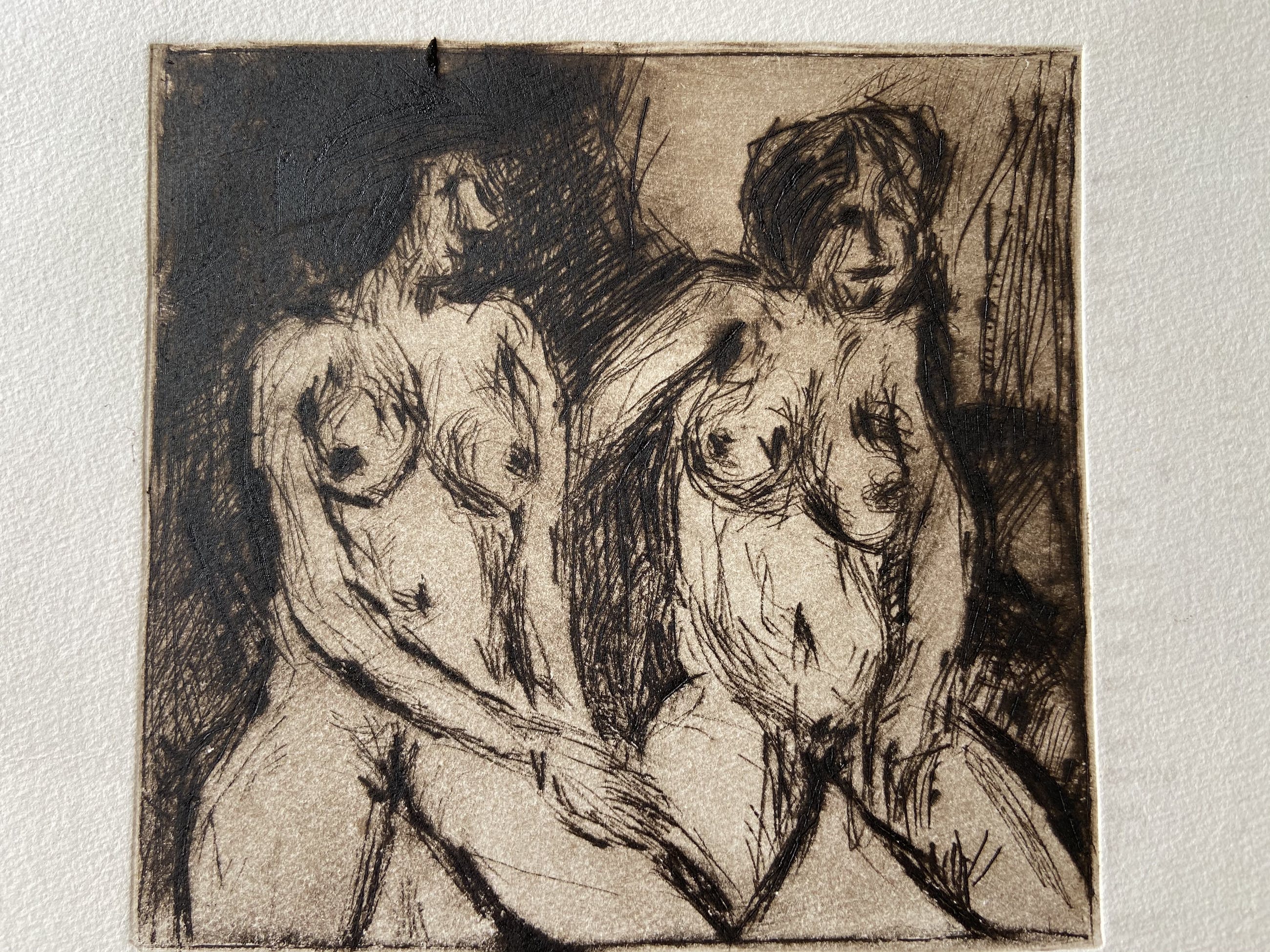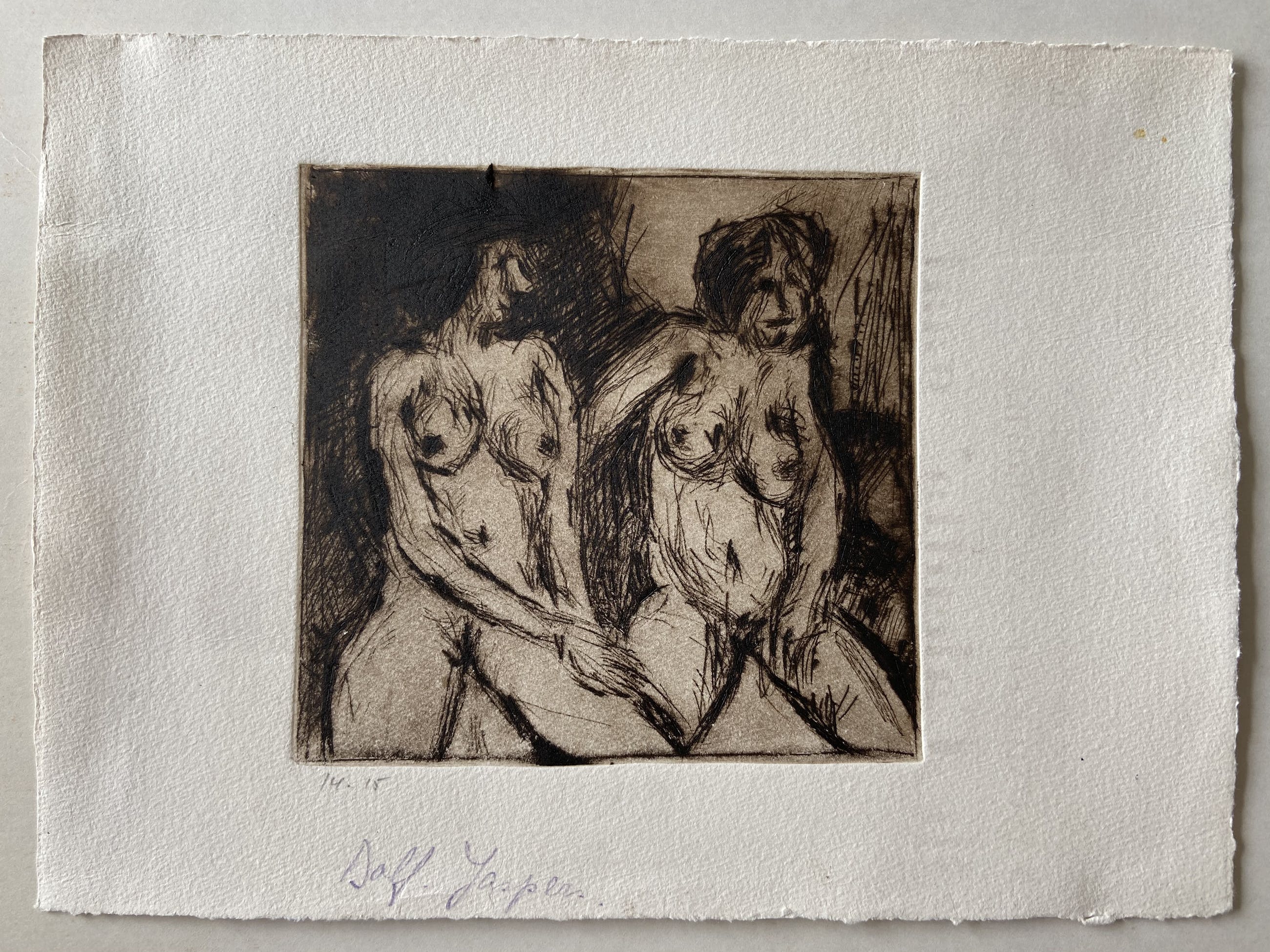 op achterkant geschreven met potlood: 'Van harte, mogen deze mooie vrouwen je leven verrijken. Ann Jaspers' (echtgenoot van Dolf) formaat ets zelf is 13,5 x 14 cm.