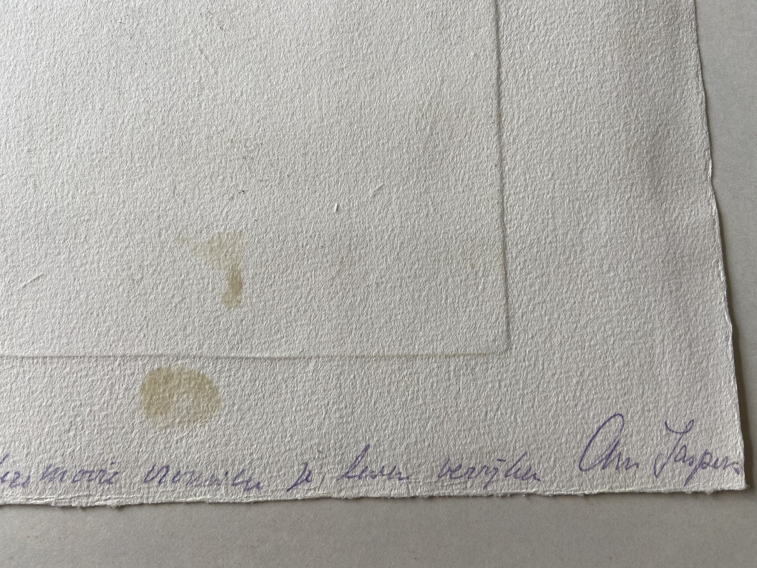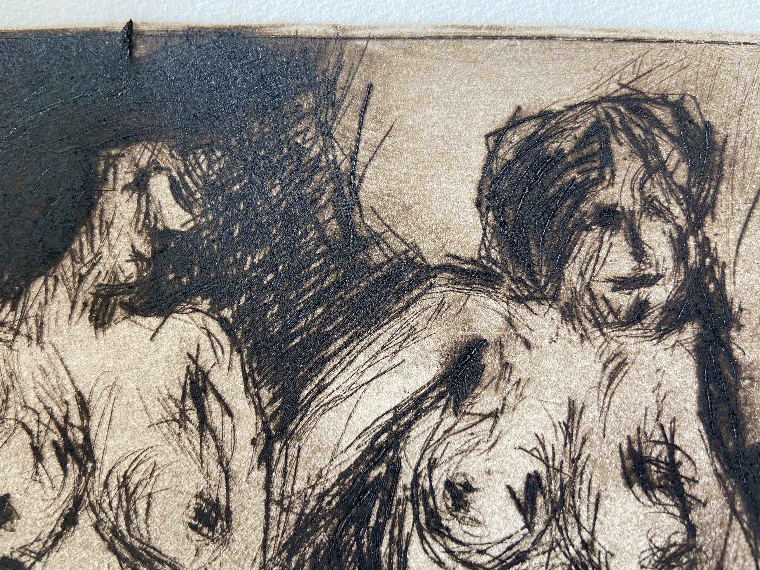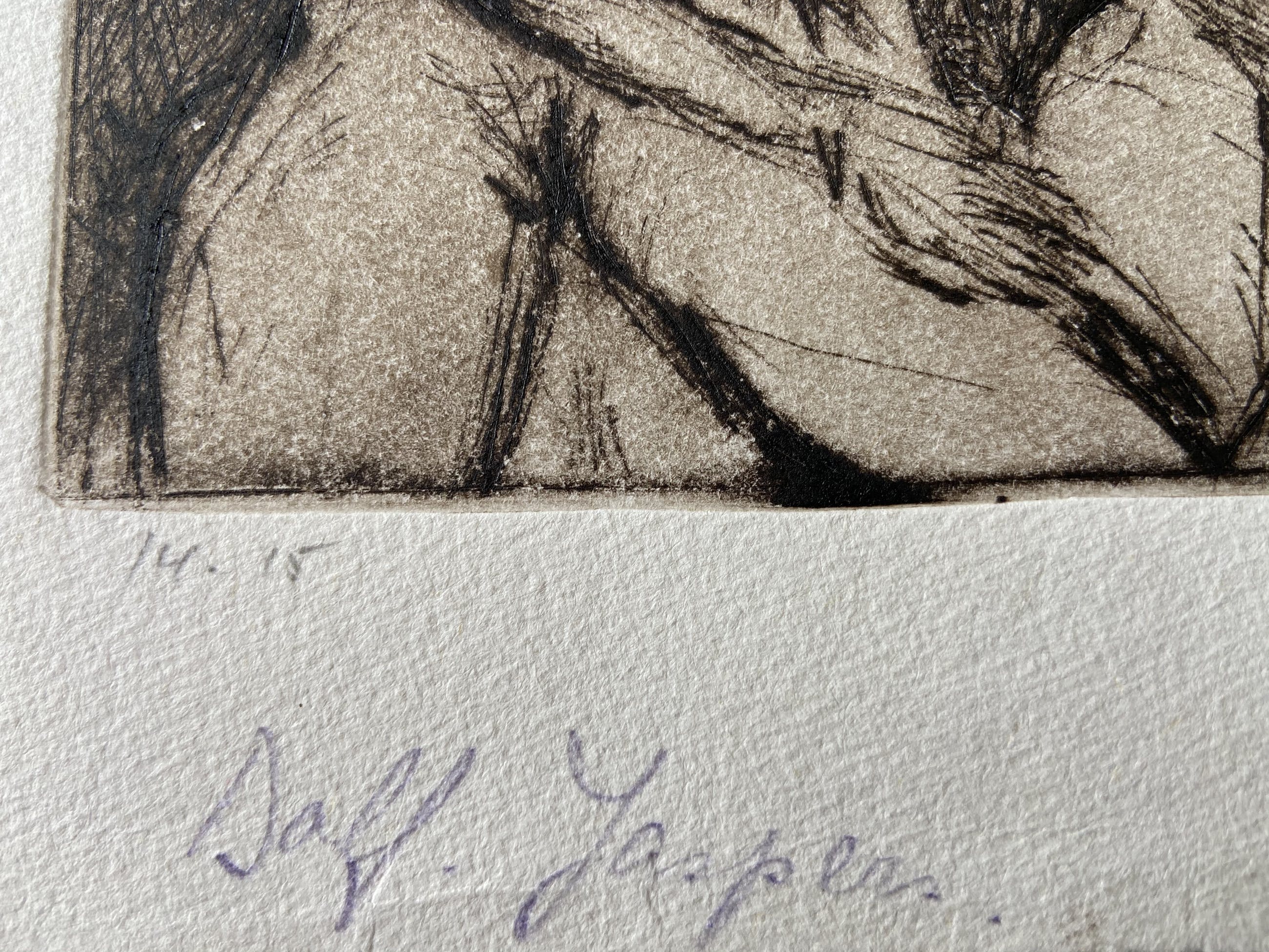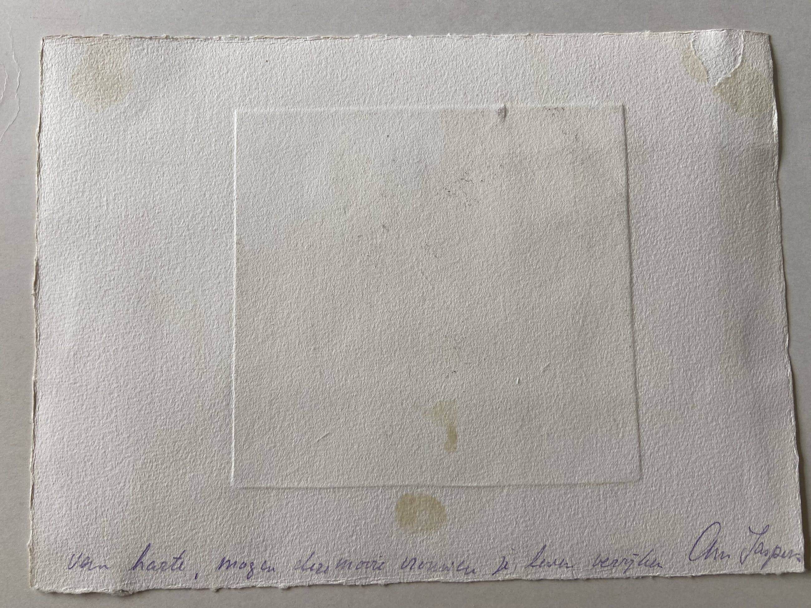 op achterkant geschreven met potlood: 'Van harte, mogen deze mooie vrouwen je leven verrijken. Ann Jaspers' (echtgenoot van Dolf) formaat ets zelf is 13,5 x 14 cm.