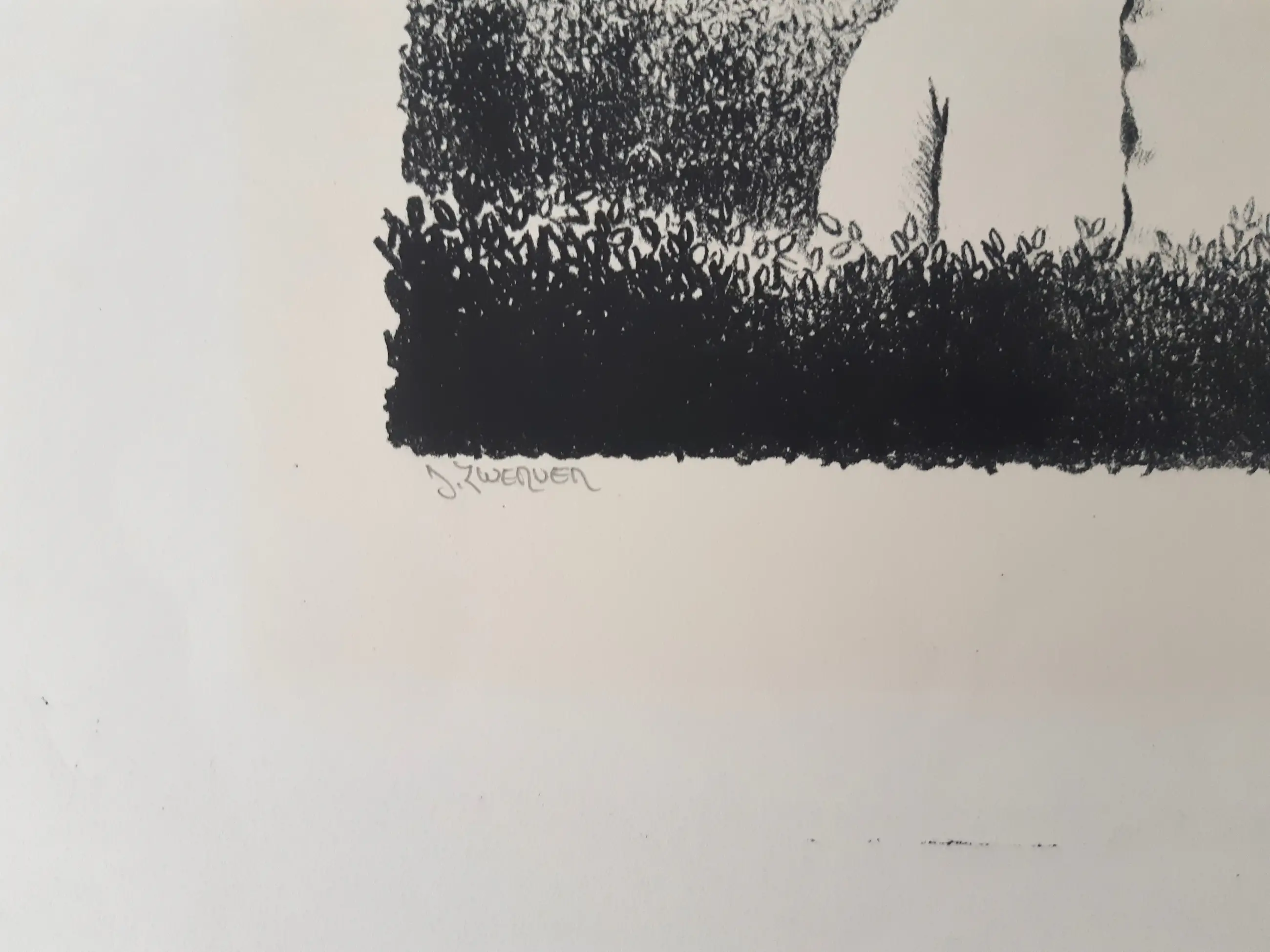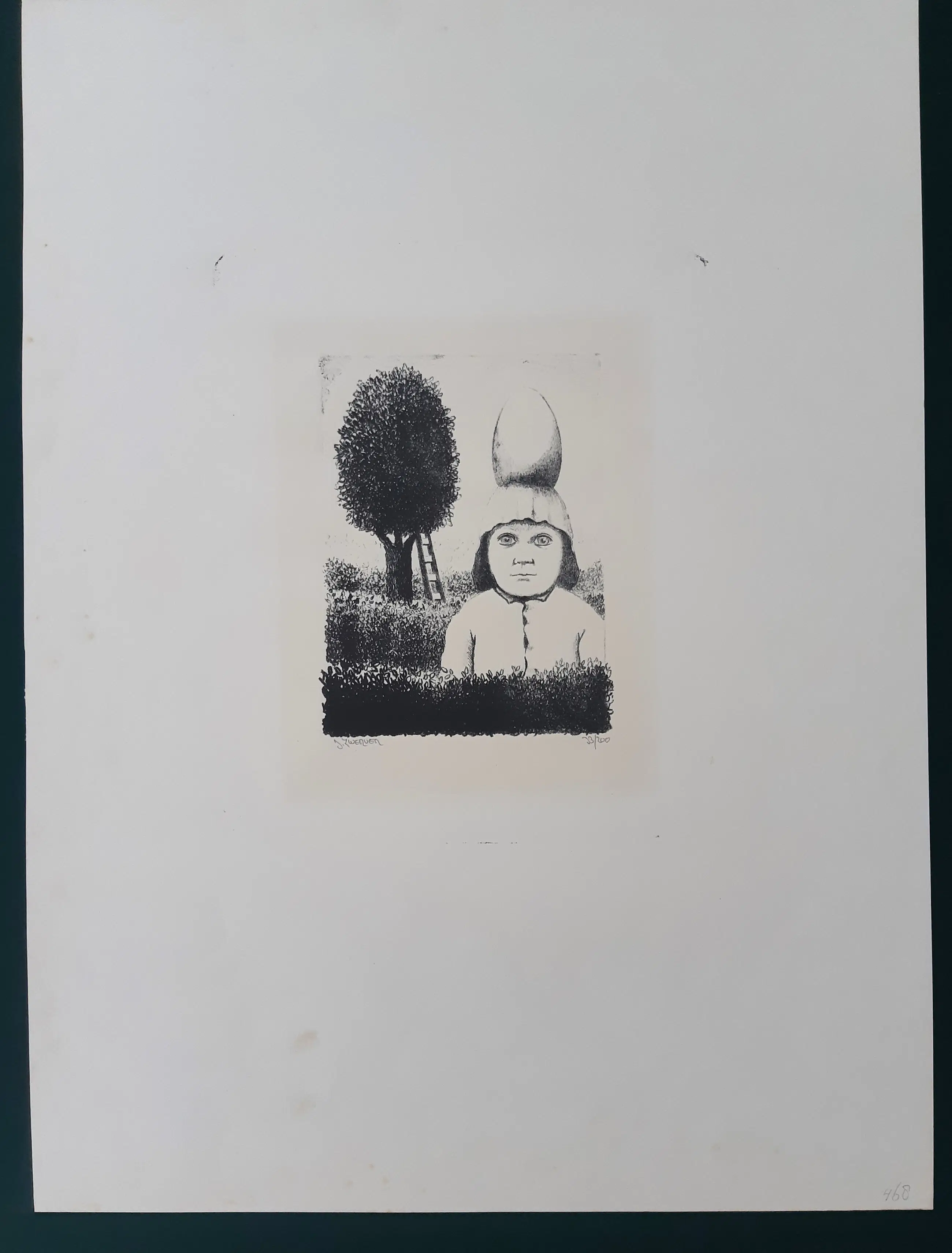 Ets van Dolf Zwerver, met potlood gesigneerd en genummerd. De afbeelding meet 20 x 15 cm. Het zeer ruime blad is enigszins vlekkerig, een rand rond het beeld is vergeeld door eerdere inlijsting. De afbeelding zelf is uitstekend (zie foto's).