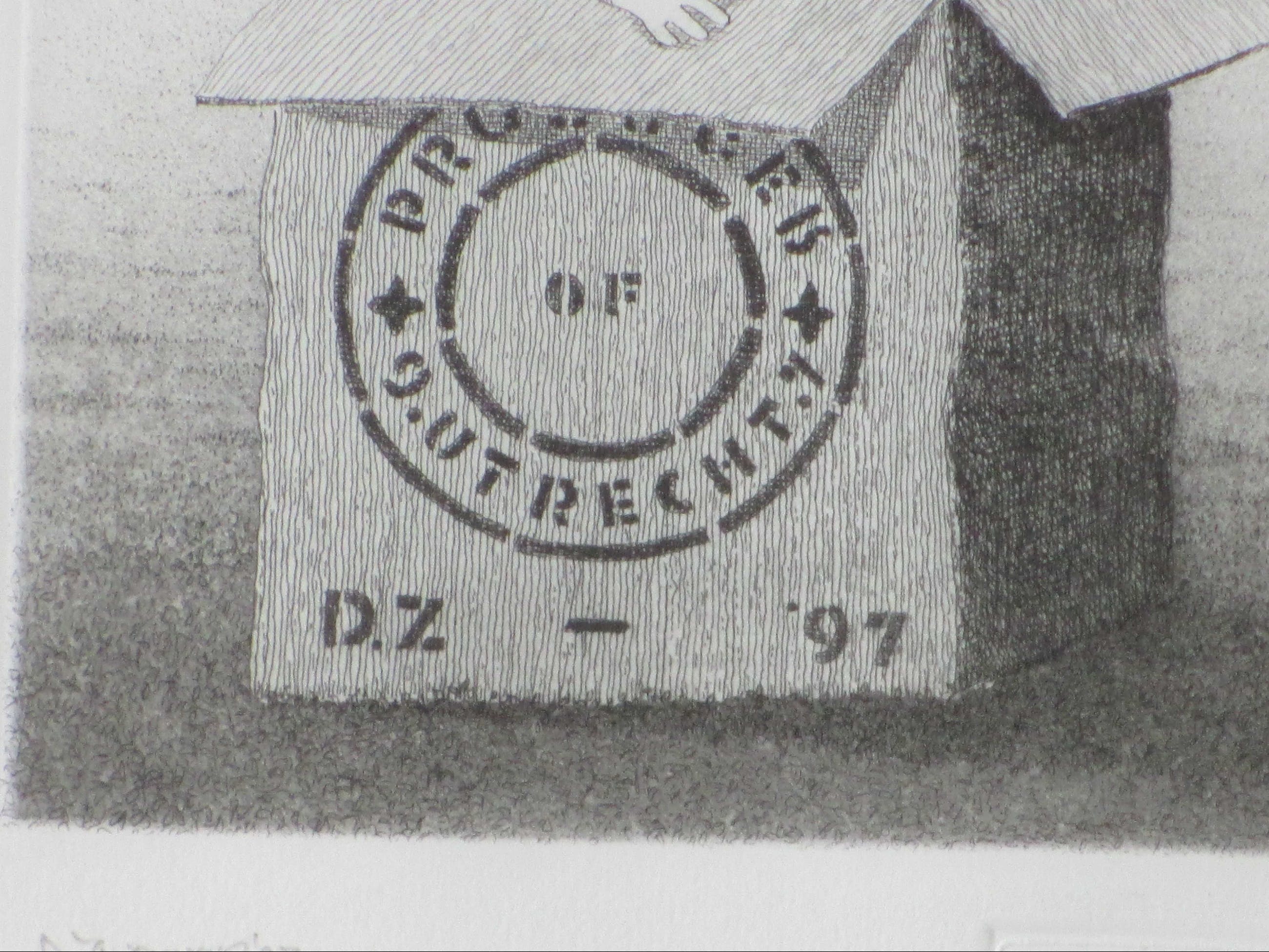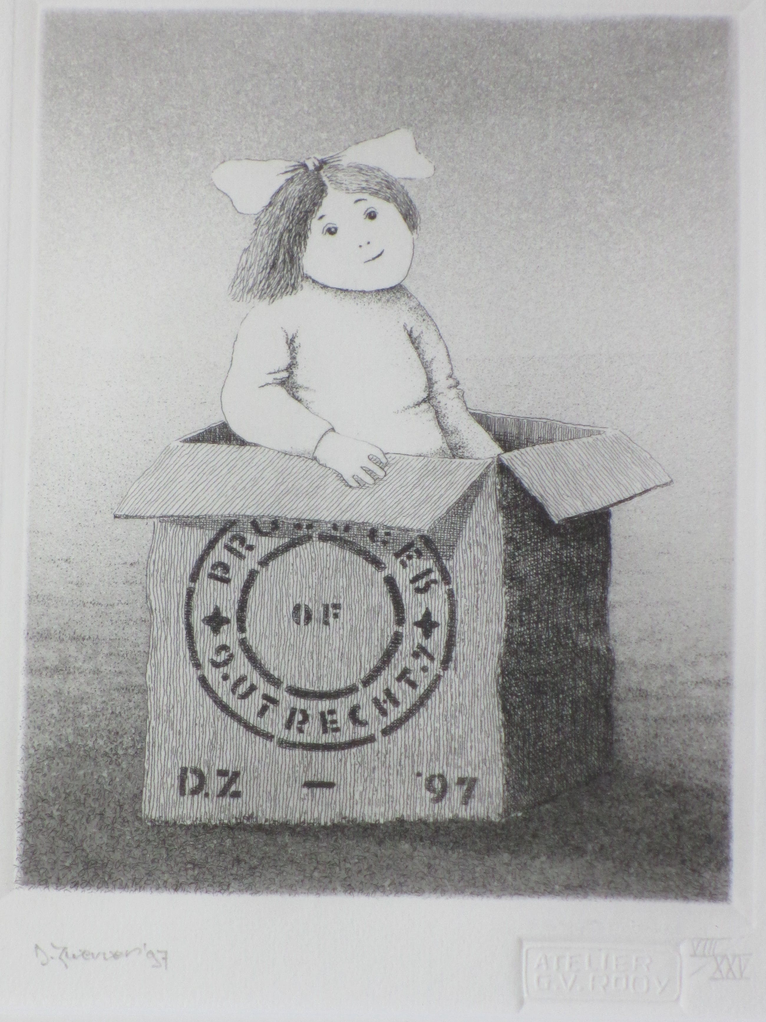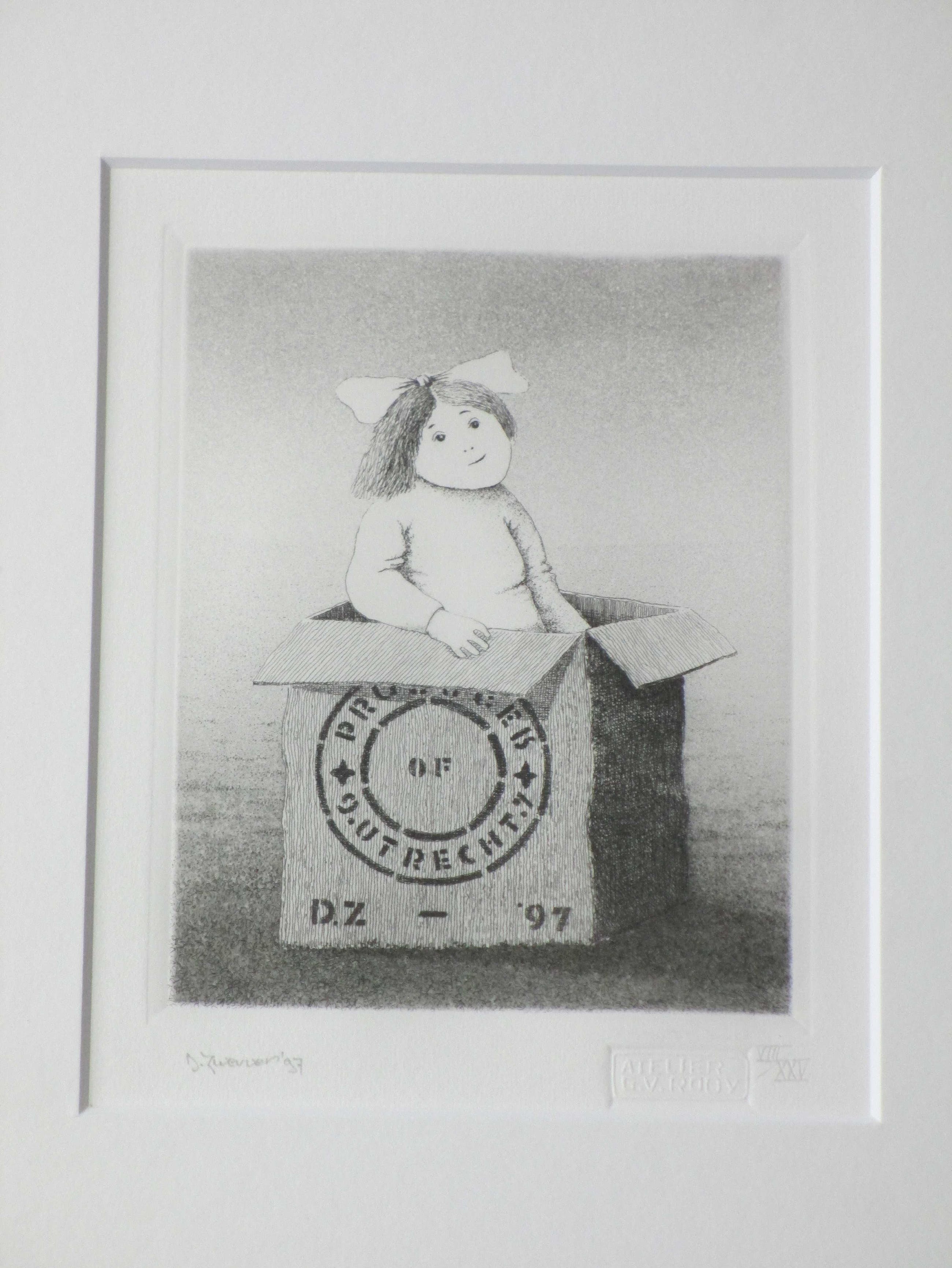 Ets door Dolf Zwerver. Voorstelling van een meisje uit een doos. Gelijst, beeldmaat 14x11, lijstmaat 43x33 Gesigneerd en gedateerd in potlood l.o.: 'D.Zwerver '97' Genummerd in Romeinse cijfers in potlood r.o.: 'VIII/XXV' Blindstempel drukatelier Gerard van Rooy r.o. De lijst heeft een aantal gebruikerssporen. Authenticiteit volledig gegarandeerd.