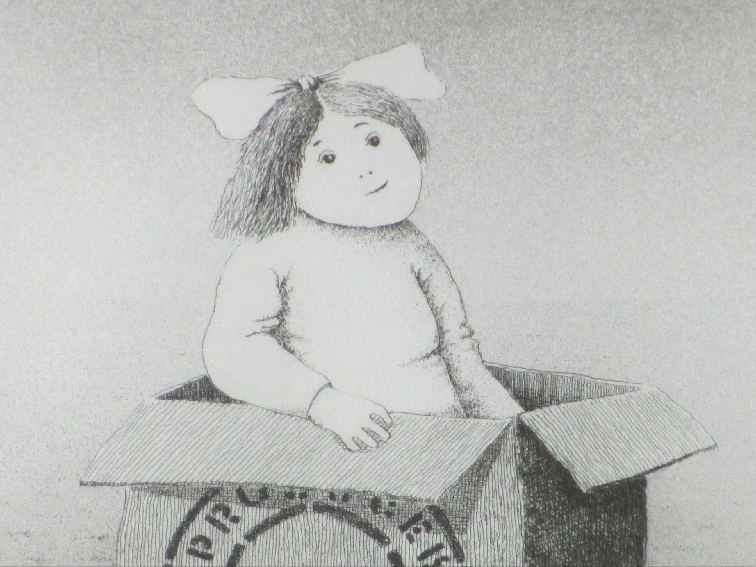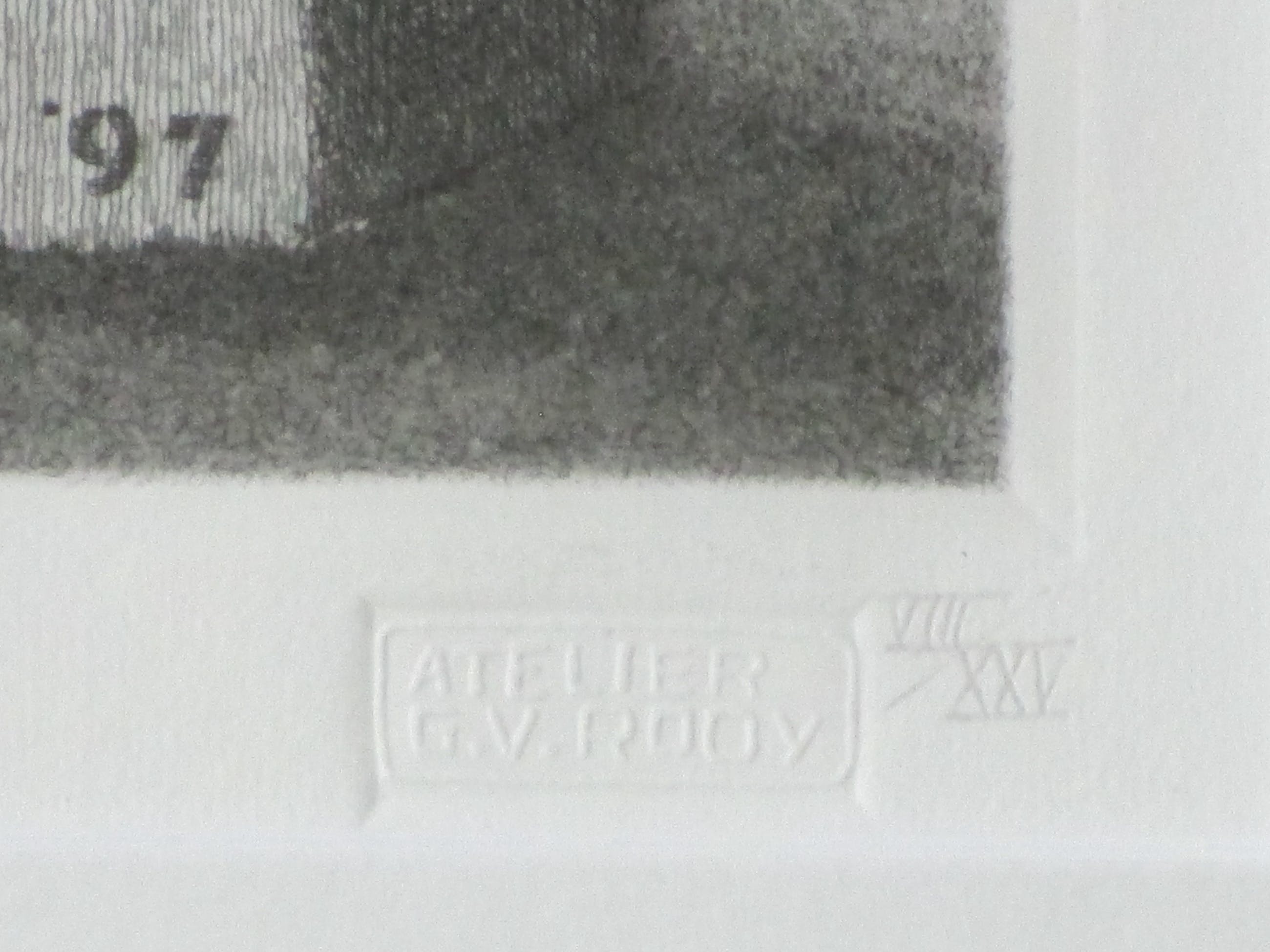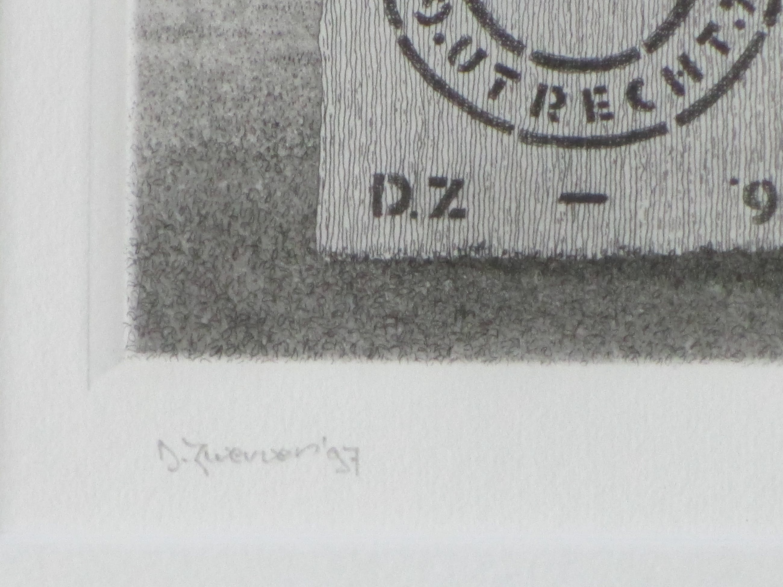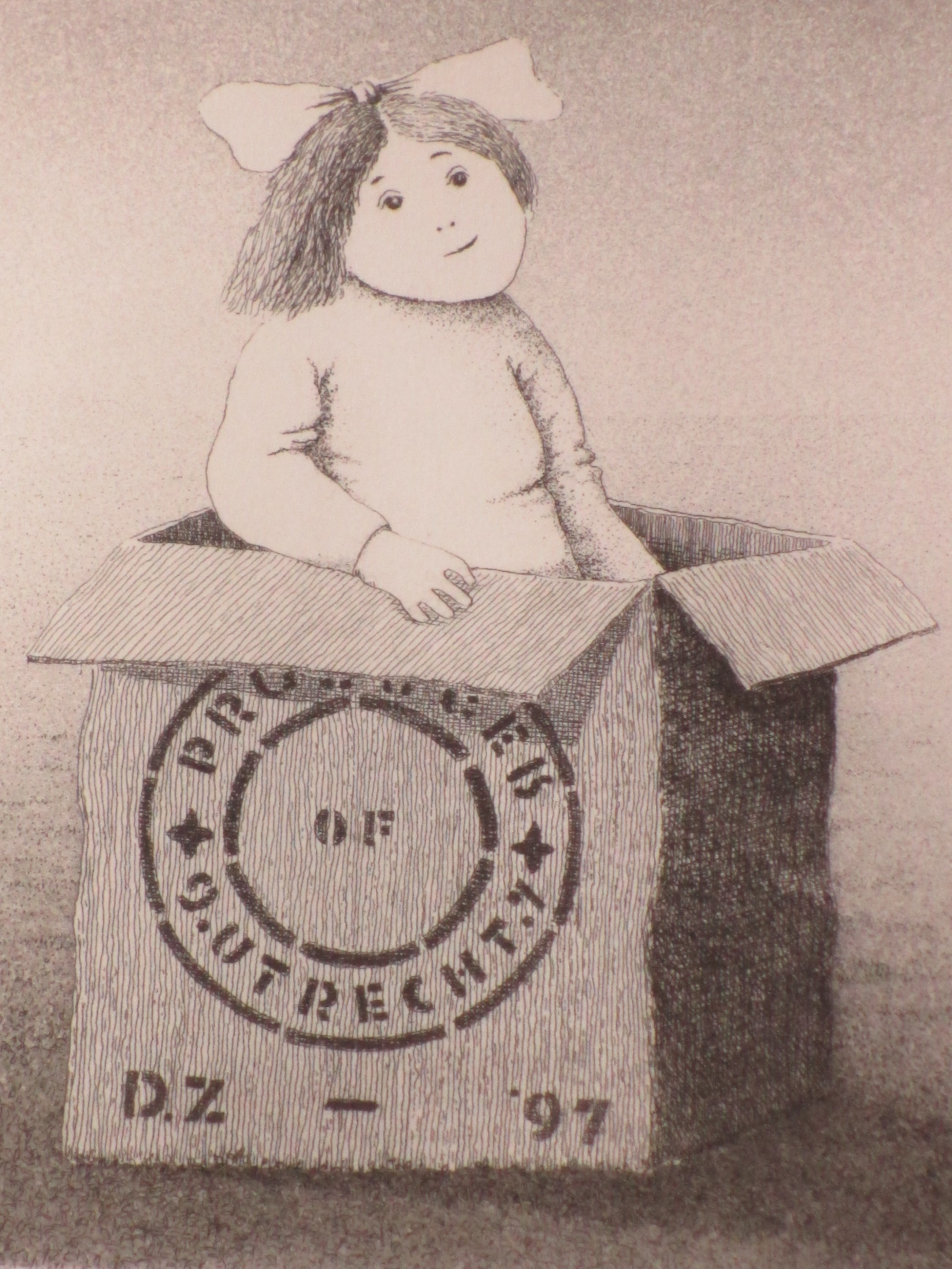 Ets door Dolf Zwerver. Voorstelling van een meisje uit een doos. Gelijst, beeldmaat 14x11, lijstmaat 43x33 Gesigneerd en gedateerd in potlood l.o.: 'D.Zwerver '97' Genummerd in Romeinse cijfers in potlood r.o.: 'VIII/XXV' Blindstempel drukatelier Gerard van Rooy r.o. De lijst heeft een aantal gebruikerssporen. Authenticiteit volledig gegarandeerd.