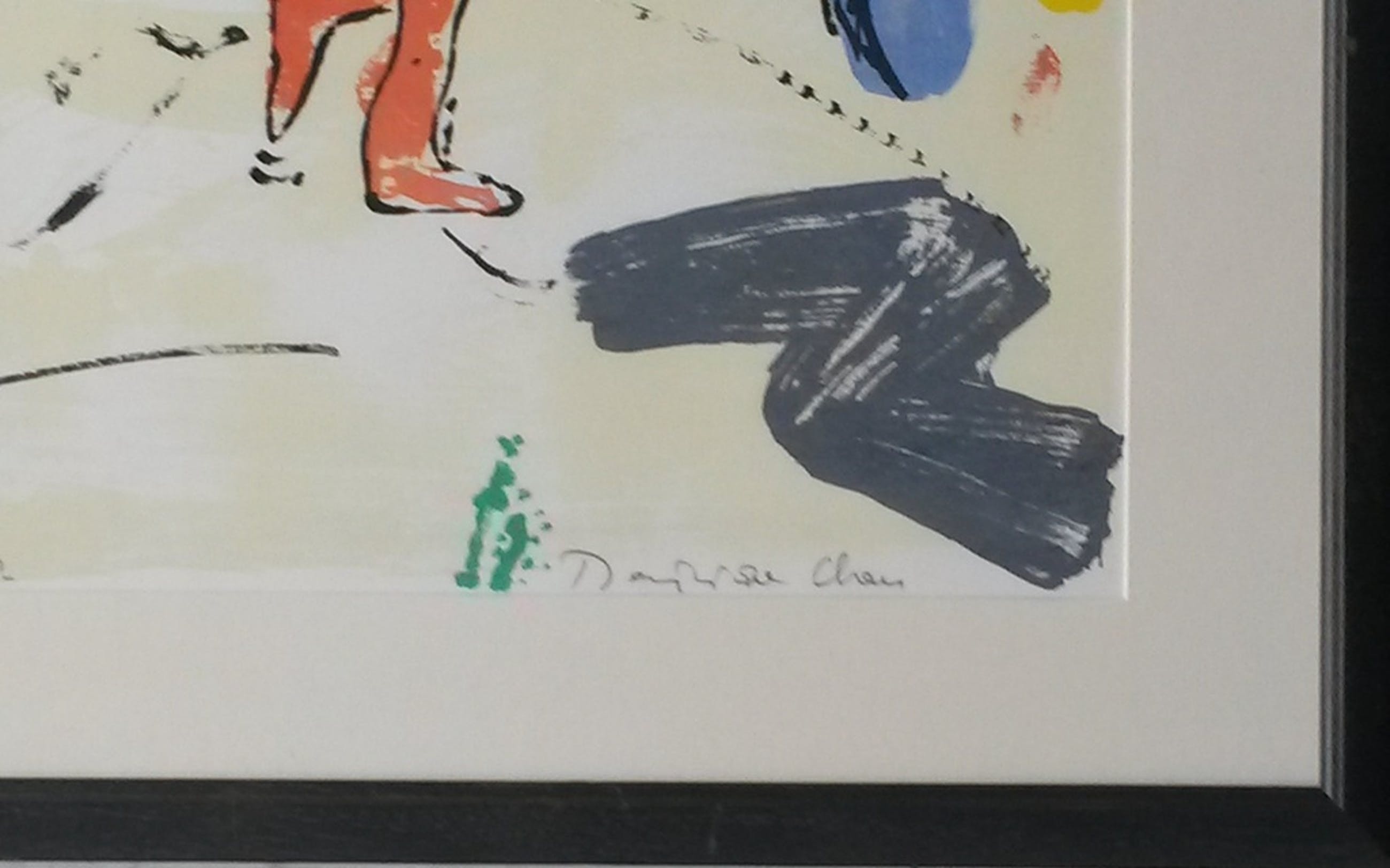 Grote kleurrijke zeefdruk van Dominique Chan. Met potlood r.o. gesigneerd, l.o. titel en oplage 151 / 250. In uitstekende conditie. Afmetingen: 75 x 55 cm (afbeelding), 98 x 78 cm (lijst). Zuurvrij passepartout, grijze houten lijst, kan direct aan de muur.