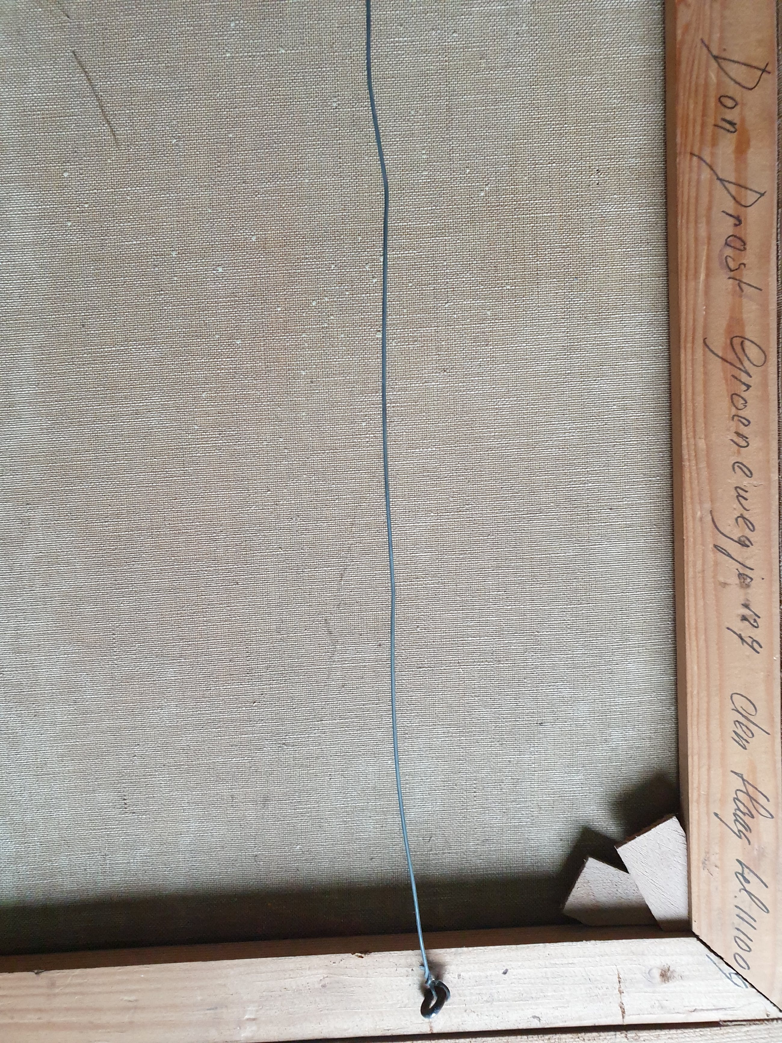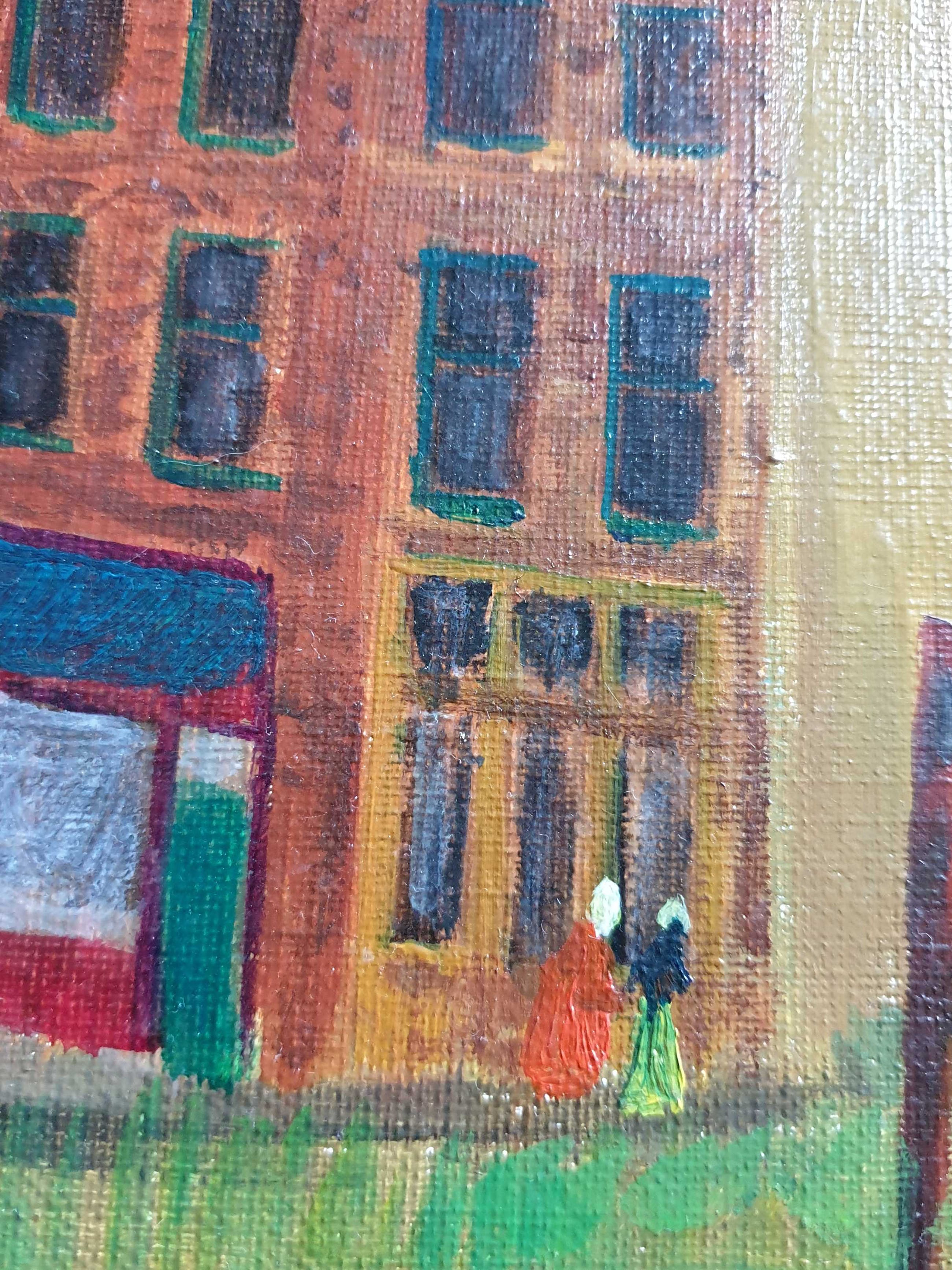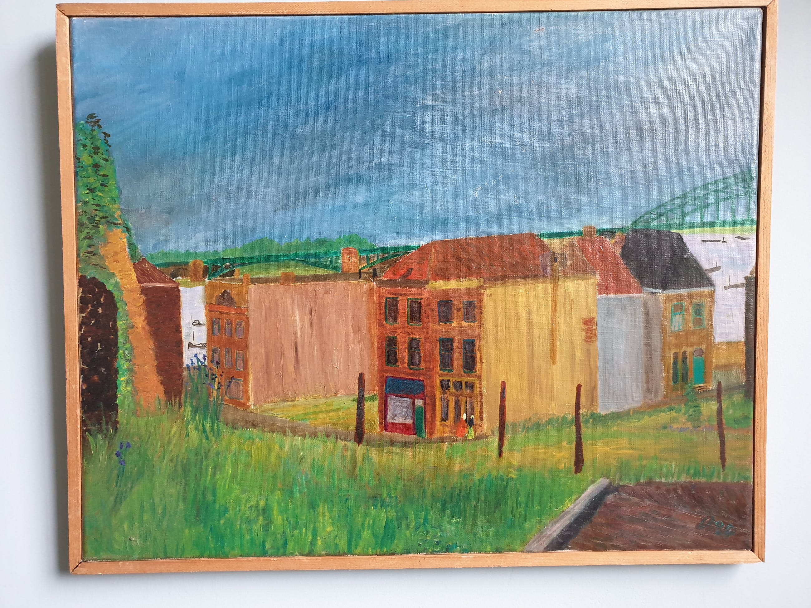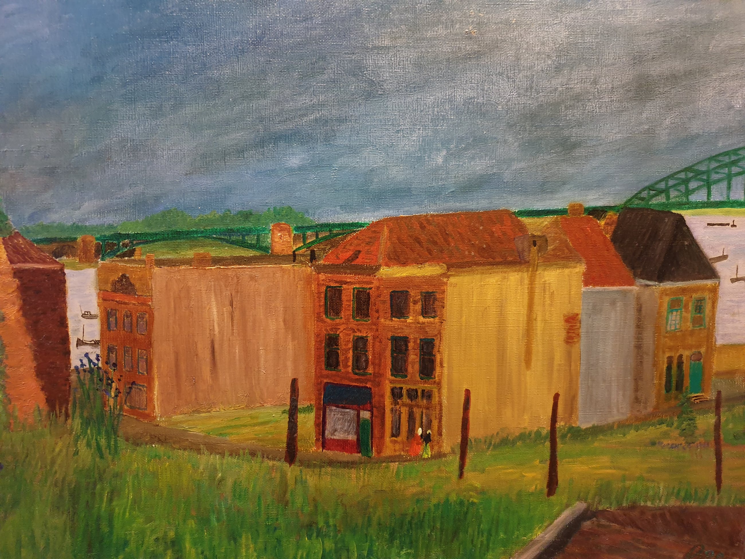 Conrad Dionijs (Don) Drost (1933-1977) woonde en werkte in Nijmegen en De Bilt. Hij kwam al jong te overlijden in zijn geboortestad Den Haag. Na zijn opleiding aan de Koninklijke Academie van Beeldende Kunsten, waar hij leerling was van Jos van den Berg, werd hij de schepper van een klein, door kenners zeer gewaardeerd oeuvre aan aquarellen, pastels, pentekeningen en olieverfschilderijen (vermeld in de Scheen). Tot zijn favoriete onderwerpen behoorden landschappen, stillevens en stadsgezichten. Dit "Gezicht op Nijmegen" toont huizen in de oude omgeving van de Waalkade (inmiddels verdwenen), met links nog iets zichtbaar van (vermoedelijk) de Barbarossa-ruïne in de Valkhof en rechtsachter de Waalbrug. Het doek is rechtsonder gesigneerd, niet gedateerd en kent en paar lichte beschadigingen aan de achterzijde.