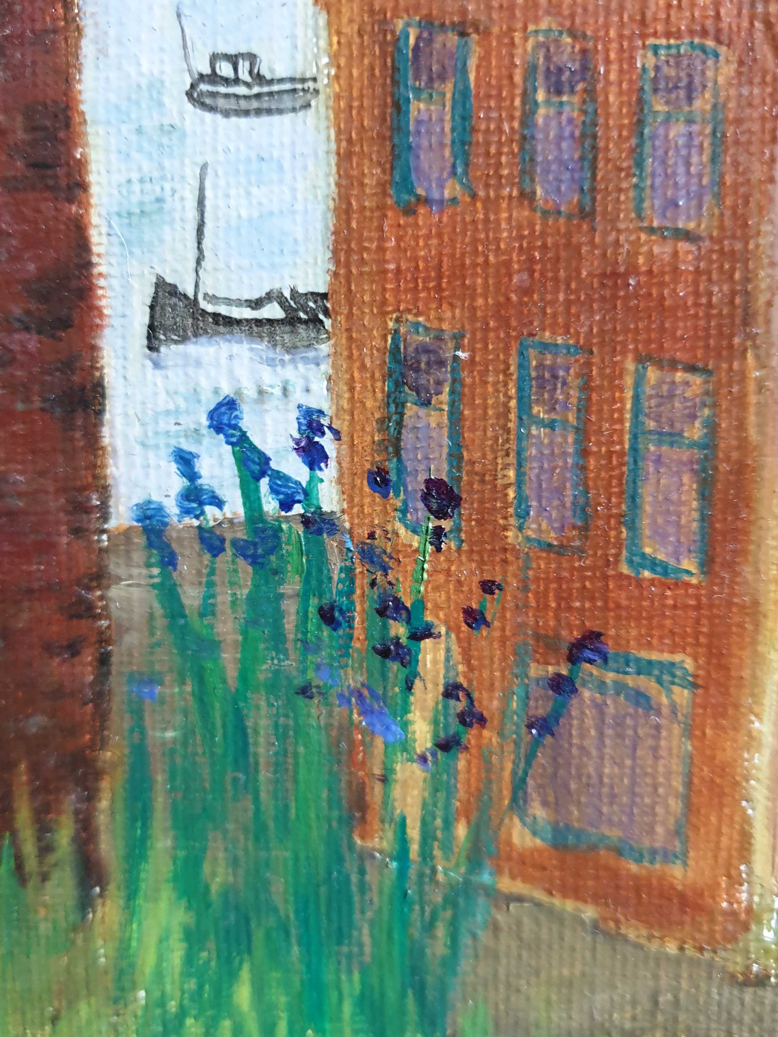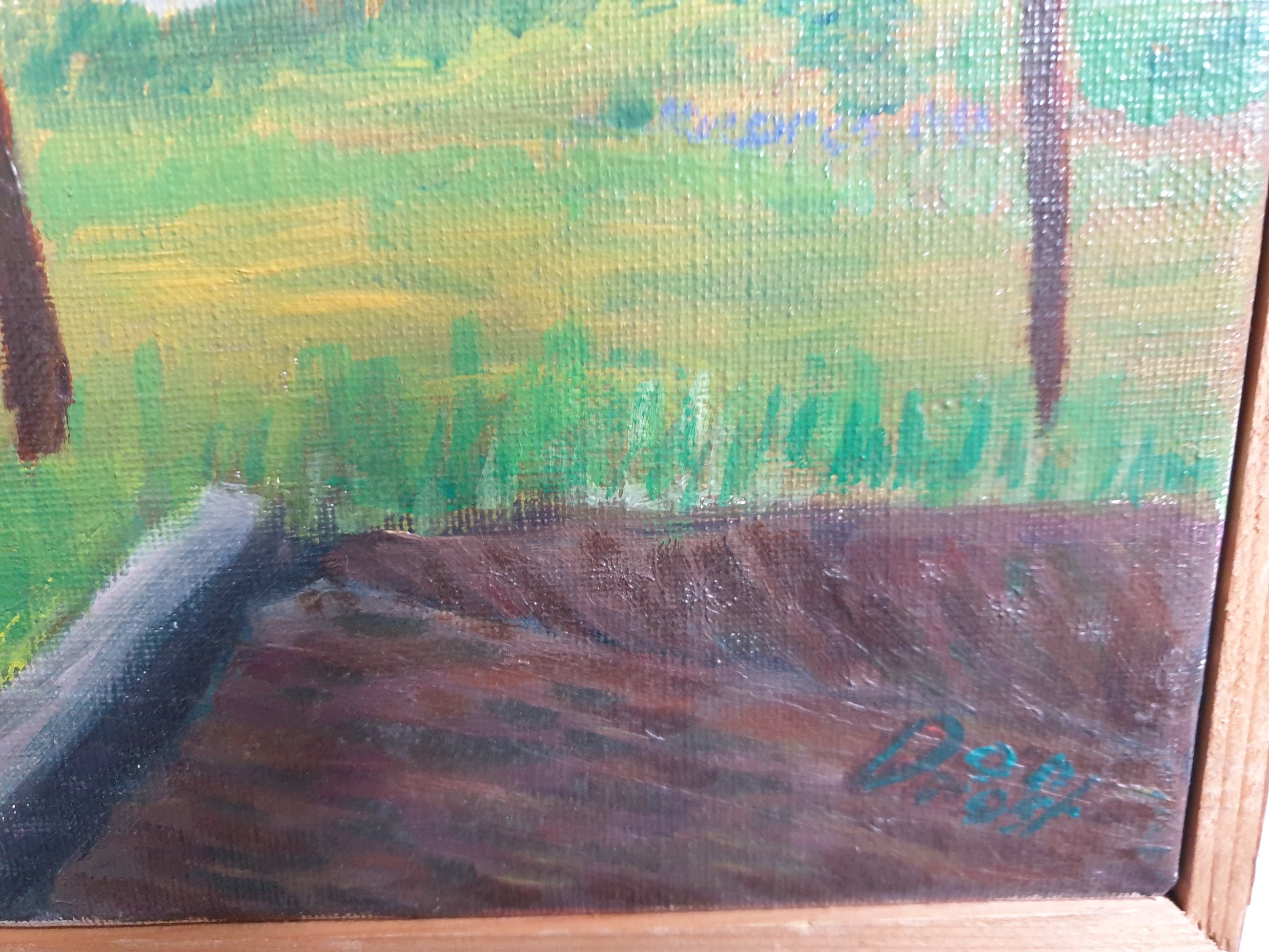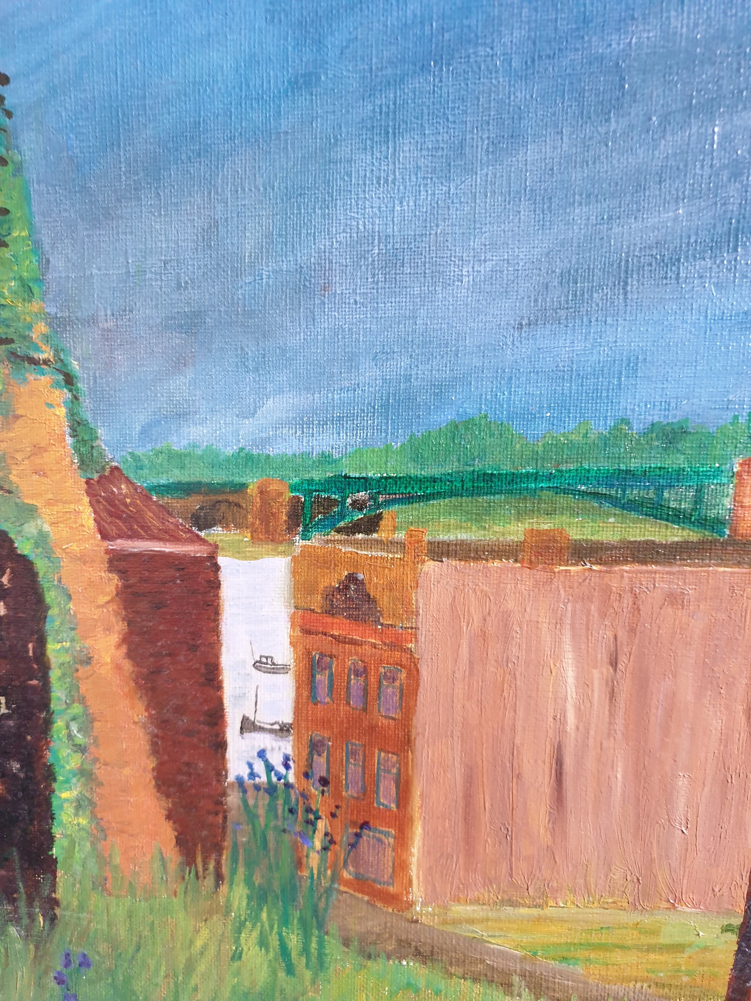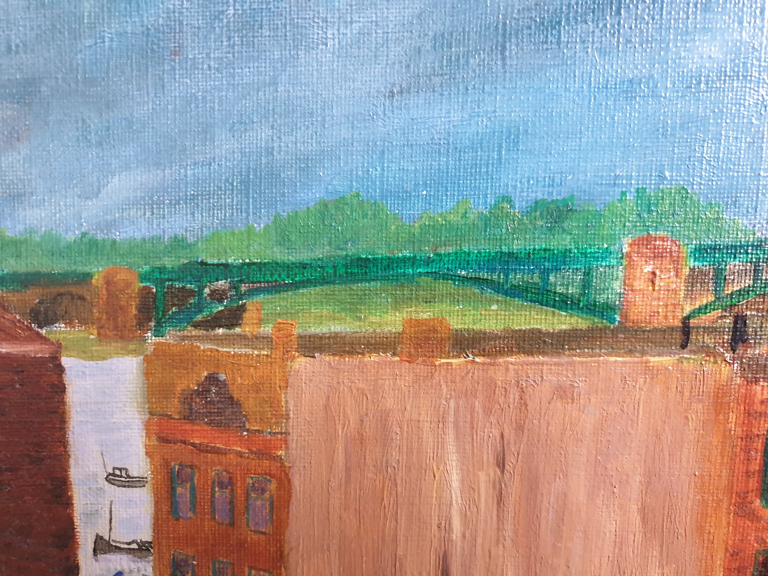 Conrad Dionijs (Don) Drost (1933-1977) woonde en werkte in Nijmegen en De Bilt. Hij kwam al jong te overlijden in zijn geboortestad Den Haag. Na zijn opleiding aan de Koninklijke Academie van Beeldende Kunsten, waar hij leerling was van Jos van den Berg, werd hij de schepper van een klein, door kenners zeer gewaardeerd oeuvre aan aquarellen, pastels, pentekeningen en olieverfschilderijen (vermeld in de Scheen). Tot zijn favoriete onderwerpen behoorden landschappen, stillevens en stadsgezichten. Dit "Gezicht op Nijmegen" toont huizen in de oude omgeving van de Waalkade (inmiddels verdwenen), met links nog iets zichtbaar van (vermoedelijk) de Barbarossa-ruïne in de Valkhof en rechtsachter de Waalbrug. Het doek is rechtsonder gesigneerd, niet gedateerd en kent en paar lichte beschadigingen aan de achterzijde.