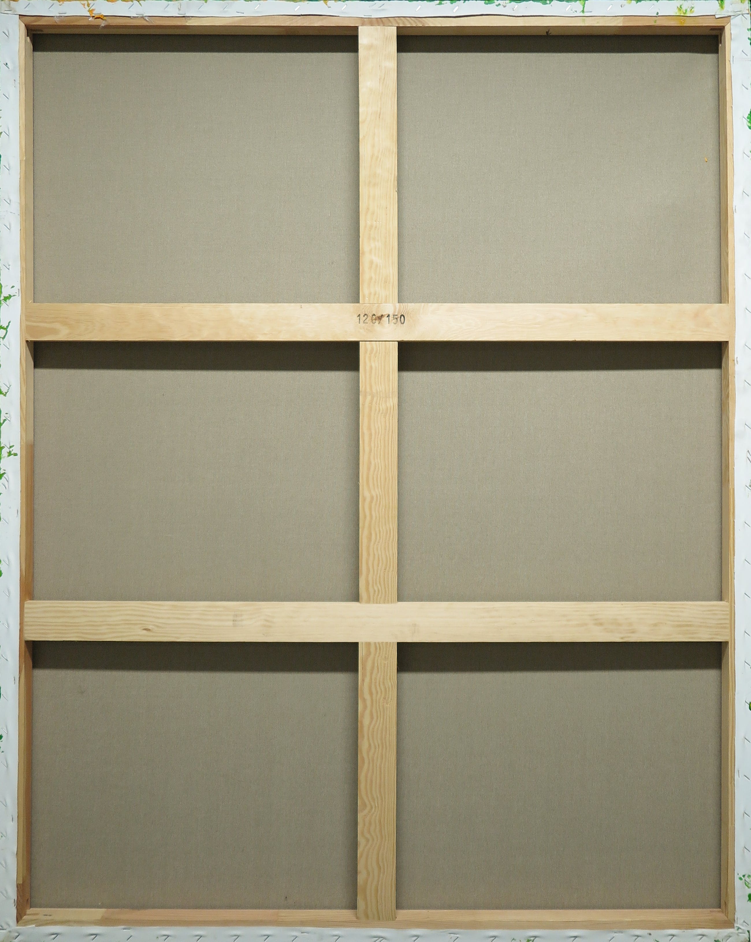 | Langs de bovenste rand is het doek een horizontaal licht ingedeukt. Paar oppervlakkige vlekjes bovenin. Paar lichte slijtplekjes langs de randen. | |