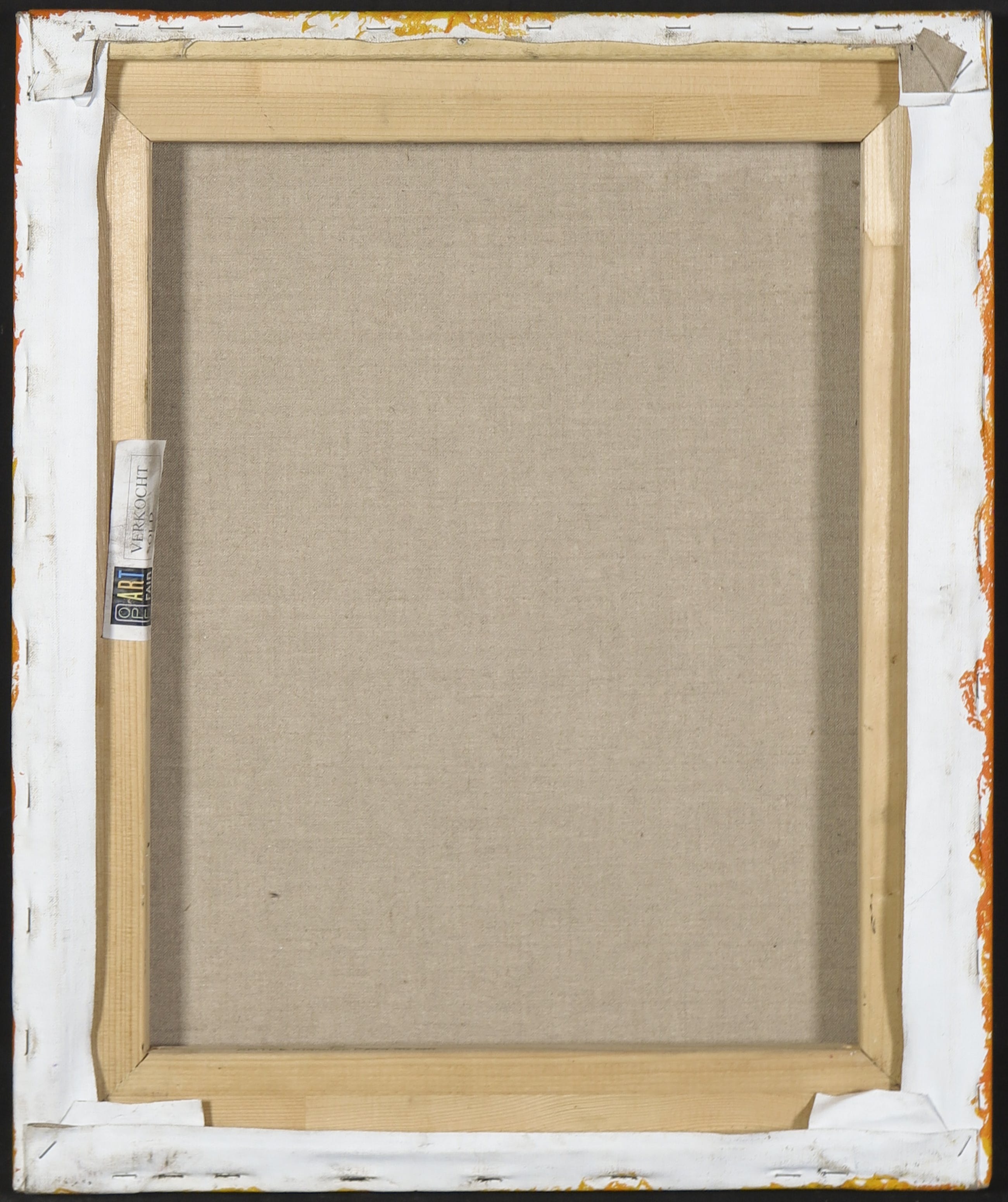 | In de hoeken (zijkanten van het werk) wat licht verfverlies door het vouwen van het canvas. | |