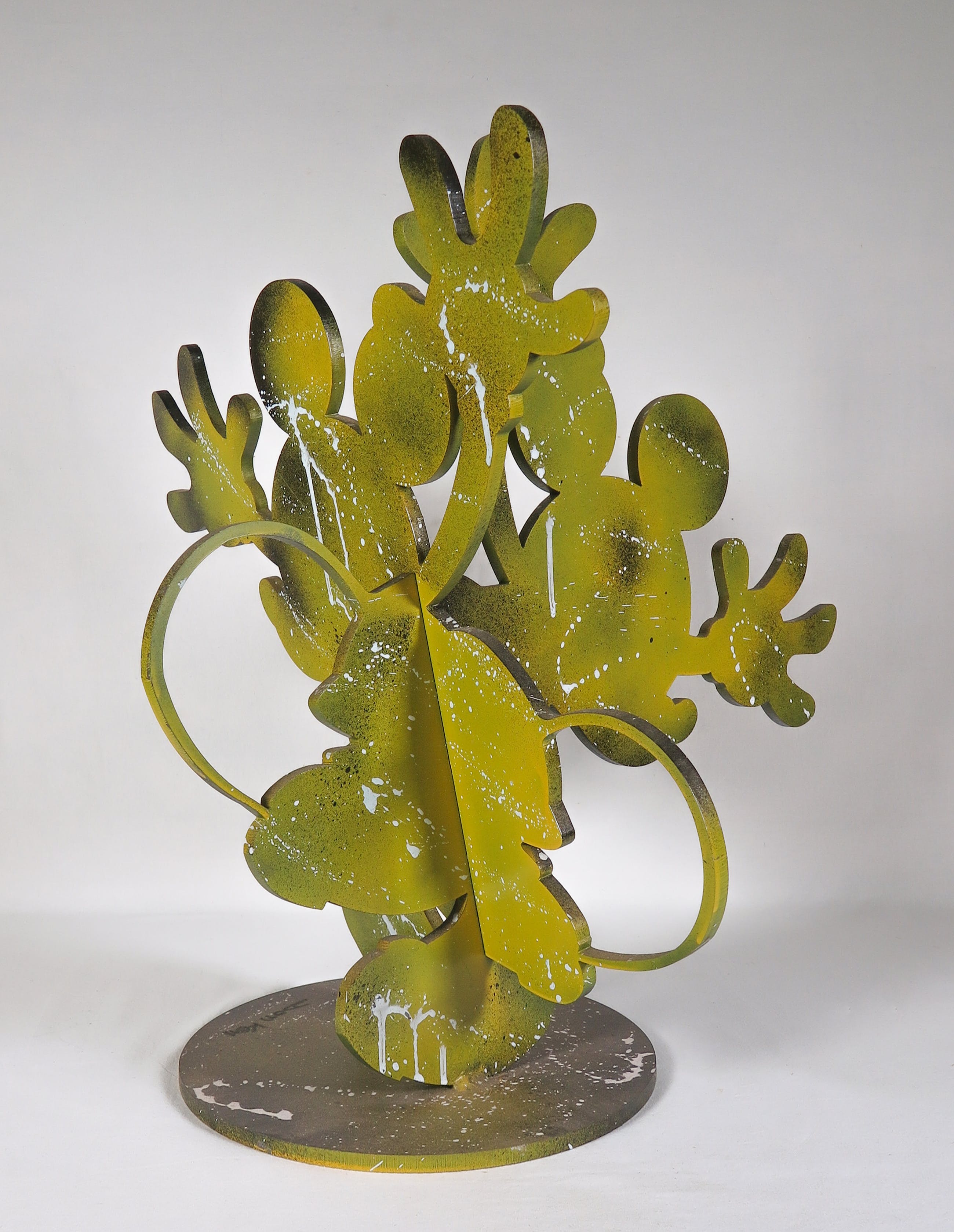 Groot ijzeren beeld van twee Mickey's. Gedecoreerd met spuitbus en een spetterpatroon.