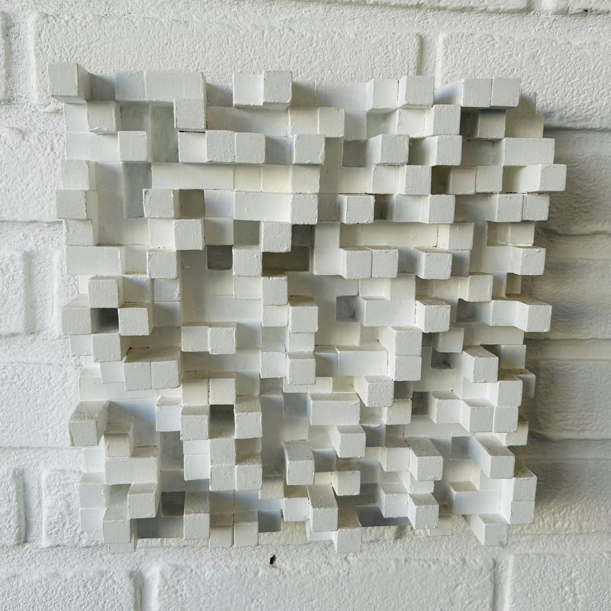 Fraaie werk van de Rotterdamse kunstenaar Don Satijn. Het wandobject is van hout en is wit gespoten. het werk is niet nieuw maar prima toonbaar. Het kan zo aan de muur. Verso gesigneerd en met titel en jaartal.