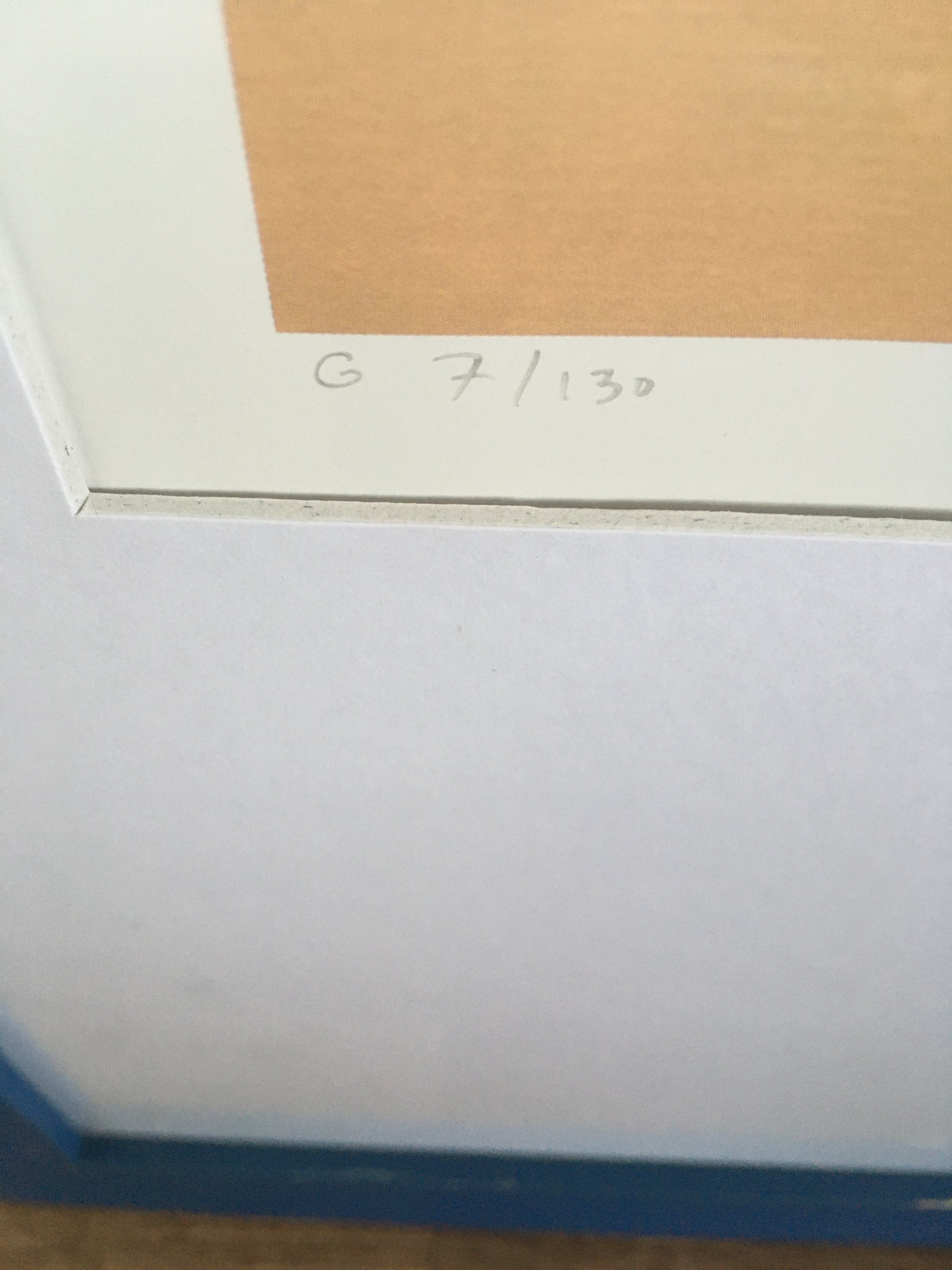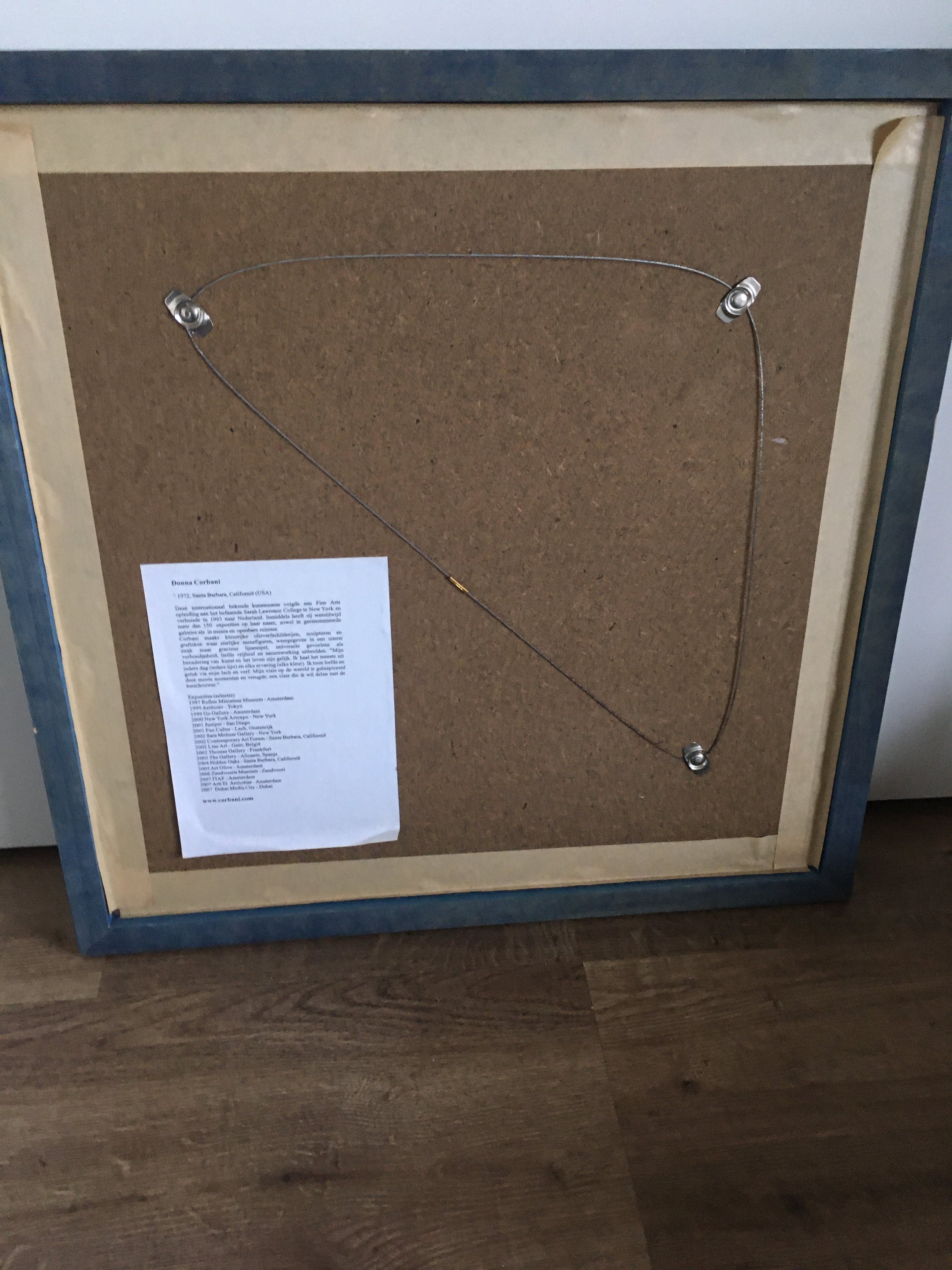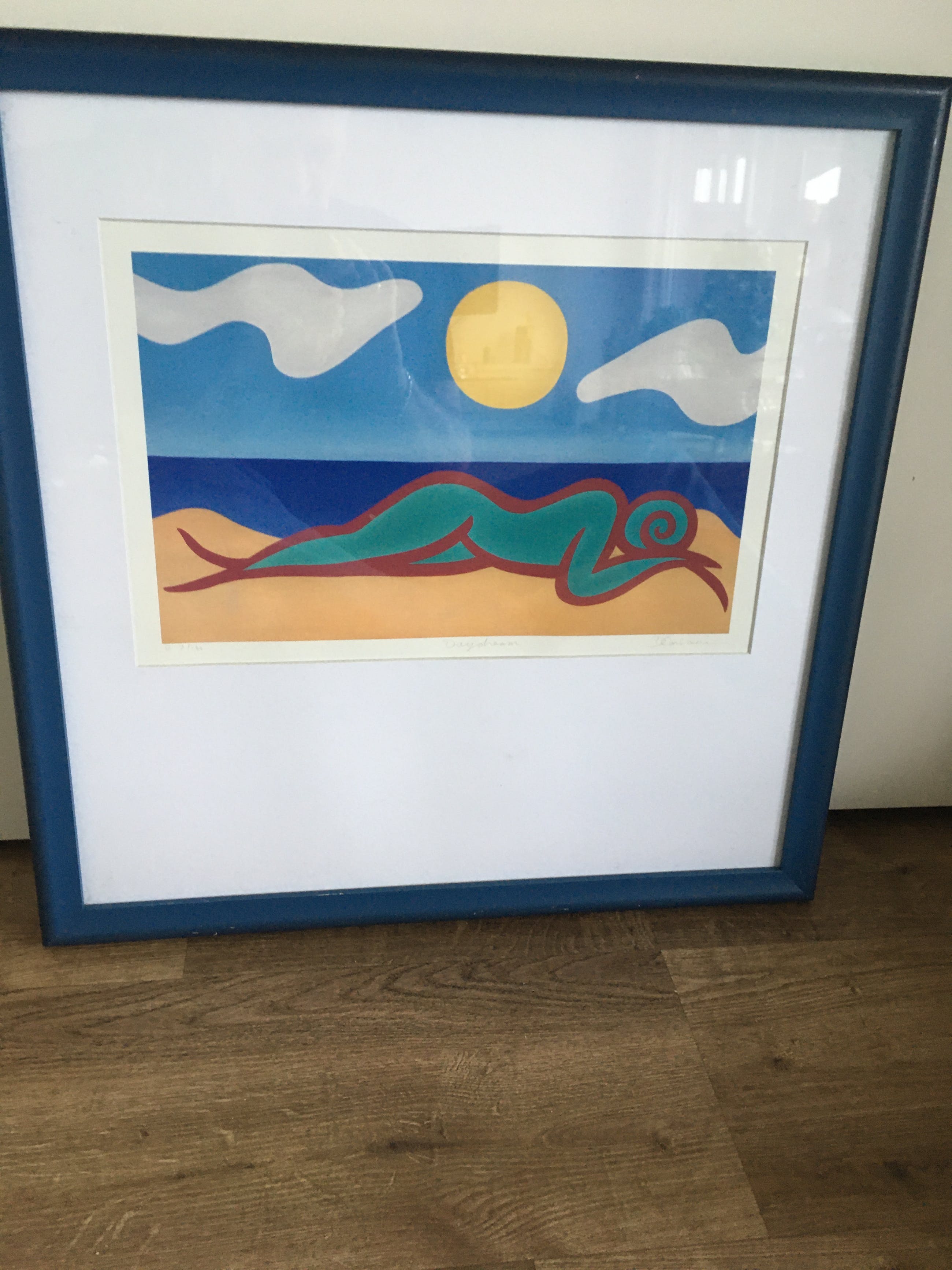 Zeefdruk met mooie blauwe lijst ( 2,5 cm breed) passend bij het ontwerp. Met l.o. 7/130 met potlood, in het midden Daydream met potlood en r.o. D.Corbani met potlood.