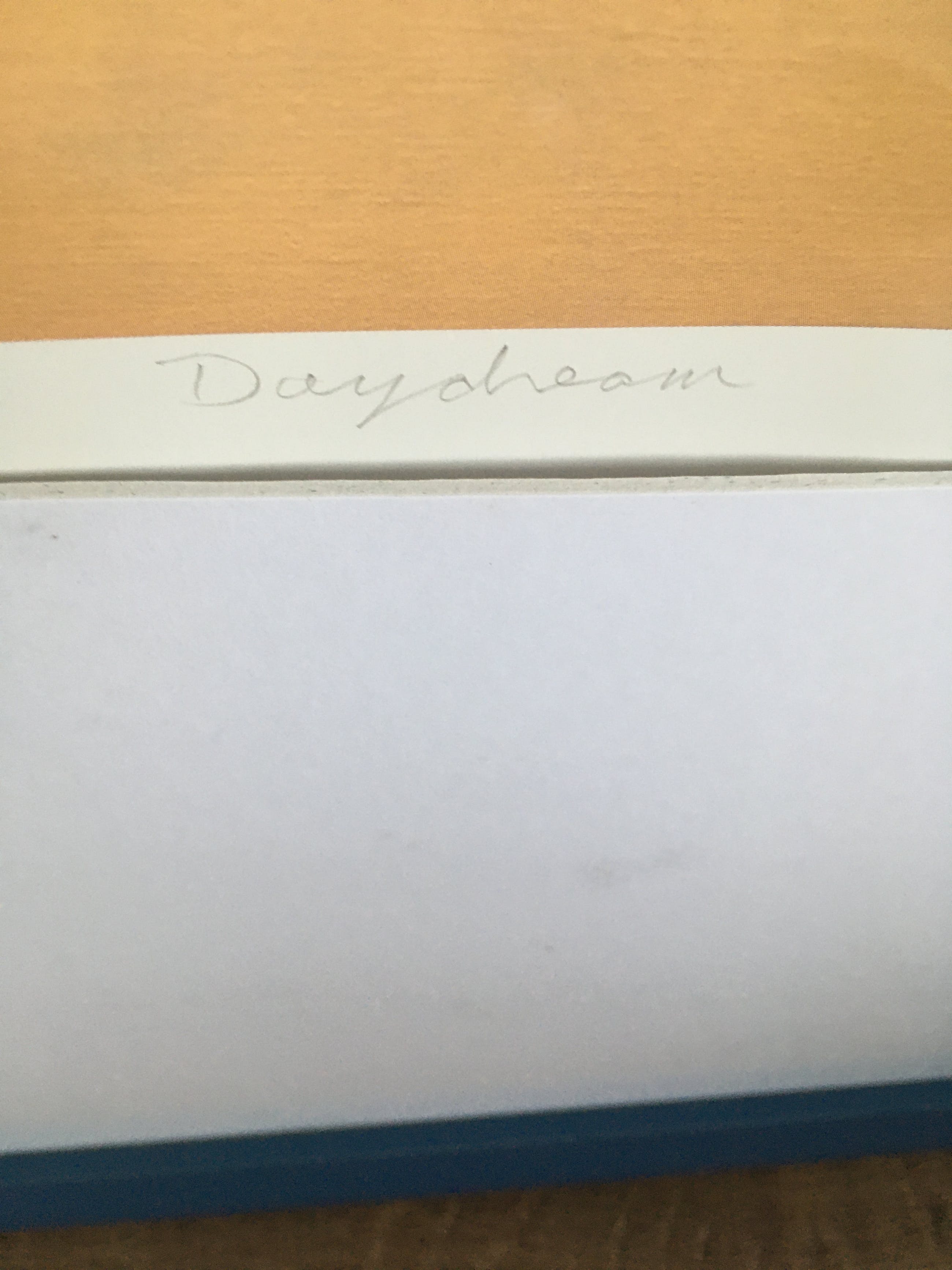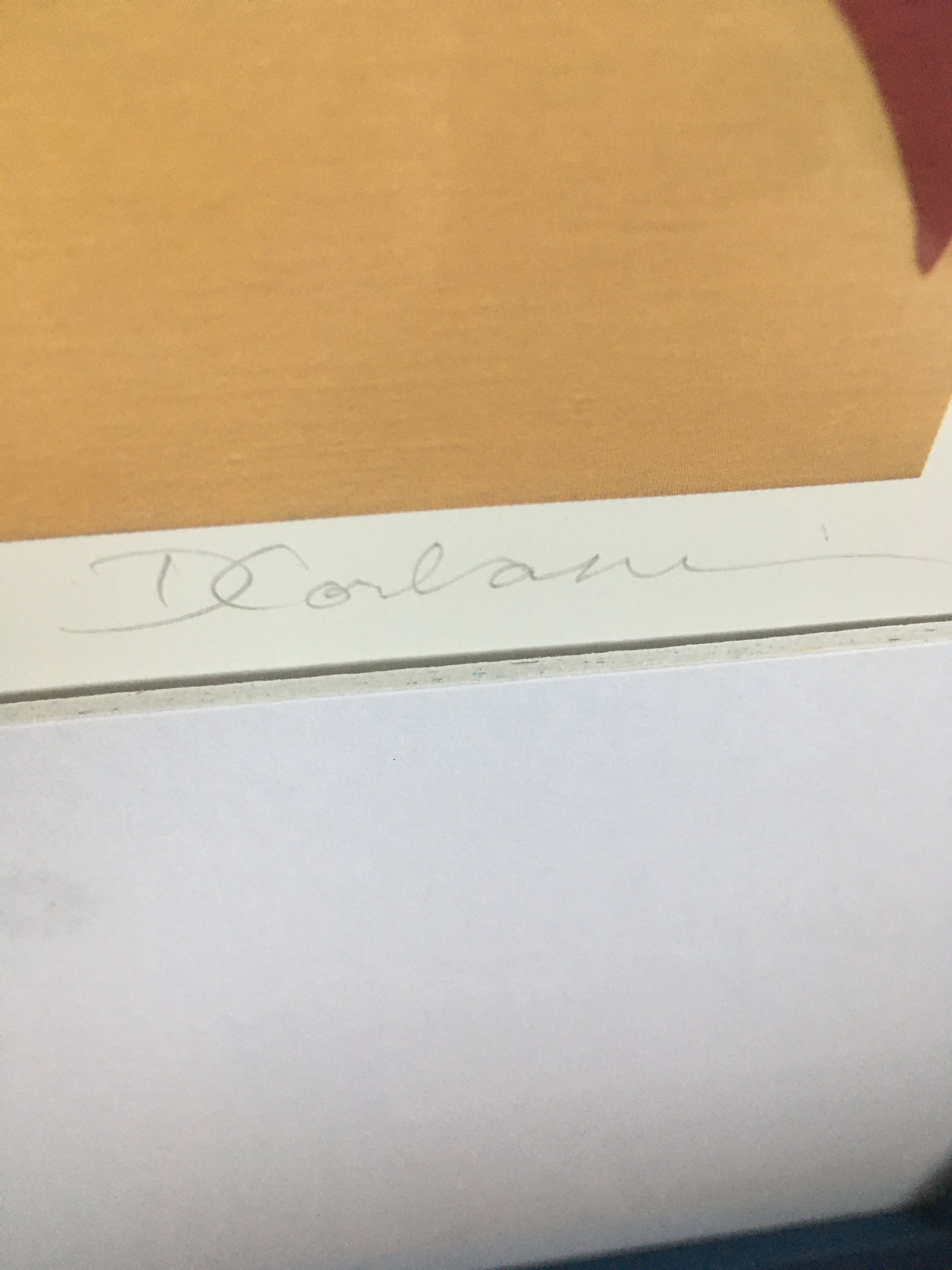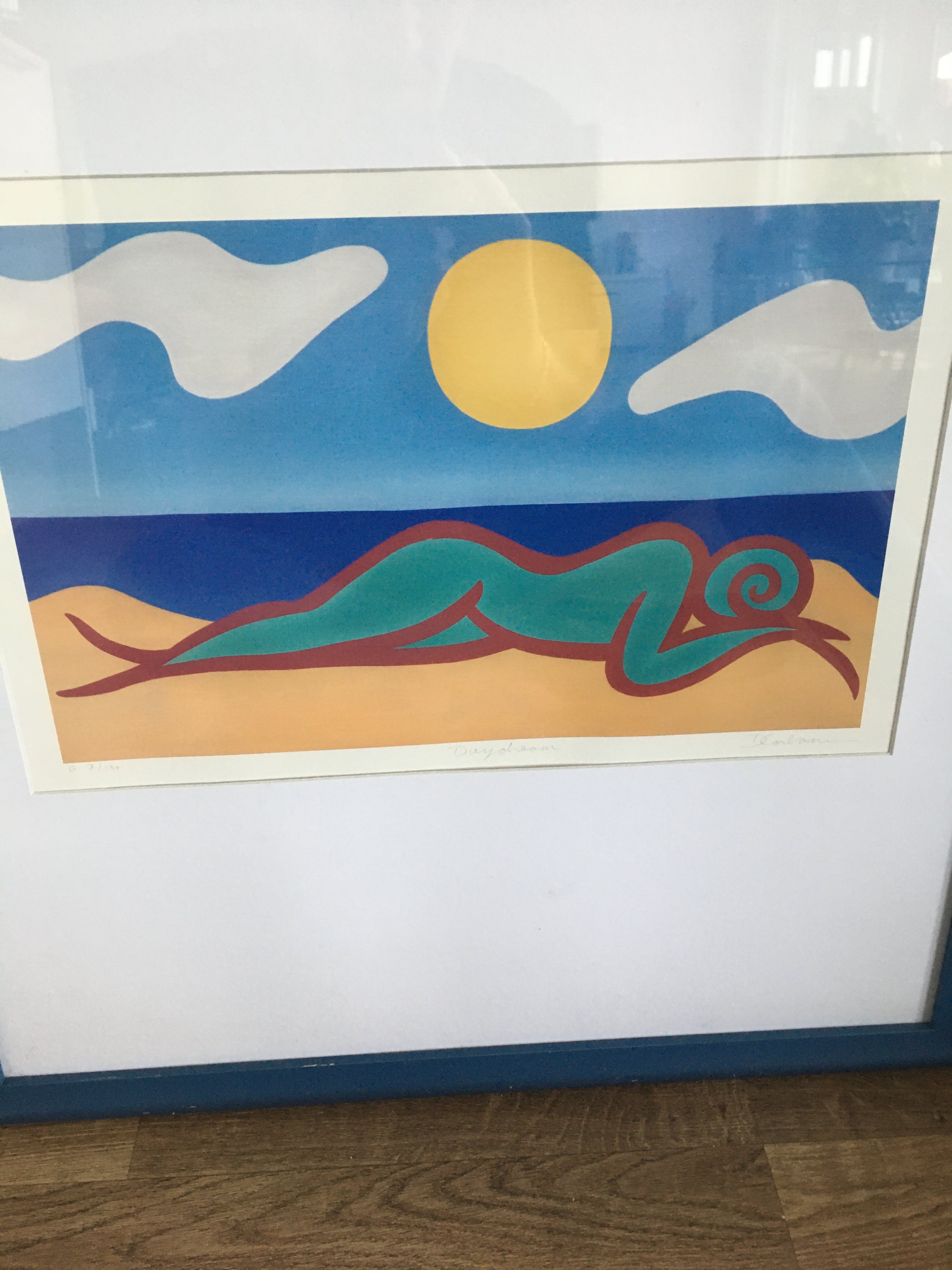 Zeefdruk met mooie blauwe lijst ( 2,5 cm breed) passend bij het ontwerp. Met l.o. 7/130 met potlood, in het midden Daydream met potlood en r.o. D.Corbani met potlood.