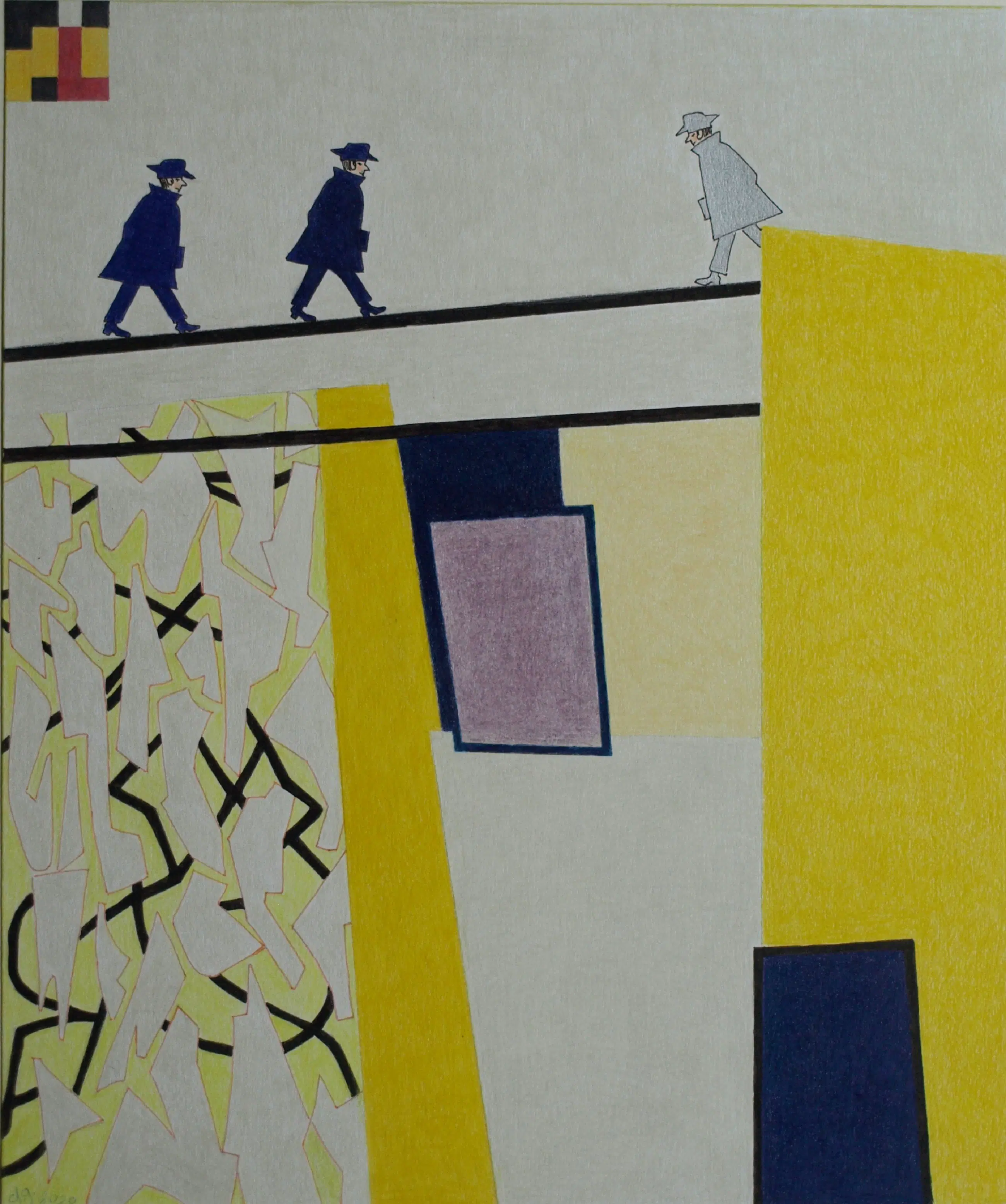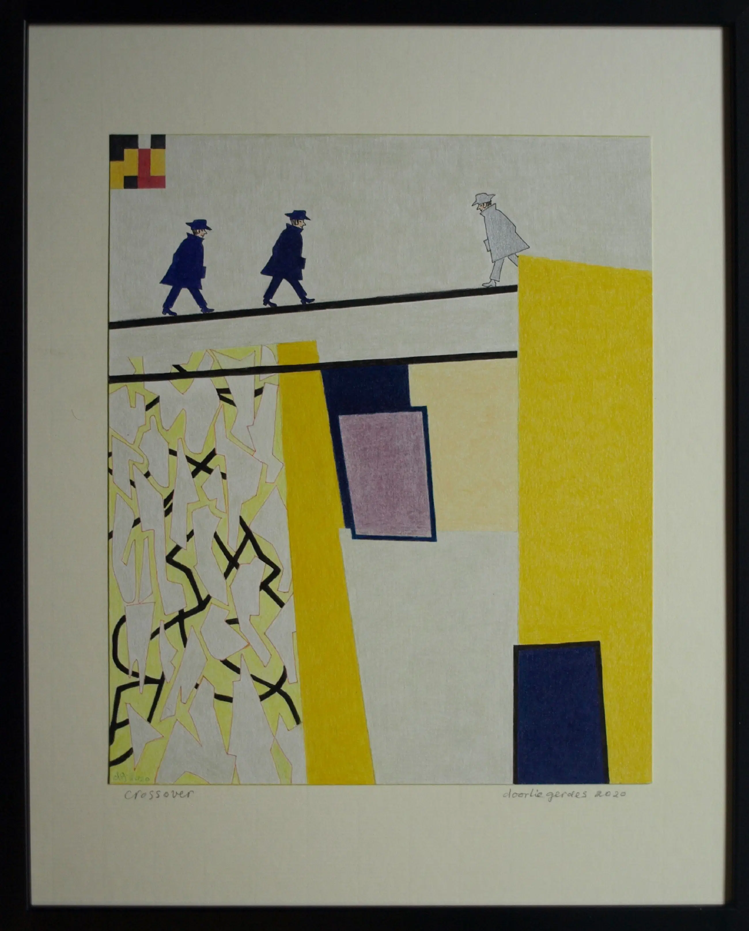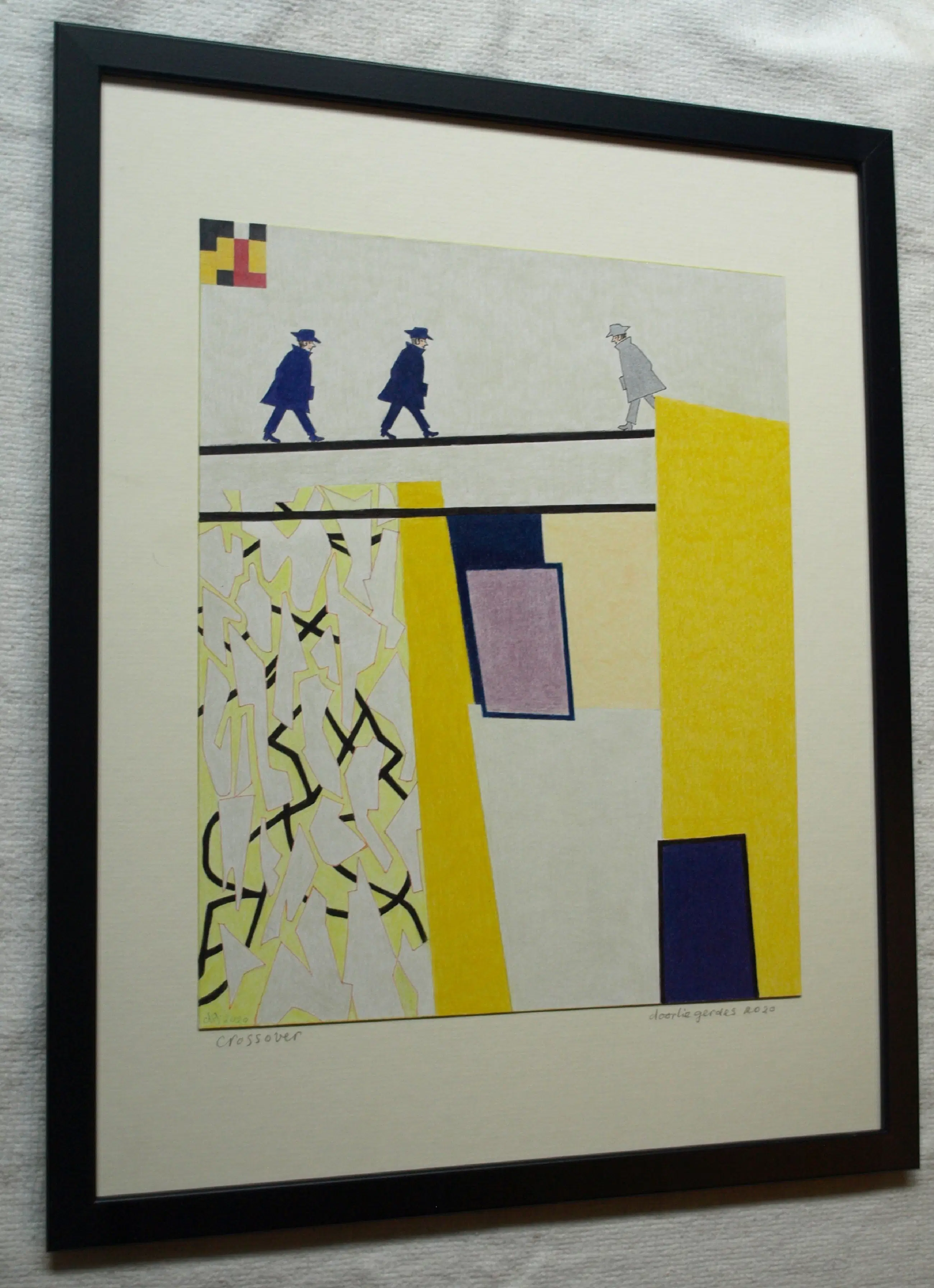 Een potloodtekening uit 2020 van de Nederlandse kunstenares Doorlie Gerdes (1935-), getiteld “Crossover”. -Gesigneerd, getiteld en gedateerd met potlood onder de tekening. Ook met pen gedateerd, getiteld en gesigneerd op de achterkant van de tekening (zie de 14e foto). -Ingelijst in een eenvoudige houten lijst met plexiglasplaat. -Afmetingen: Lijst, 53 x 43 x 1 cm. Tekening, 36 x 30 cm. -Herkomst: Uit een inboedel. -Conditie: In zeer goede staat. Zie ook de foto’s voor een eigen indruk. Kan zo aan de muur.