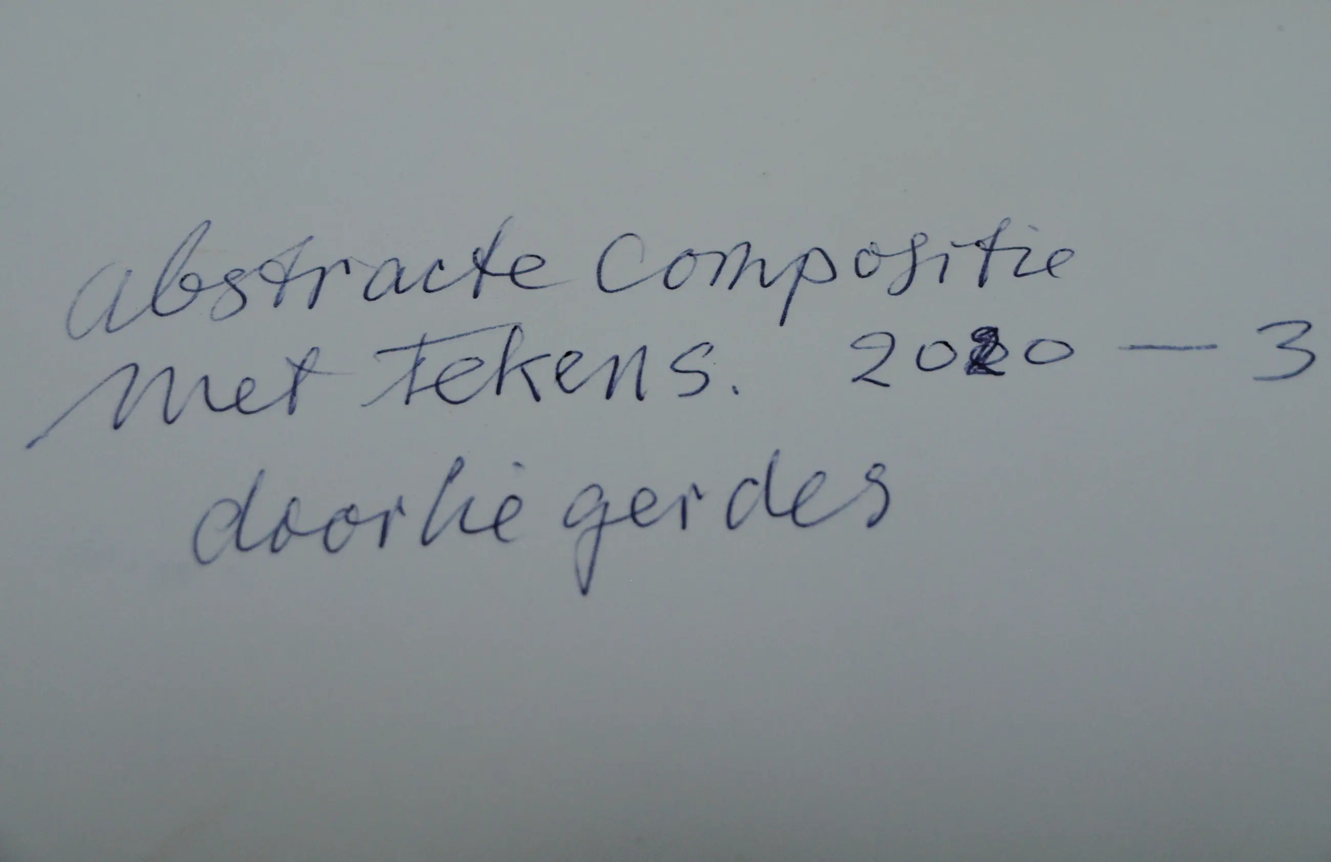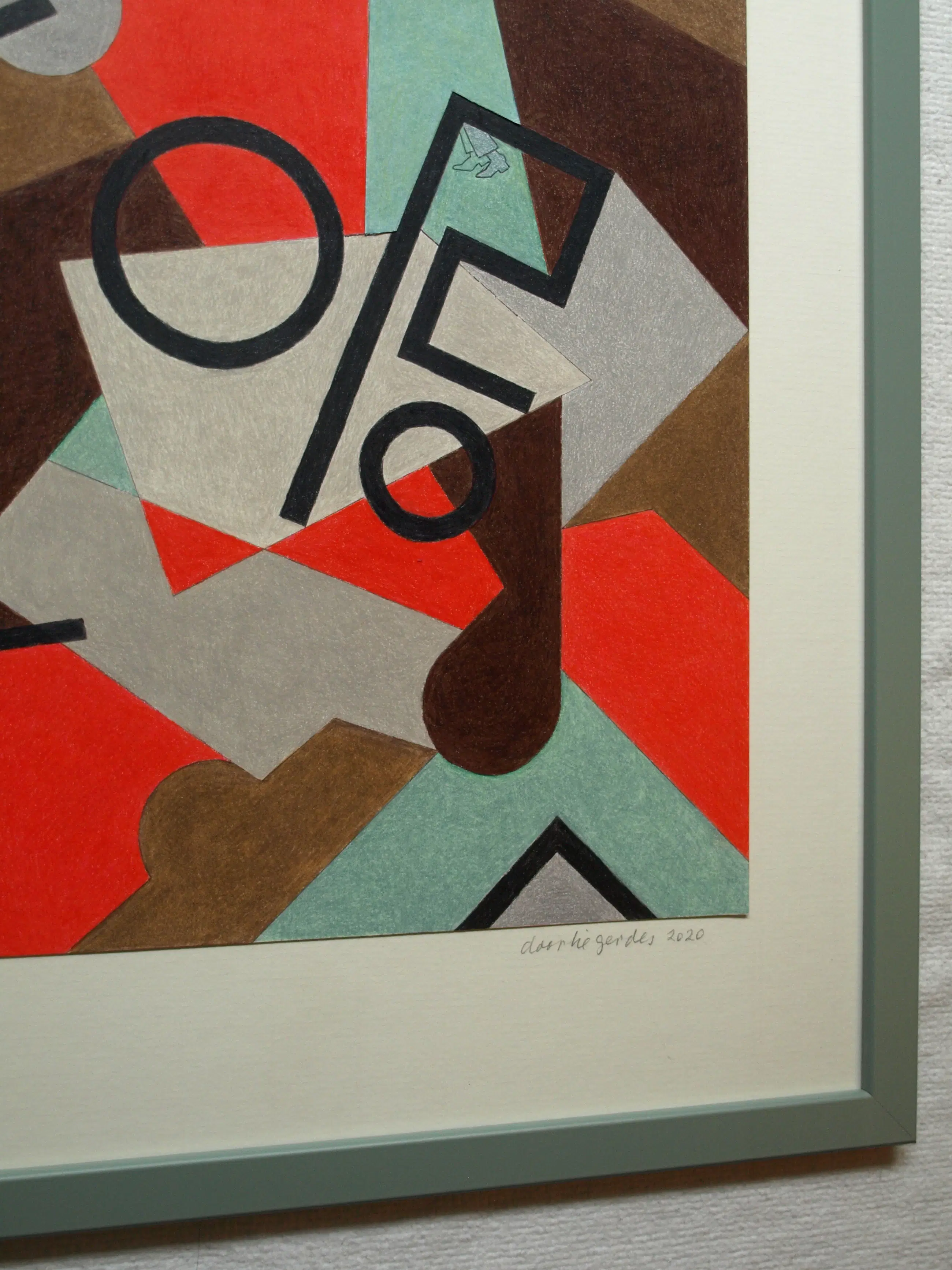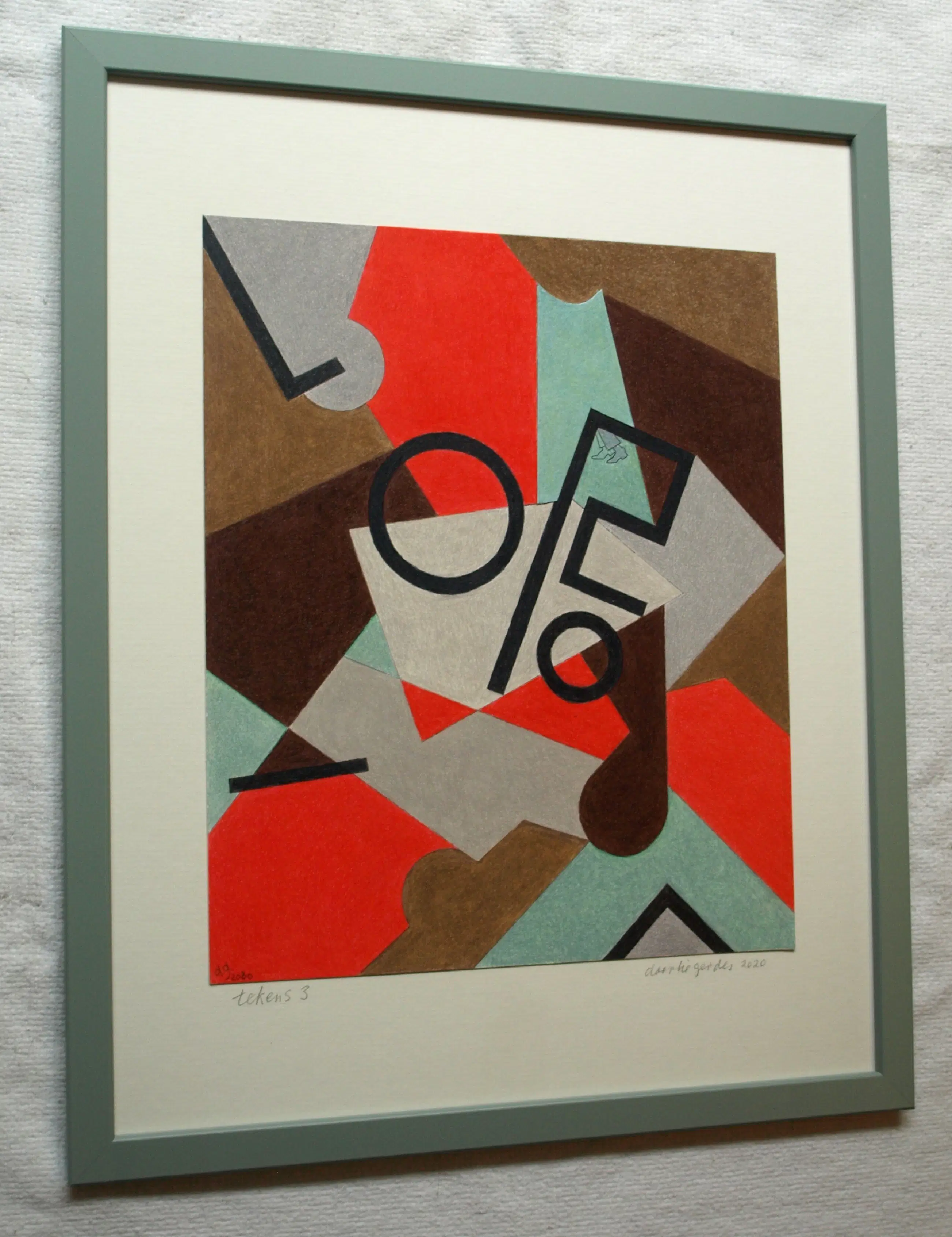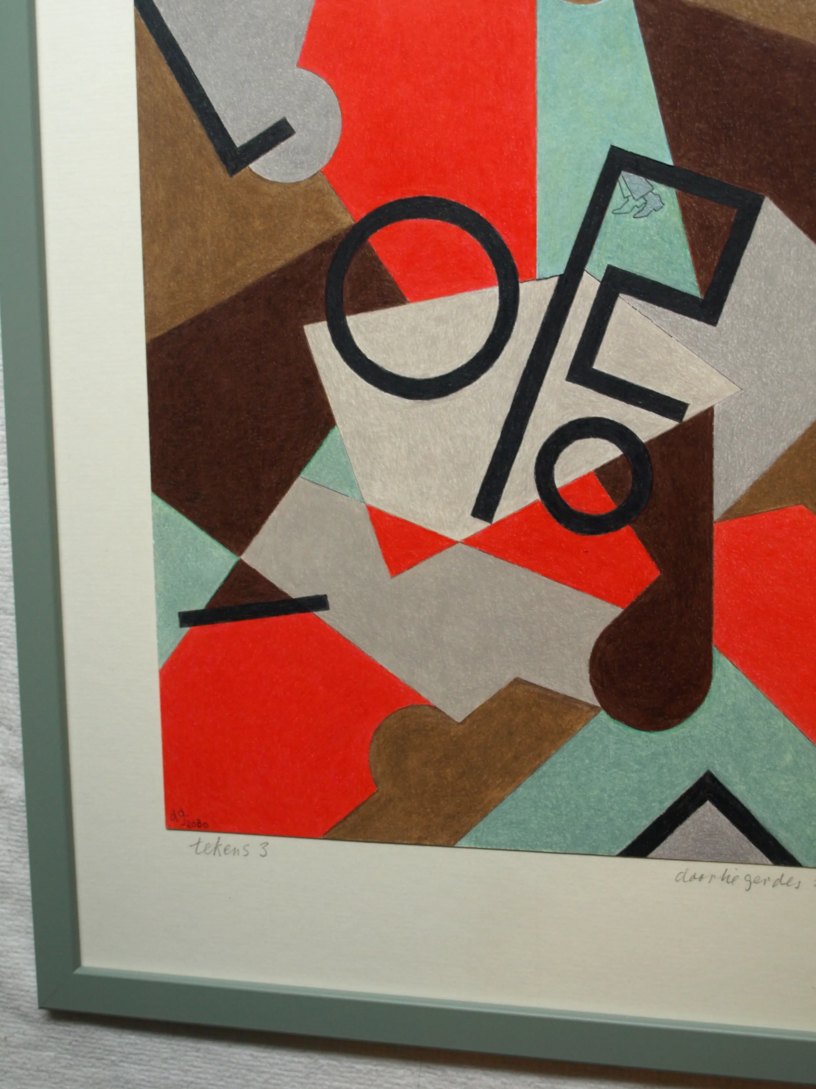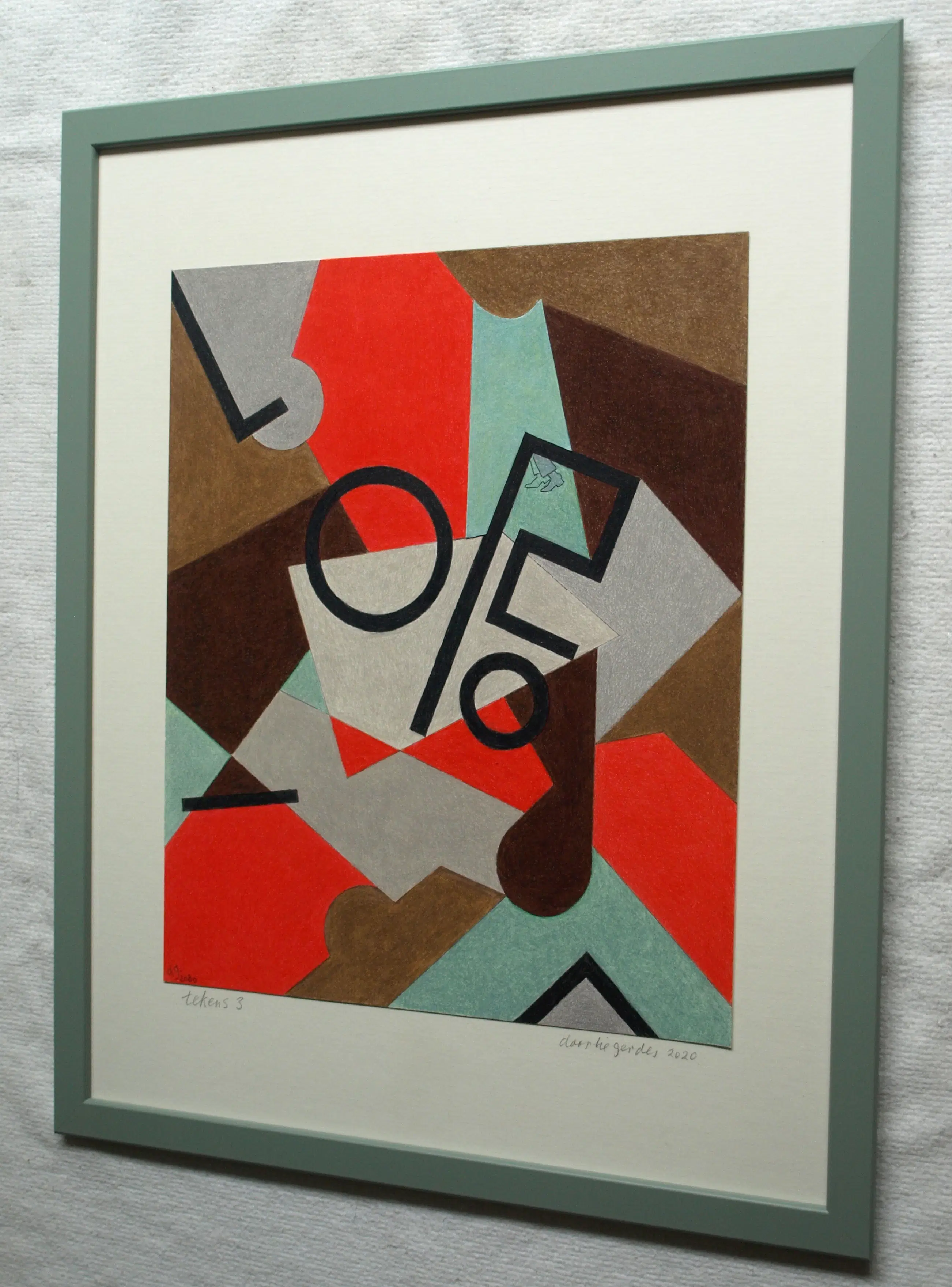 Een potloodtekening uit 2020 van de Nederlandse kunstenares Doorlie Gerdes (1935-), getiteld “Abstracte compositie met tekens Tekens”. -Gesigneerd, getiteld en gedateerd met potlood onder de tekening. Ook met pen gedateerd, getiteld en gesigneerd op de achterkant van de tekening (zie de 14e foto). -Ingelijst in een eenvoudige houten lijst met plexiglasplaat. -Afmetingen: Lijst, 53 x 43 x 1 cm. Tekening, 36 x 30 cm. -Herkomst: Uit een inboedel. -Conditie: In zeer goede staat. Zie ook de foto’s voor een eigen indruk. Kan zo aan de muur.
