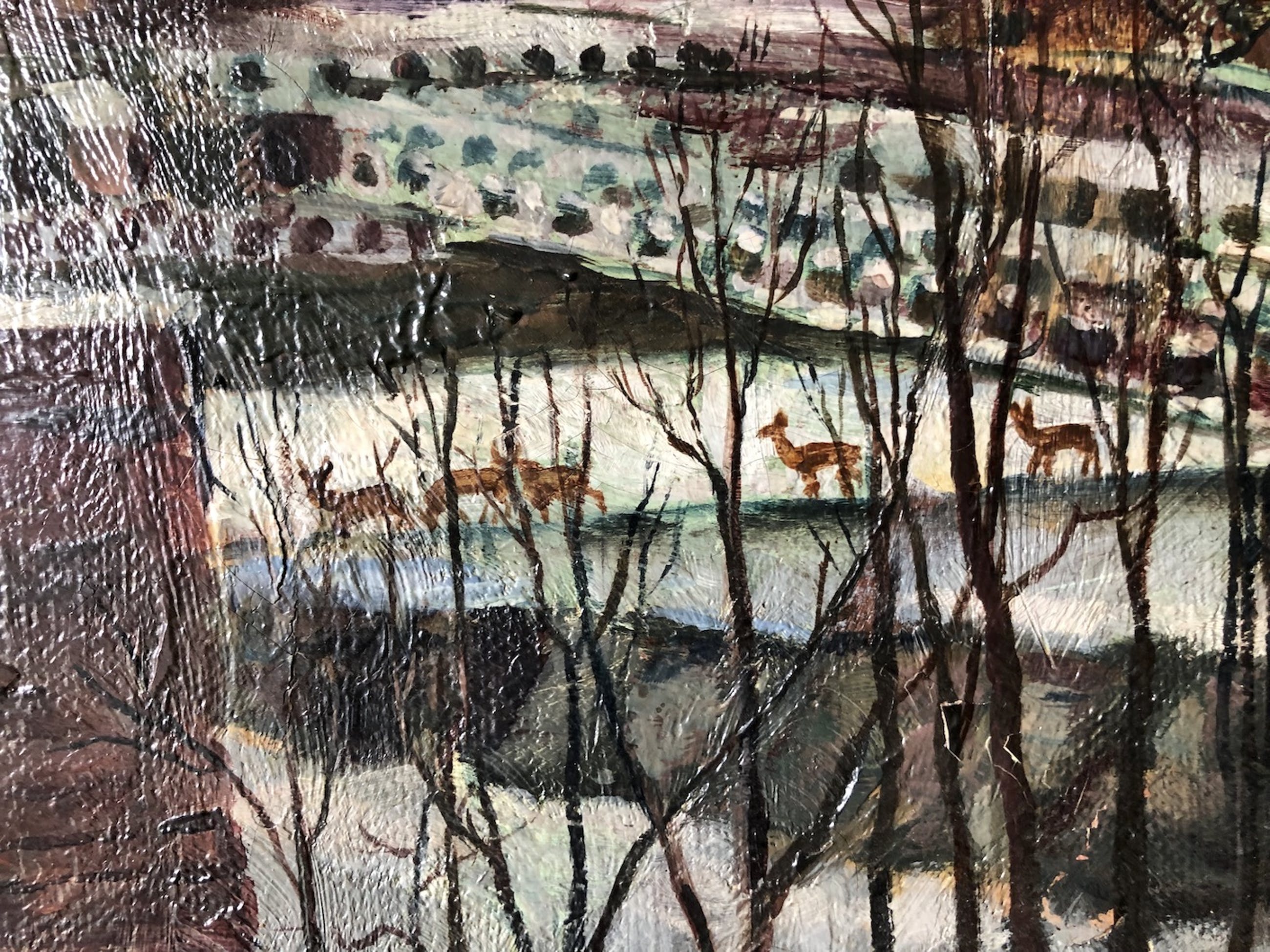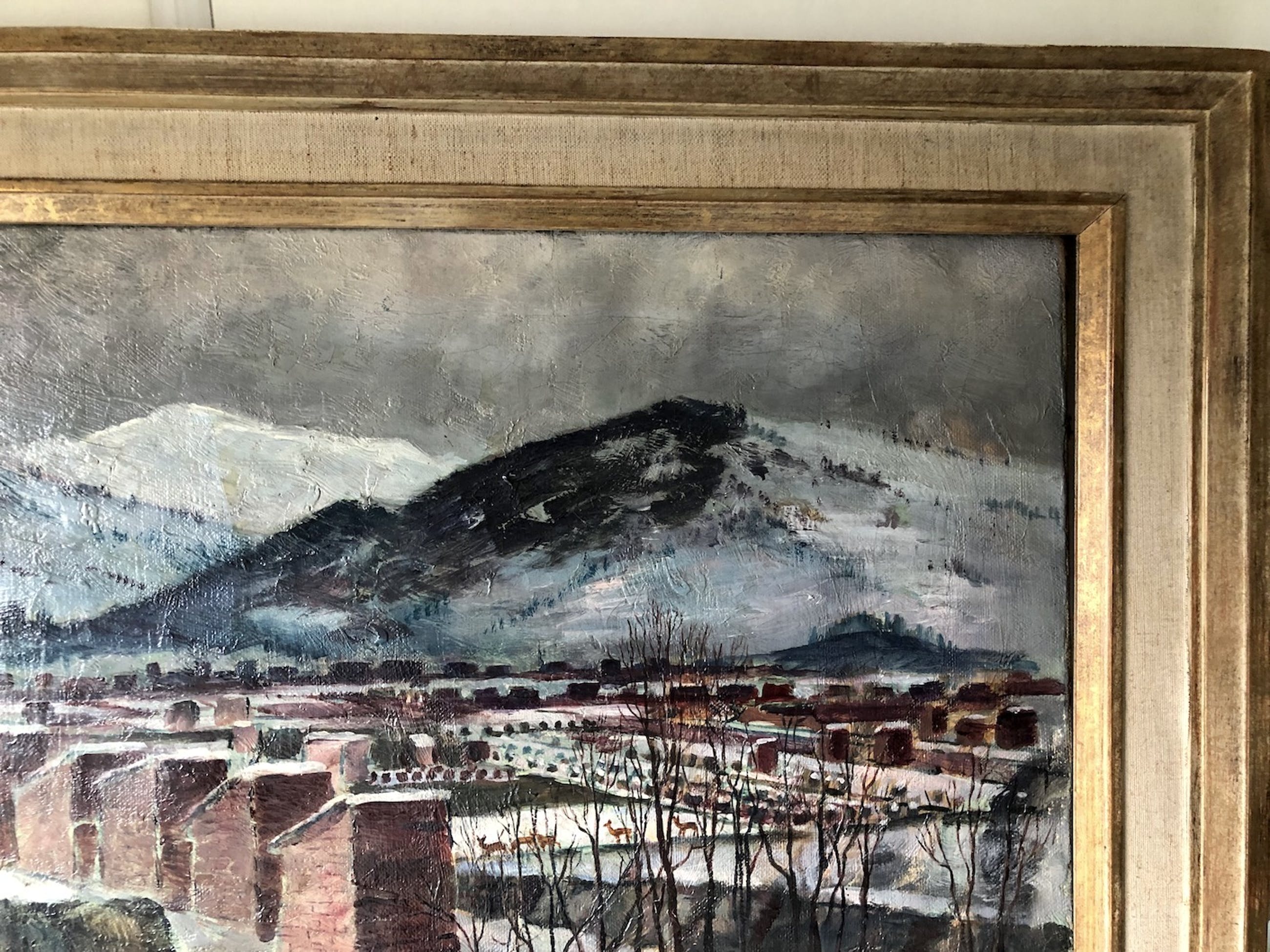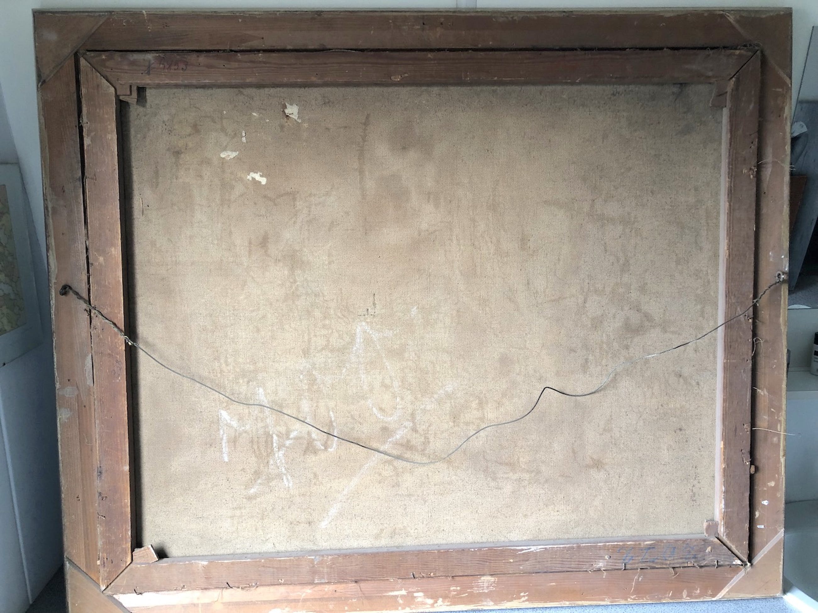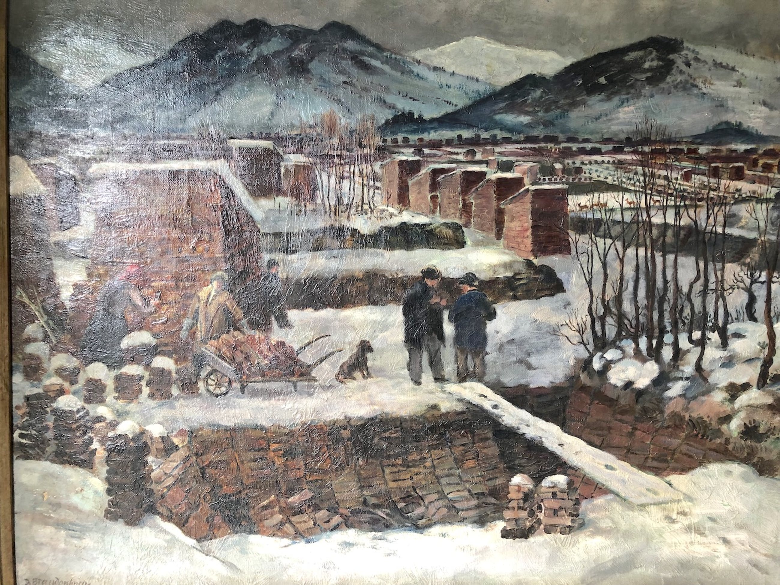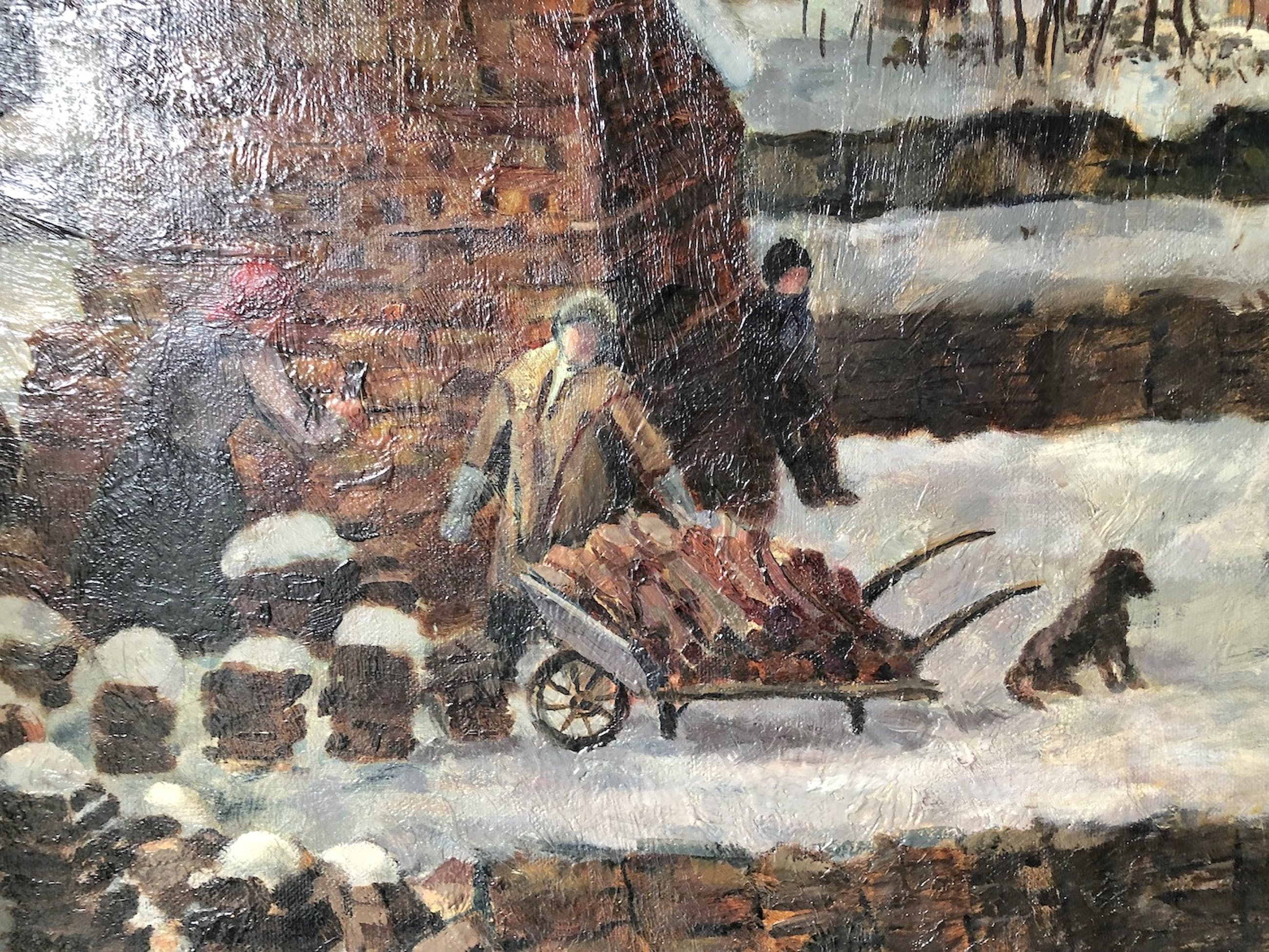 JC 659 Dora Brandenburg-Polster Het stapelen van de turf in winter Olieverf op Doek 80 x 100 cm 94 x 115 cm Spieraam zit ietwat instabiel in lijst. Makkelijk te reparen.