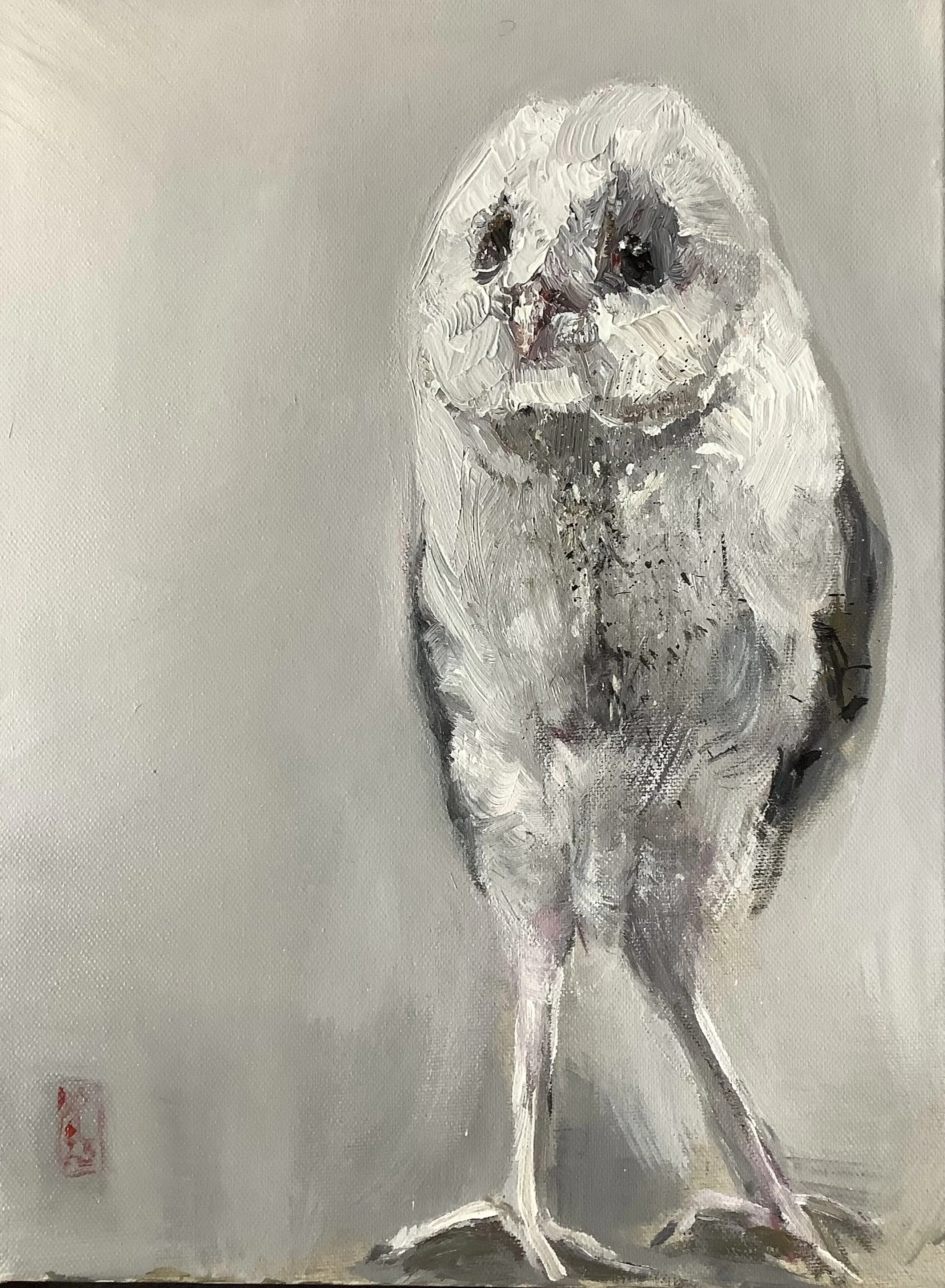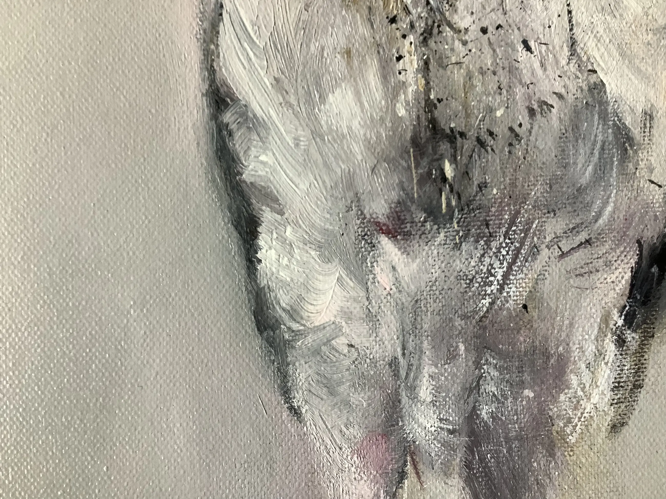 Bijzonder schilderij van Dorien Plaat. De blik van het uitje zegt alles hoe hij of zij zich voelt.