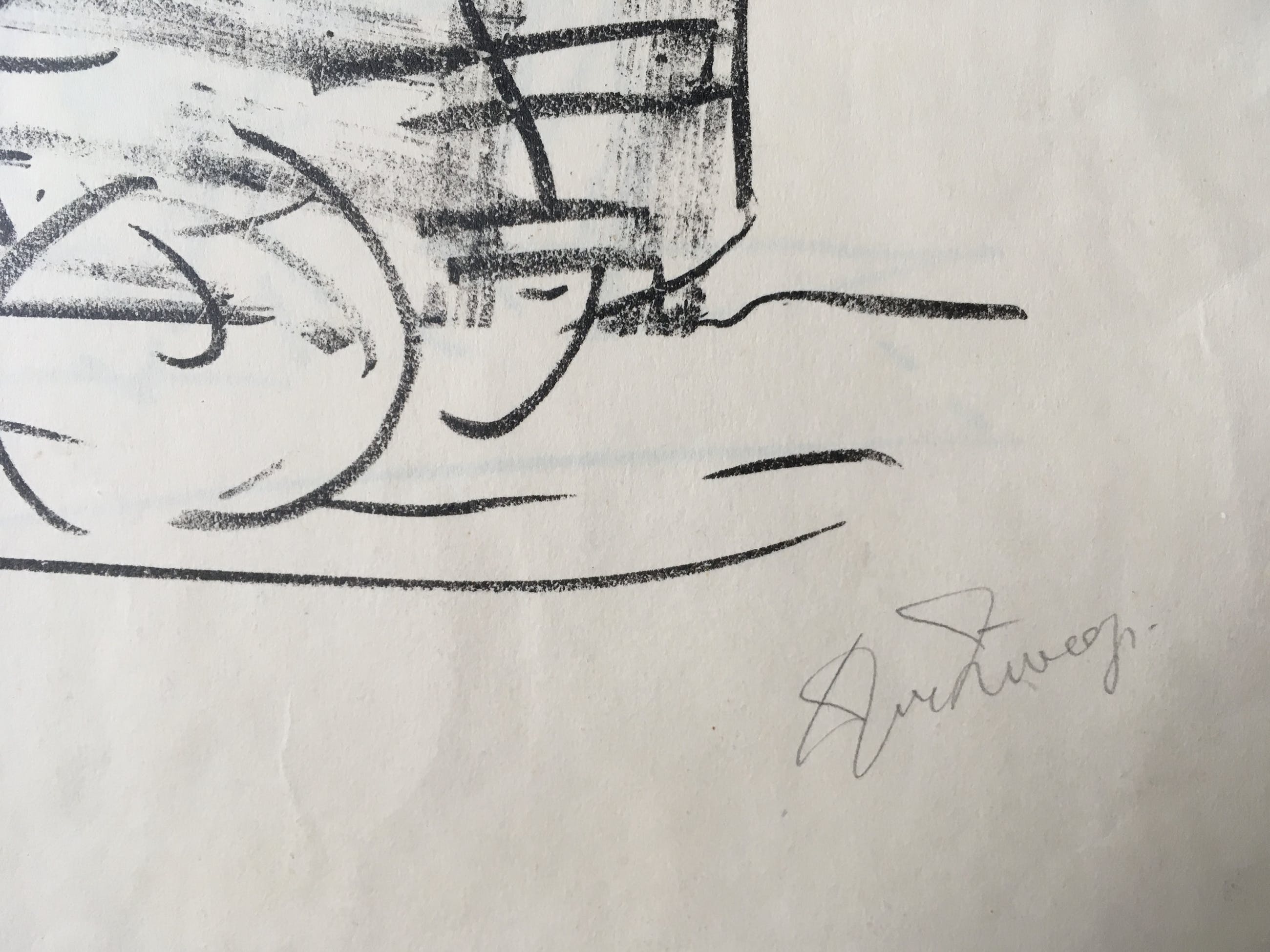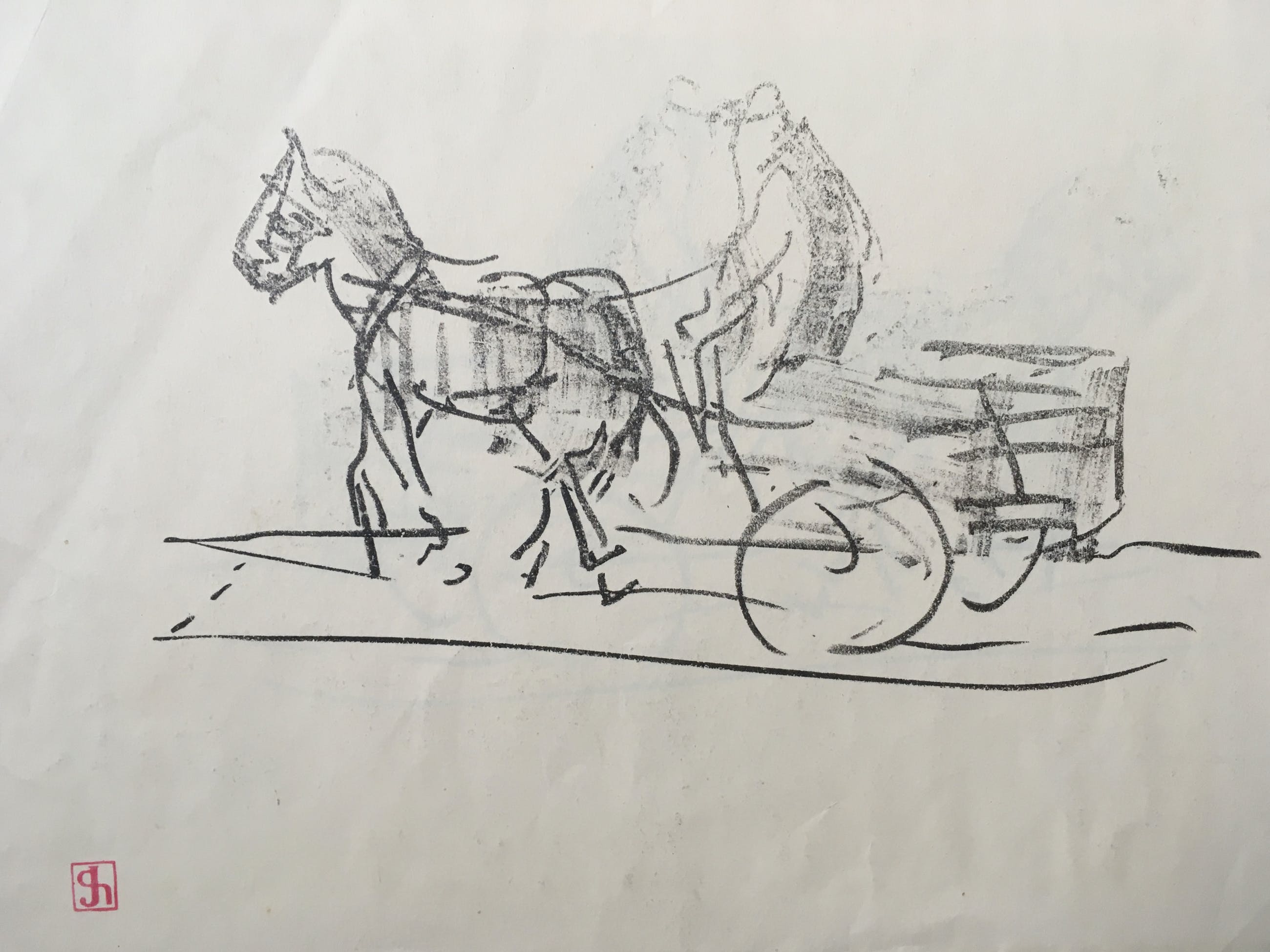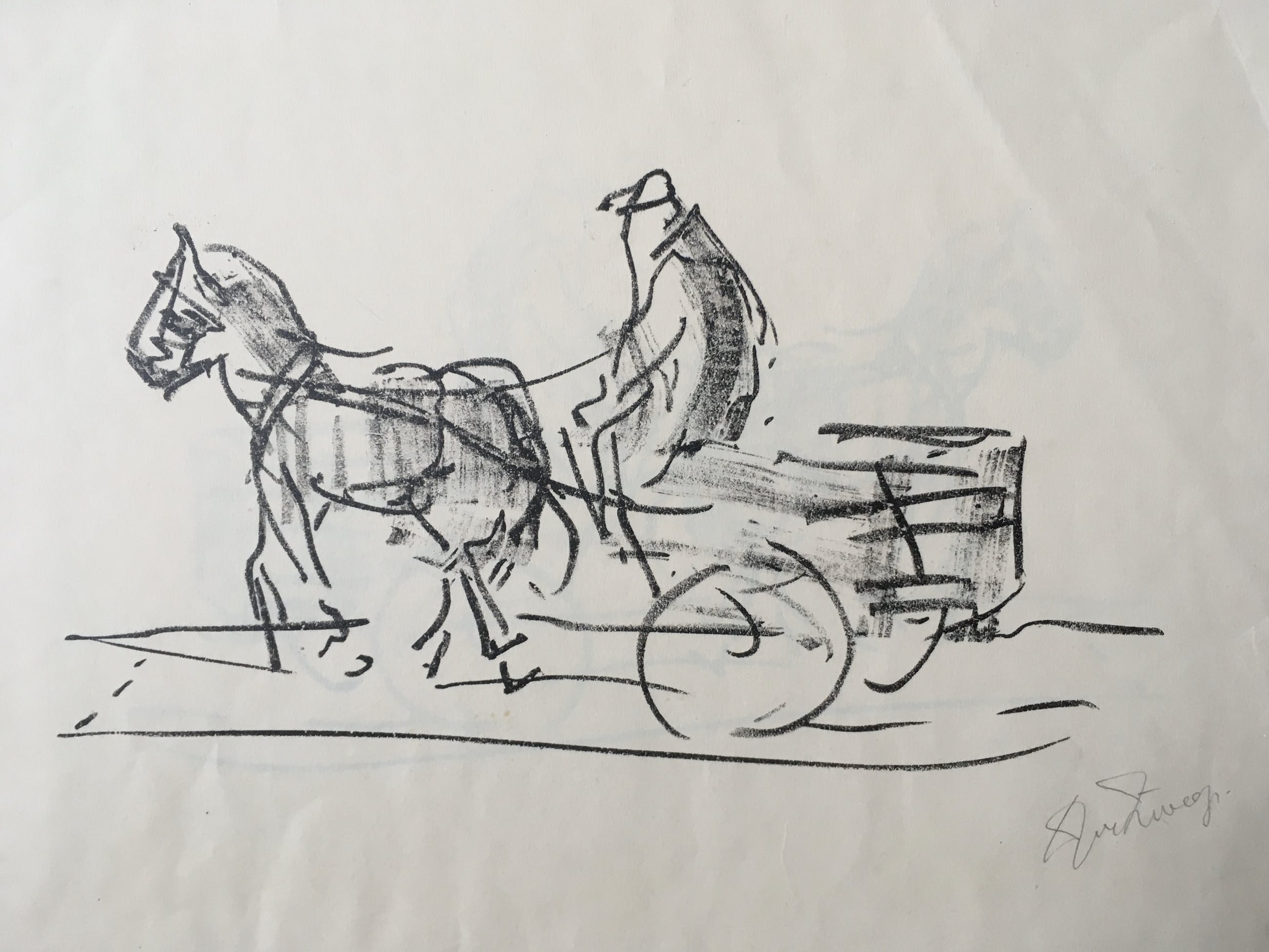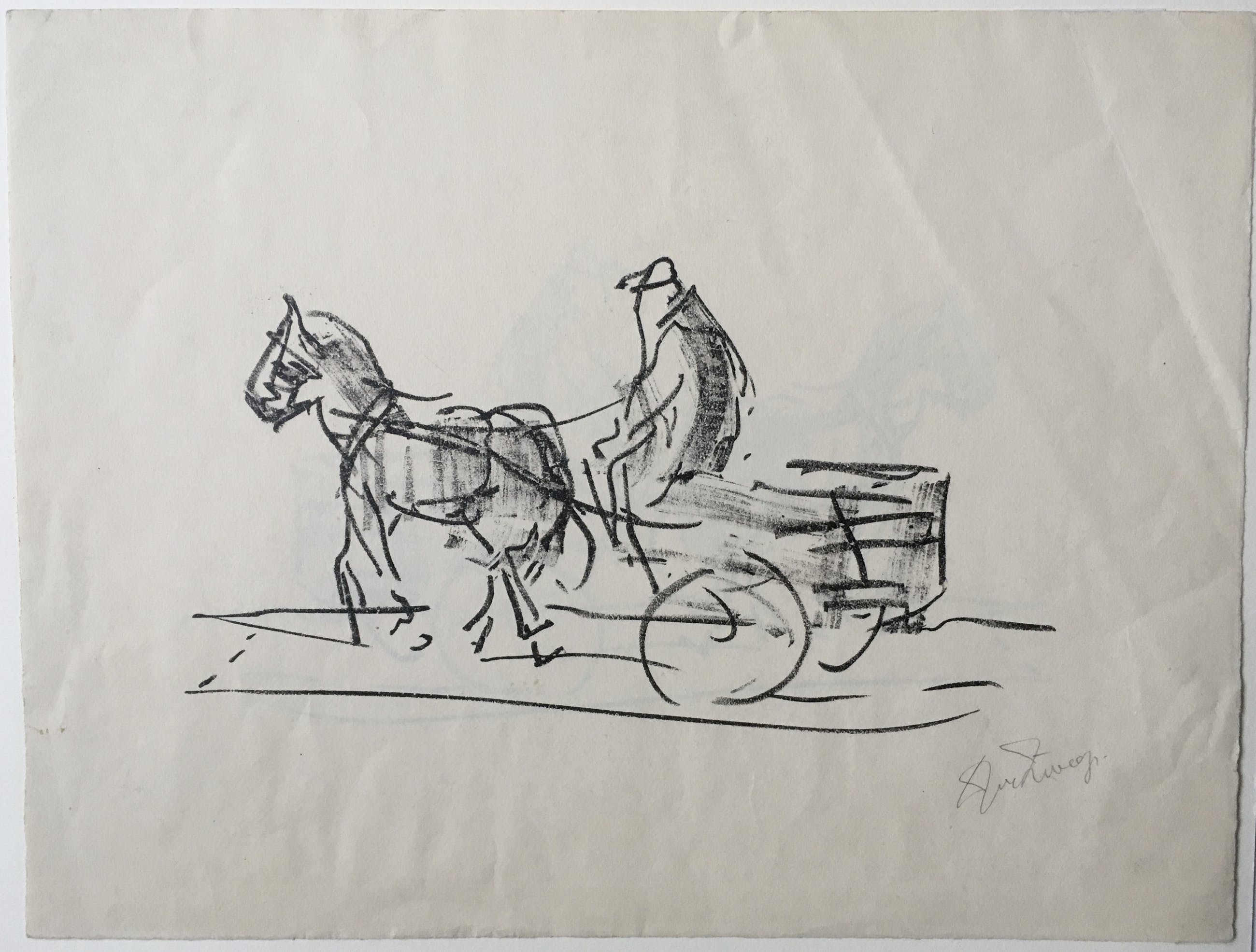 Litho door Douwe Zweep van een man op een kleine kar en een paard. Gesigneerd in potlood rechtsonder. Op de achterzijde een proefdruk van dezelfde litho en een verzameaarsstempel: 'JH".