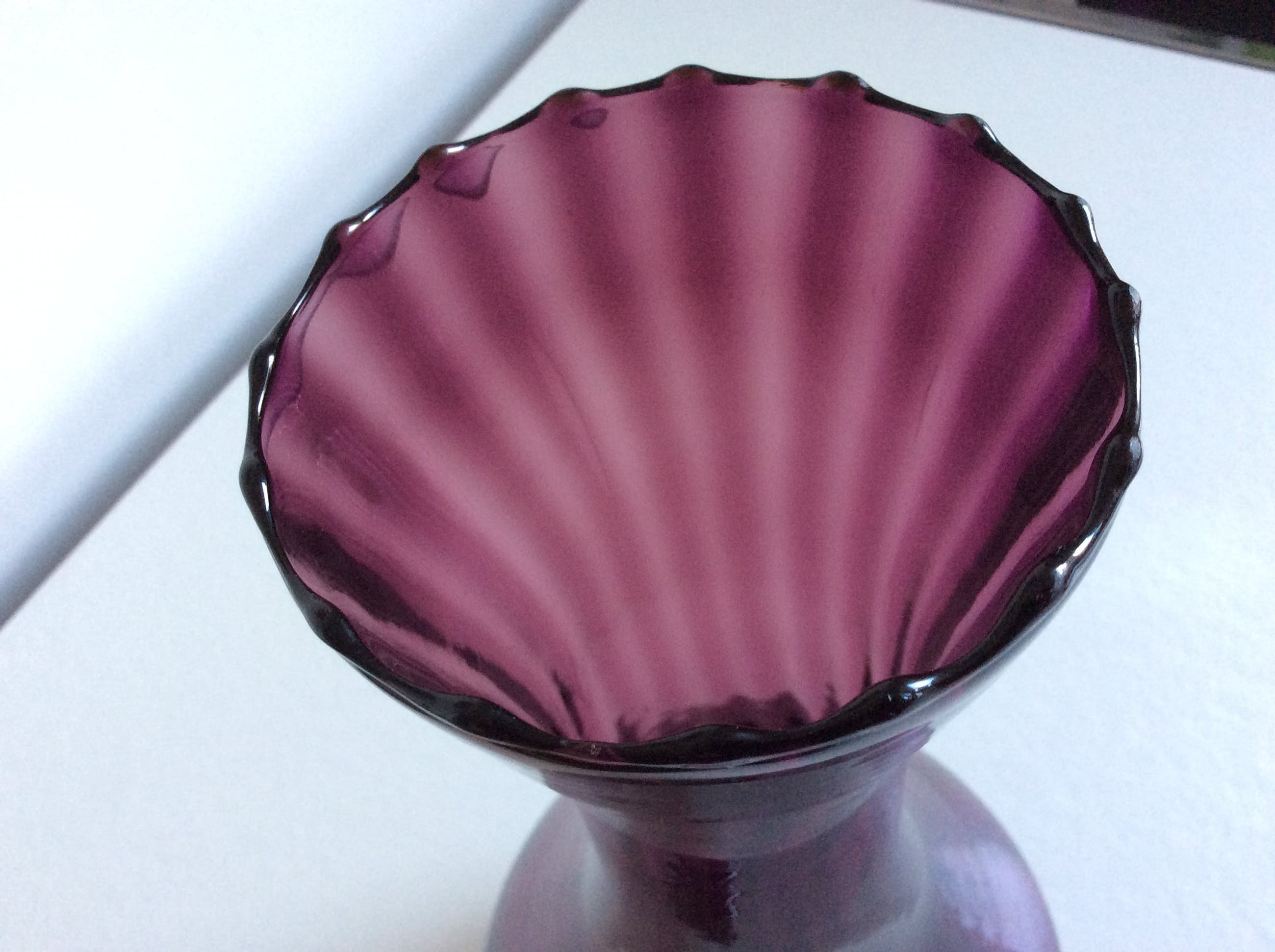 Doyen - grote aubergine kleurige vaas met verticale optiek en kenmerkende gekartelde bovenrand.Hoogte 34 cm, max. doorsnede buik 17 cm. Ca. 1934.Niet gesigneerd zoals gebruikelijk bij dit merk vazen.Lichte waas binnenin, verder mooi glanzend exemplaar.
