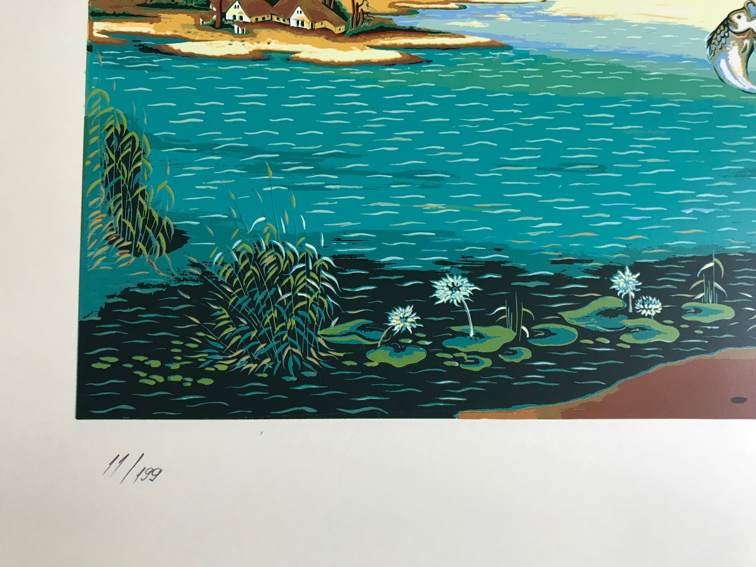 Dit is een mooie gesigneerde zeefdruk van Drago Takac (1948) Uit het atelier van Henk van der Vet. Oplage 13/199 (nummering kan afwijken op de foto) Gesigneerd en genummerd door de kunstenaar. Tevens droogstempel. Afmeting blad: 85x62,5cm Afmeting werk: 65x40cm Nooit ingelijst geweest Uitstekende staat