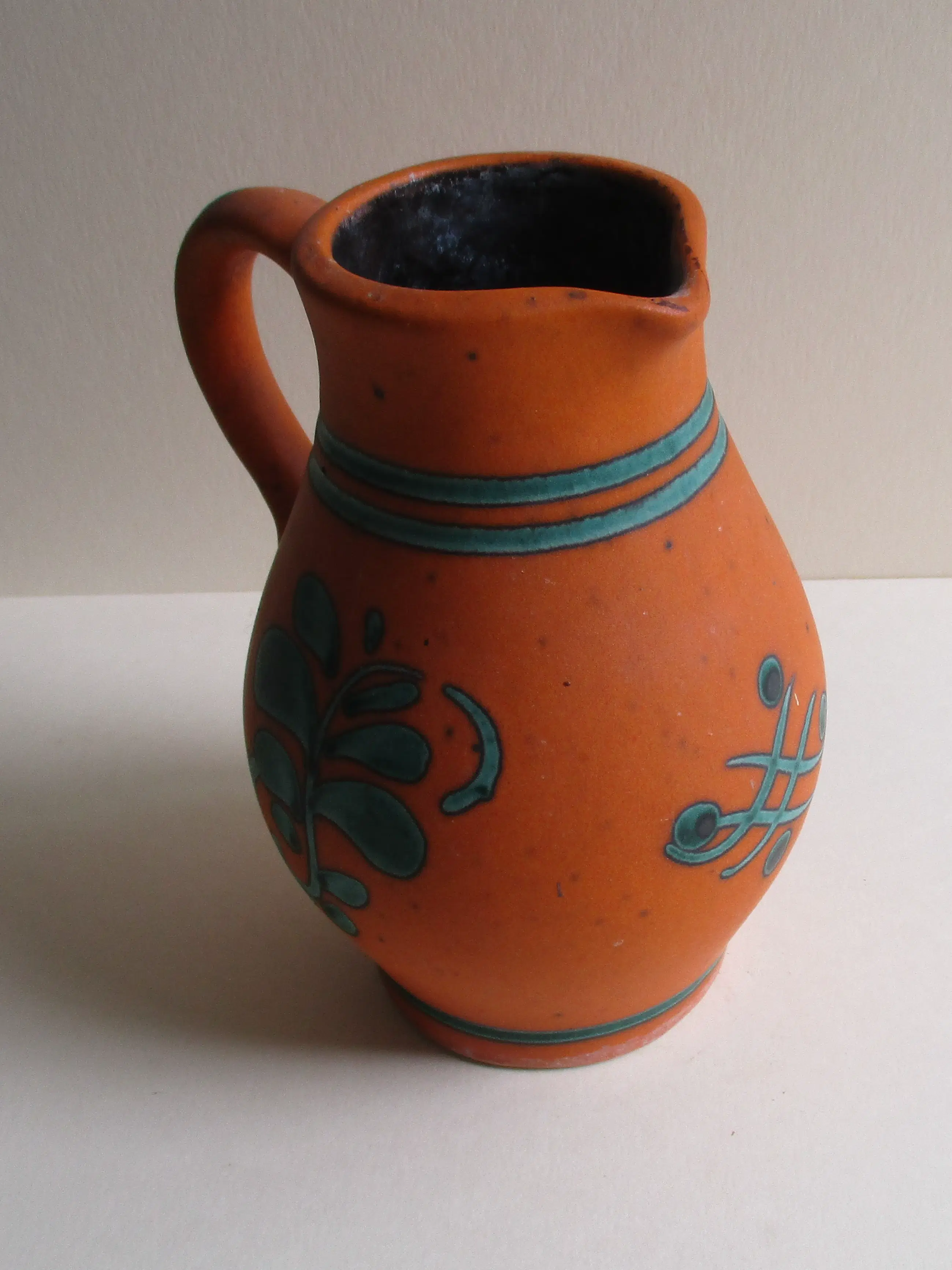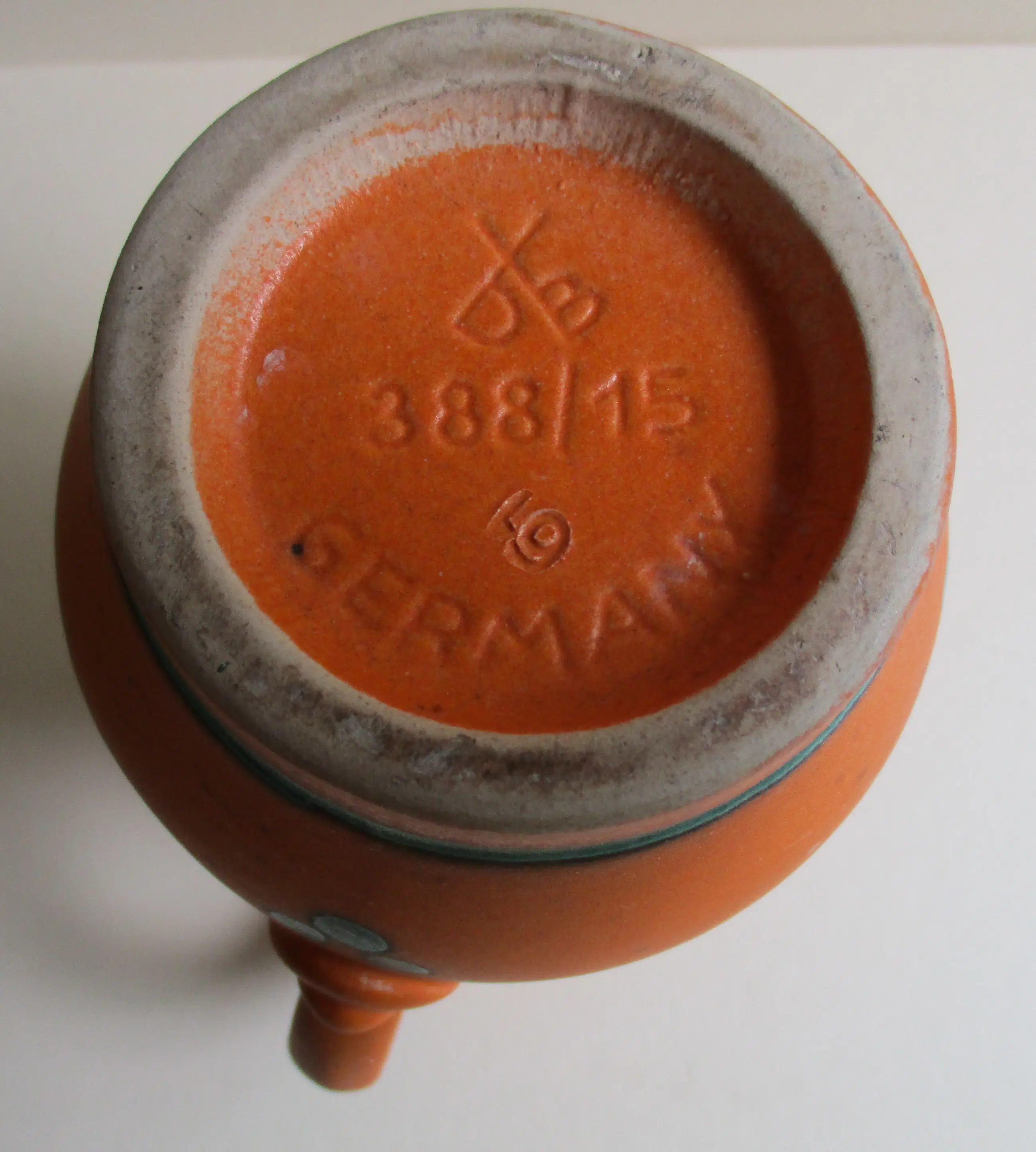 Mooi vaasje met groen floraal motief op oranje ondergrond De oranje ondergrond heeft enkele zwarte vlekjes.