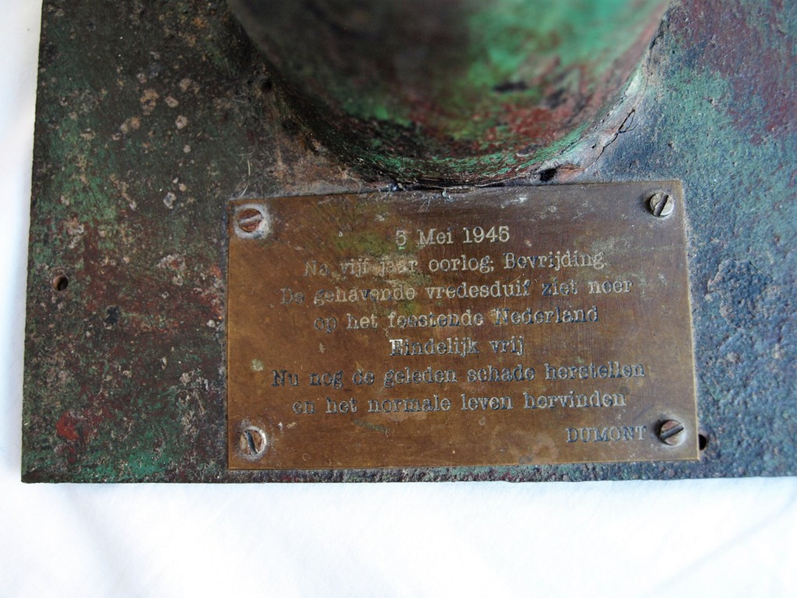 -De vredesduif is gezeten op een huls van een kanonskogel uit de 2e Wereldoorlog en het beeld heeft op de voet een gedenkplaat met de volgende tekst: