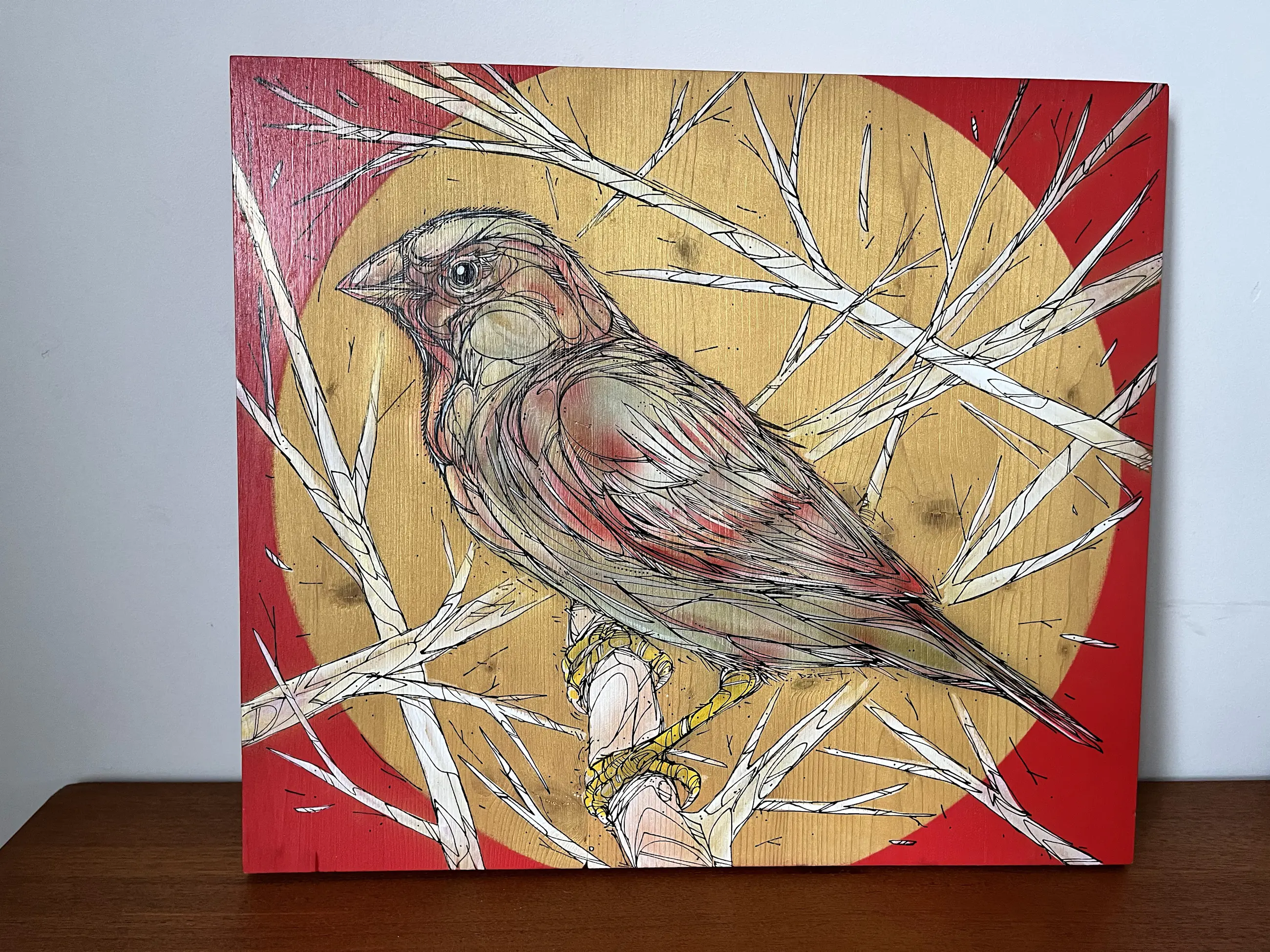 Kunstwerk van de Belgische street artist DZIA. DZIA staat bekend om zijn kleurrijke en gedetailleerde muurschilderingen van dieren. Dit kunstwerk toont een prachtige, gedetailleerde vogel die zich verschuilt tussen de takken van een boom. De vogel is afgebeeld in felle kleuren die contrasteren met de natuurlijke achtergrond. Het lijkt bijna alsof de vogel gemaakt is van glas in lood, met zijn lichaam opgebouwd uit geometrische vormen die naadloos in elkaar overlopen. DZIA's vaardigheden als kunstenaar zijn te zien in de textuur van het werk, met verschillende patronen en details die het dier tot leven brengen.
