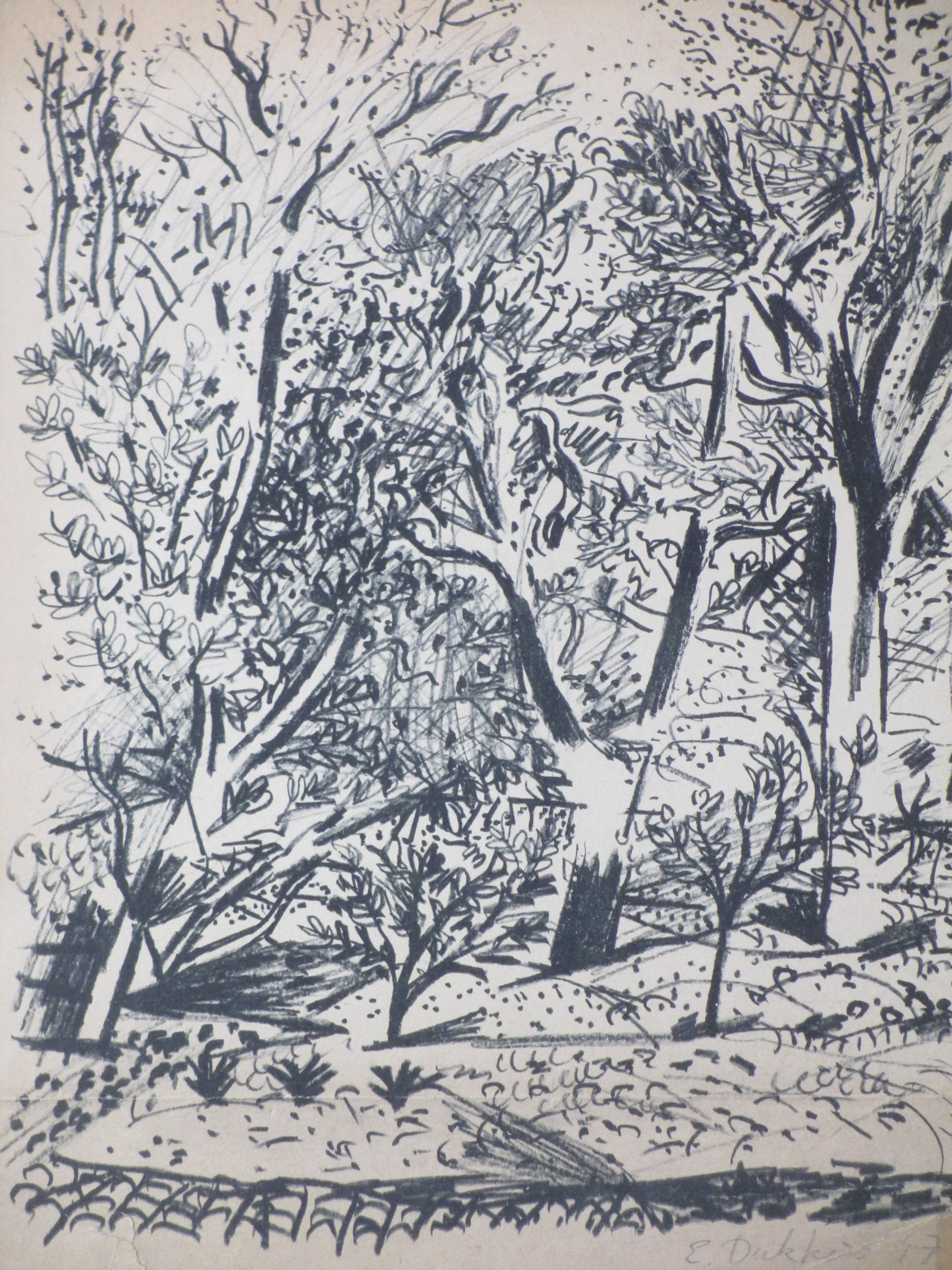 Litho door Ed Dukkers Voorstelling van een bomenrijk landschap Losbladig, beeldmaat 32x24, bladmaat 35x29 Gesigneerd en gedateerd in potlood r.o.: 'E. Dukkers '47' Authenticiteit volledig gegarandeerd Voor conditie zie opmerkingen in kavelinformatie
