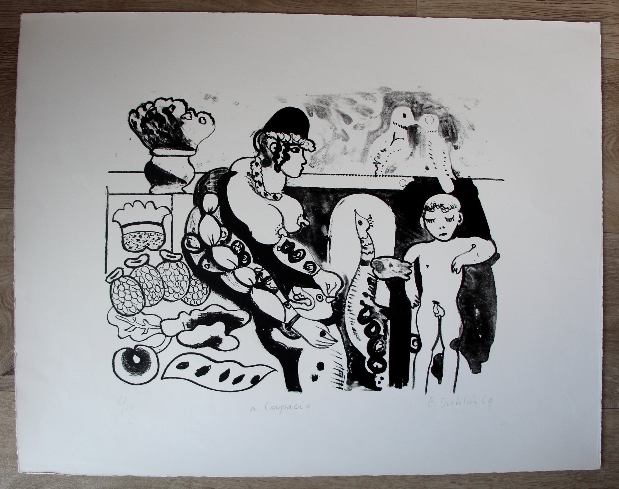 Litho van Ed Dukkers uit 1969. Titel: Carpacio. Afmetingen blad: H41 x b65cm. Afmetingen voorstelling: H34 x b43cm. De authenticiteit van het aangeboden werk wordt volledig gegarandeerd. Een certificaat van echtheid kan, op aanvraag, worden gemaild.