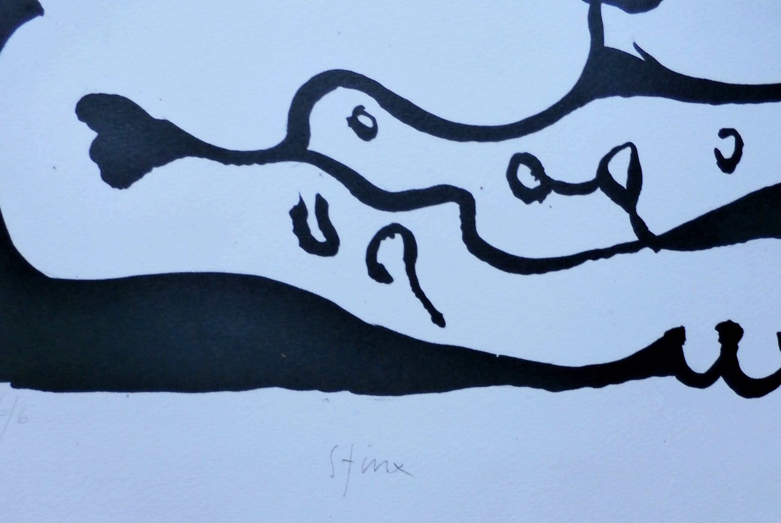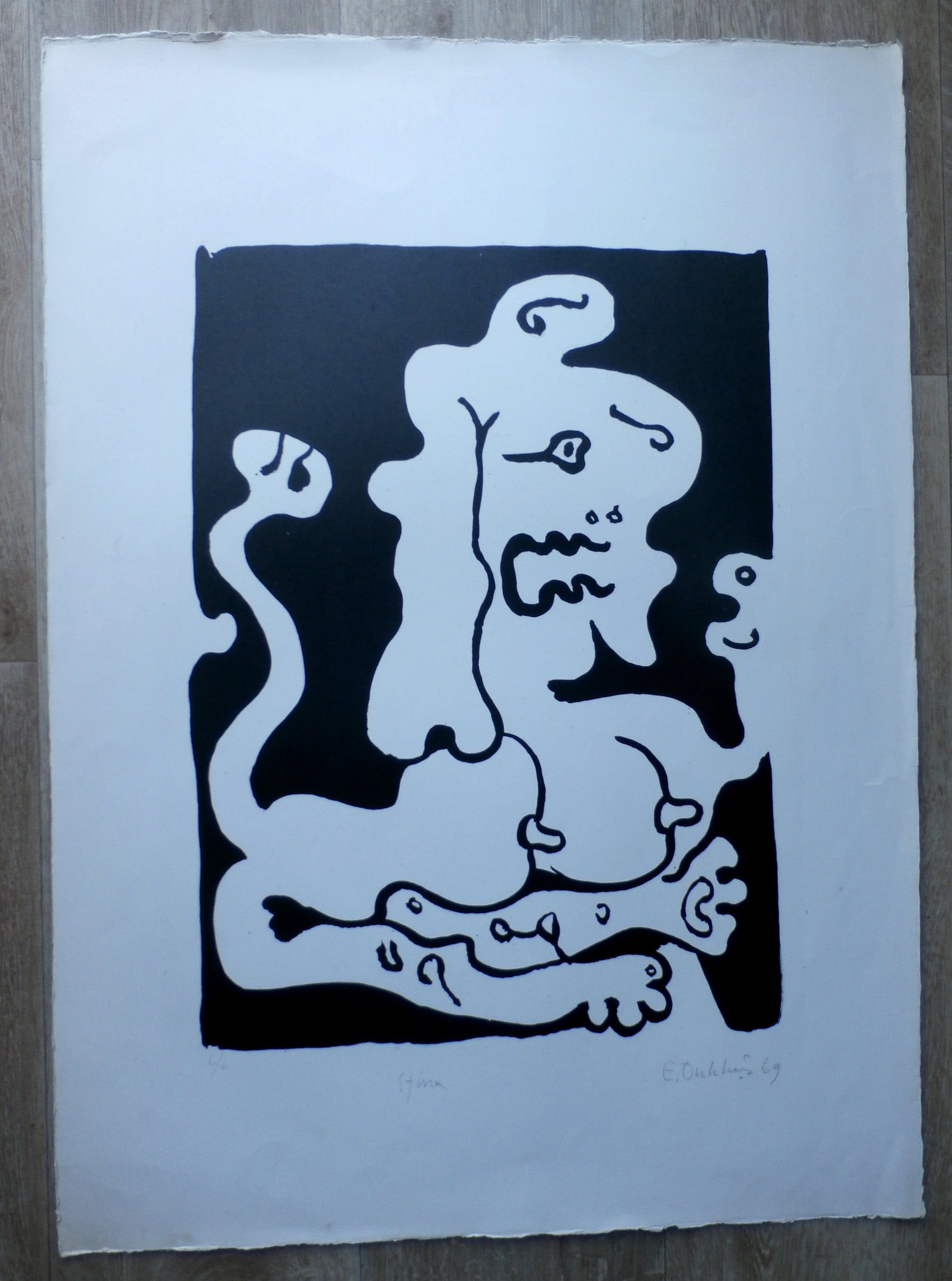 Litho van Ed Dukkers uit 1969. Titel: Sfinx. Nummer: 6/6. Afmetingen blad: H77 x b56,5. Afmetingen voorstelling: H51 x b38 cm. Het werk is rechtsonder gesigneerd door de kunstenaar. De authenticiteit van het aangeboden werk wordt voor 100% gegarandeerd. Een certificaat van echtheid kan, op aanvraag, worden meegestuurd. Conditie: in goede staat. Er zit wat verkleuring langs de randen van een vorige inlijsting. Goed ingelijst valt dit in de lijst/onder de passepartout.