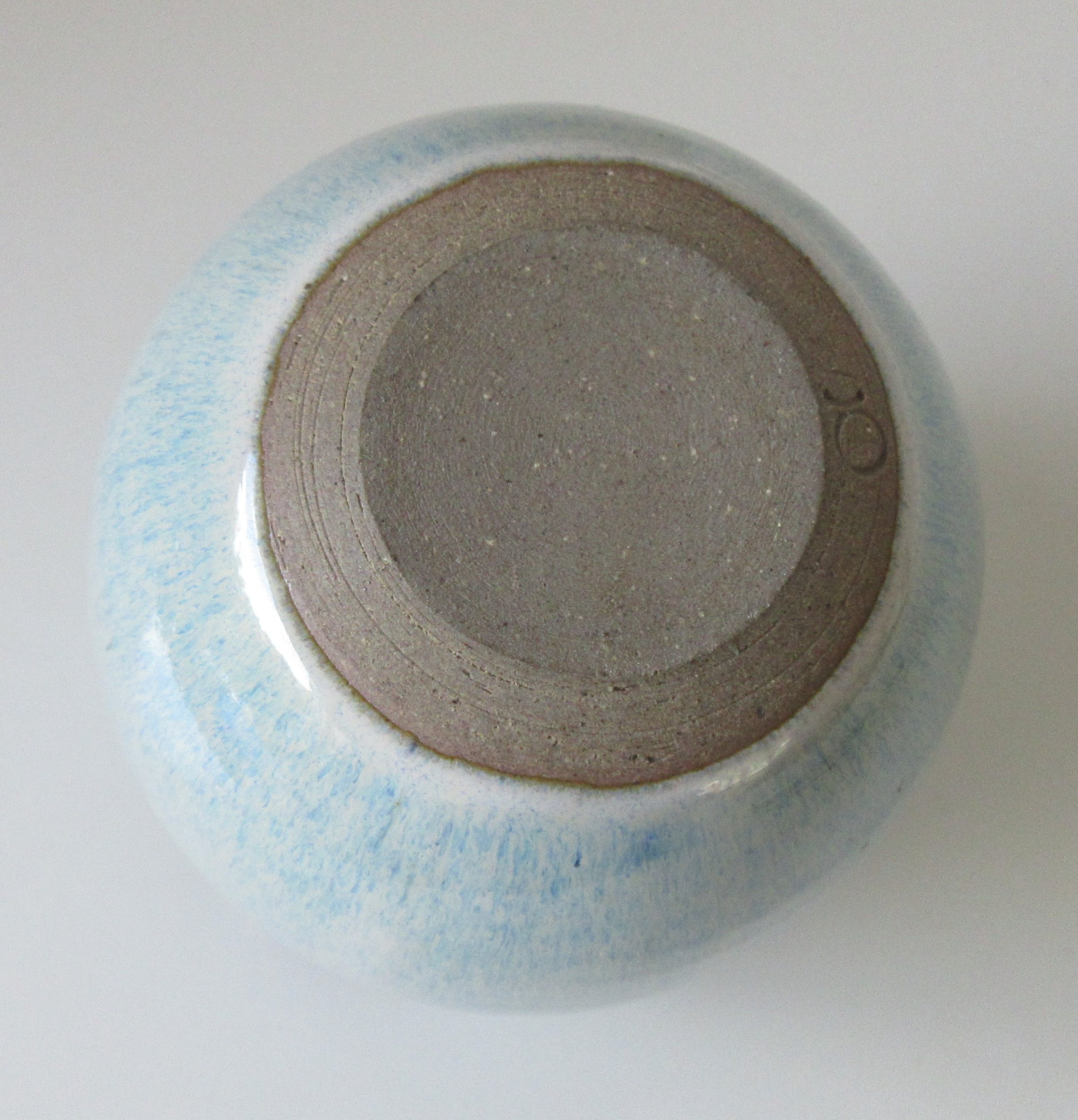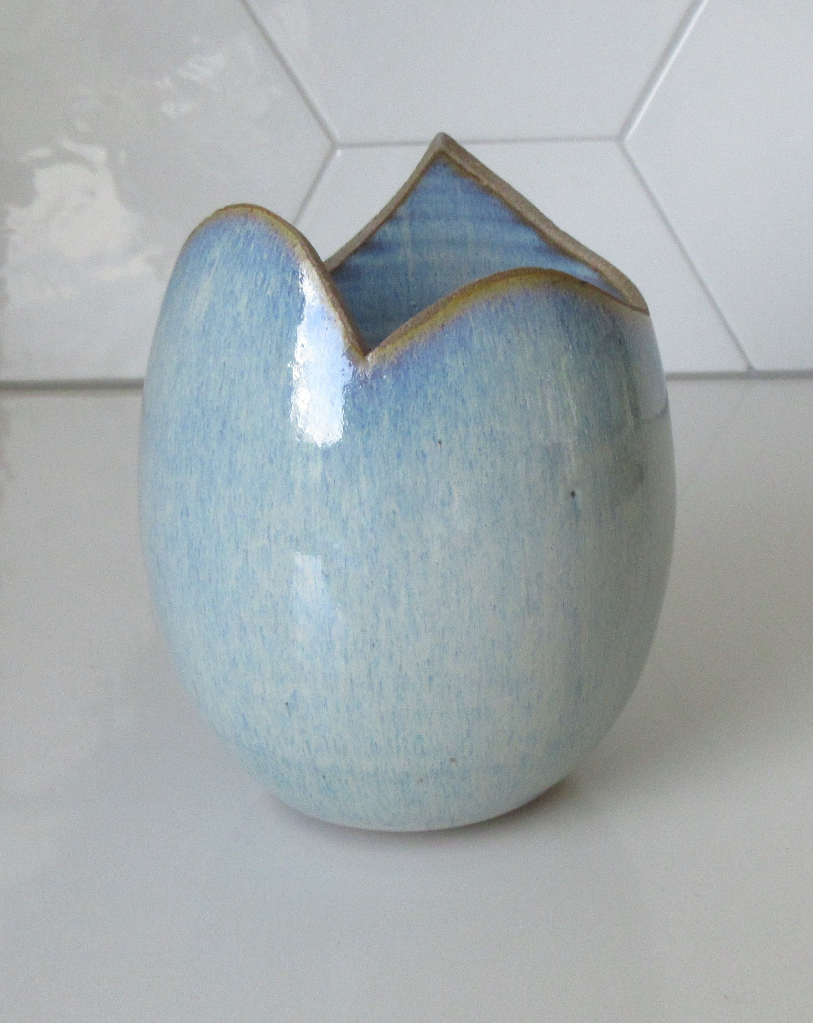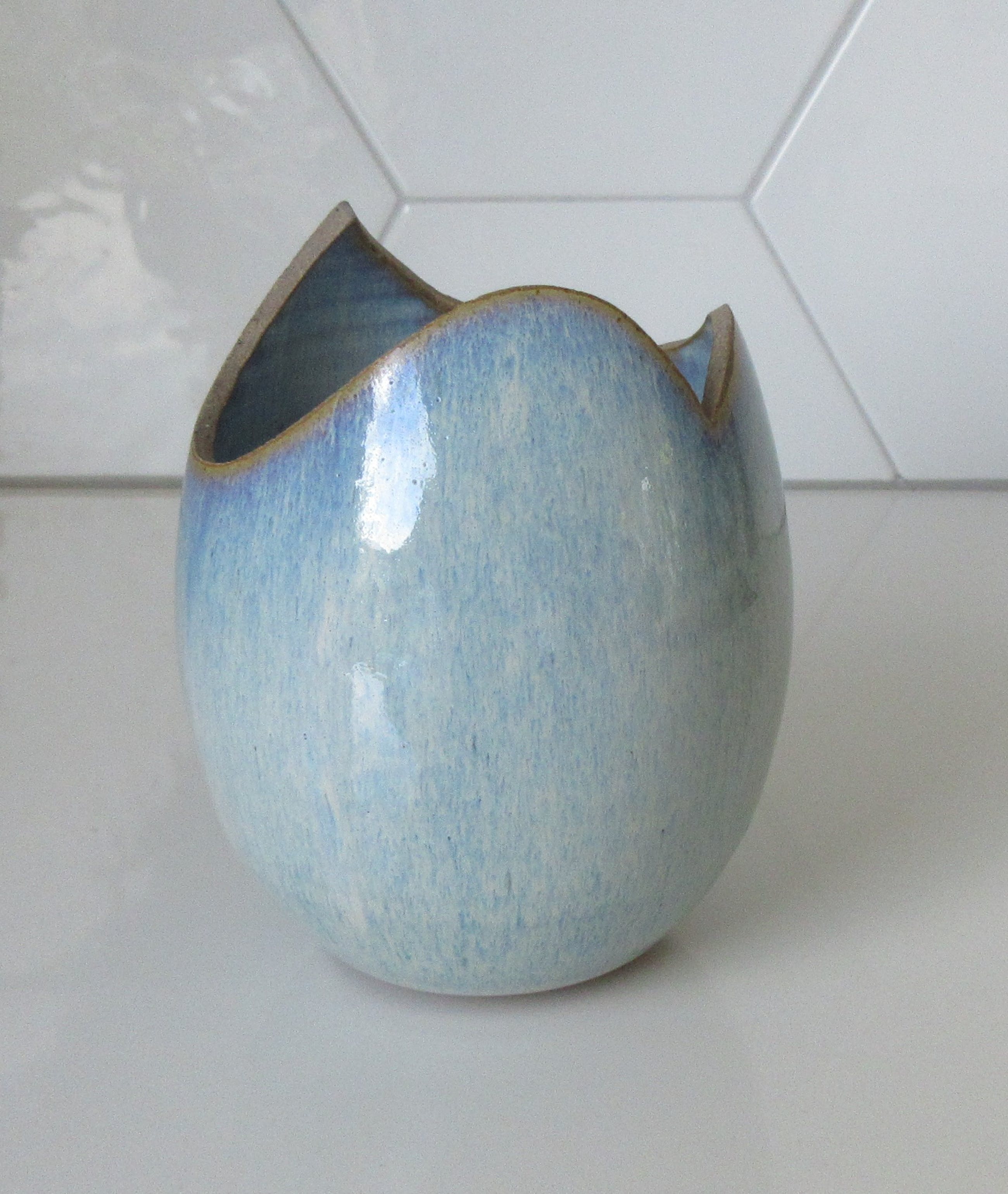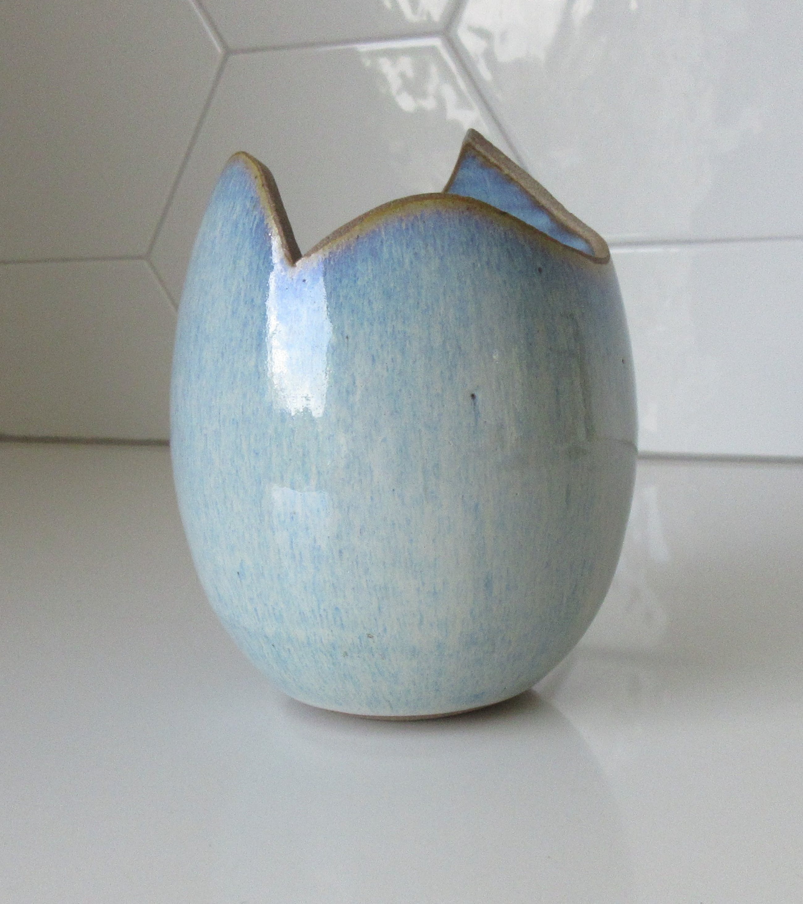 Opengezaagd keramisch vaasje met blauw-lila stroomglazuur van Ed Meissenberg uit Den Bosch, uitgevoerd in eigen atelier. Het vaasje het een beetje een ei-vorm waardoor het een open getikt eitje lijkt. Aan de onderzijde voorzien van de monogram van Ed Meissenberg.
